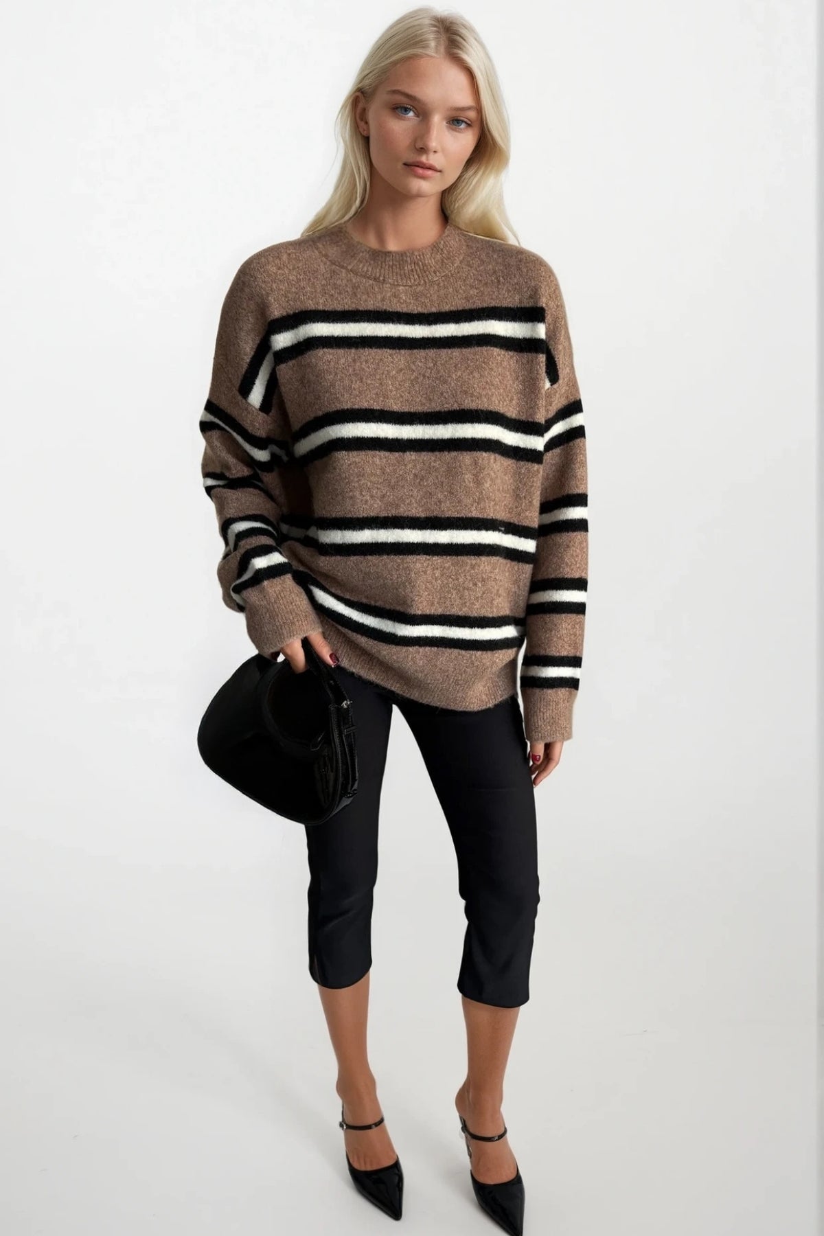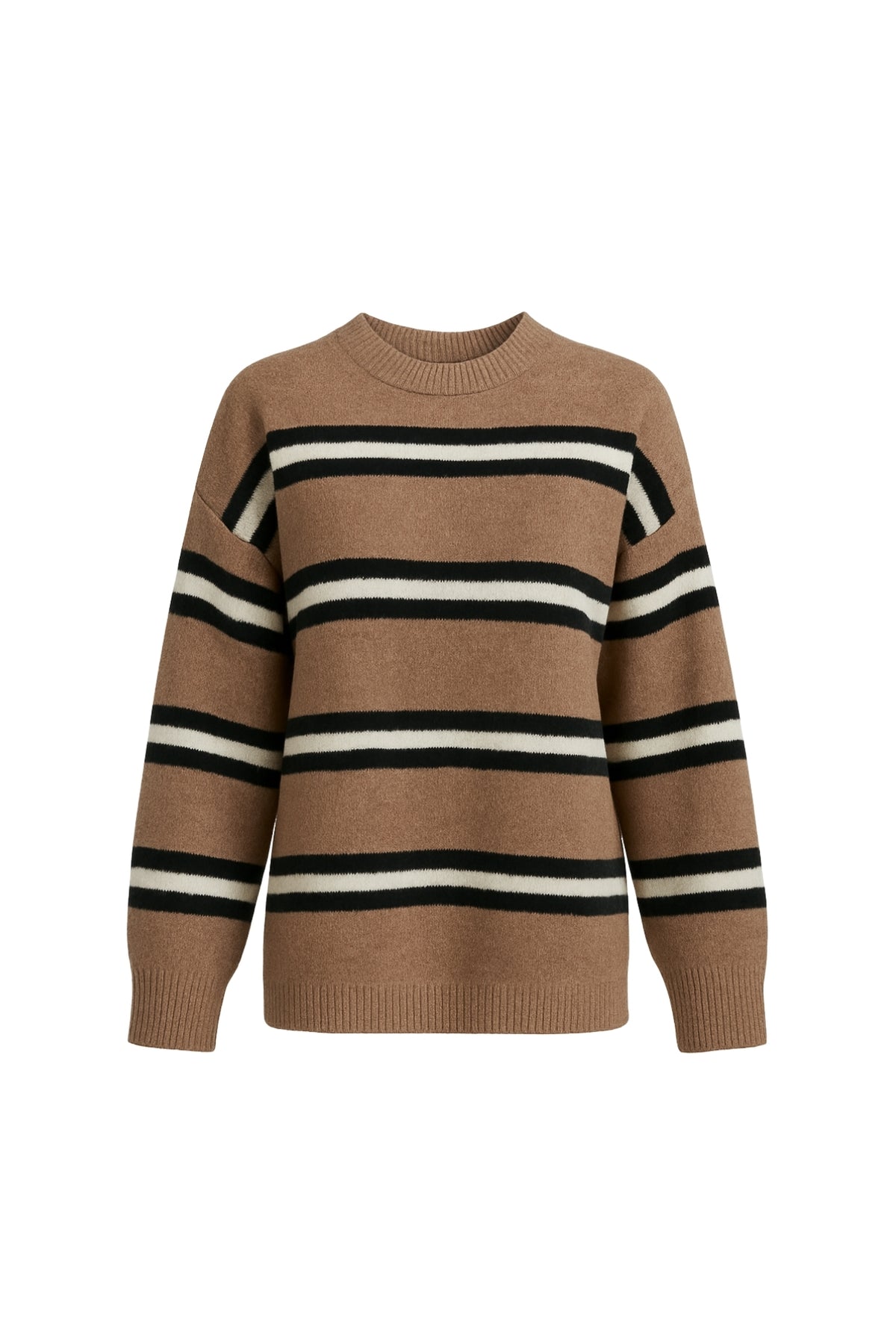Çizgili Bisiklet Yaka Oversize Vizon Triko Kazak