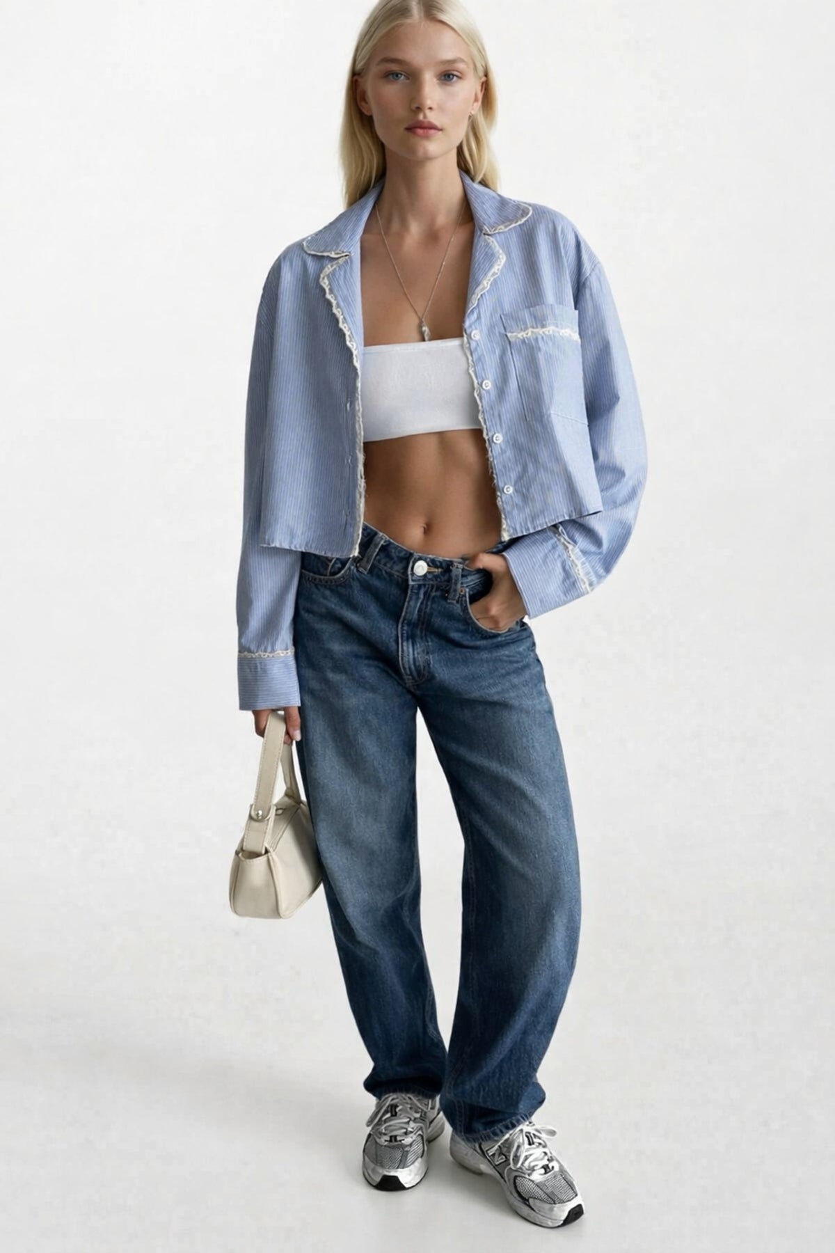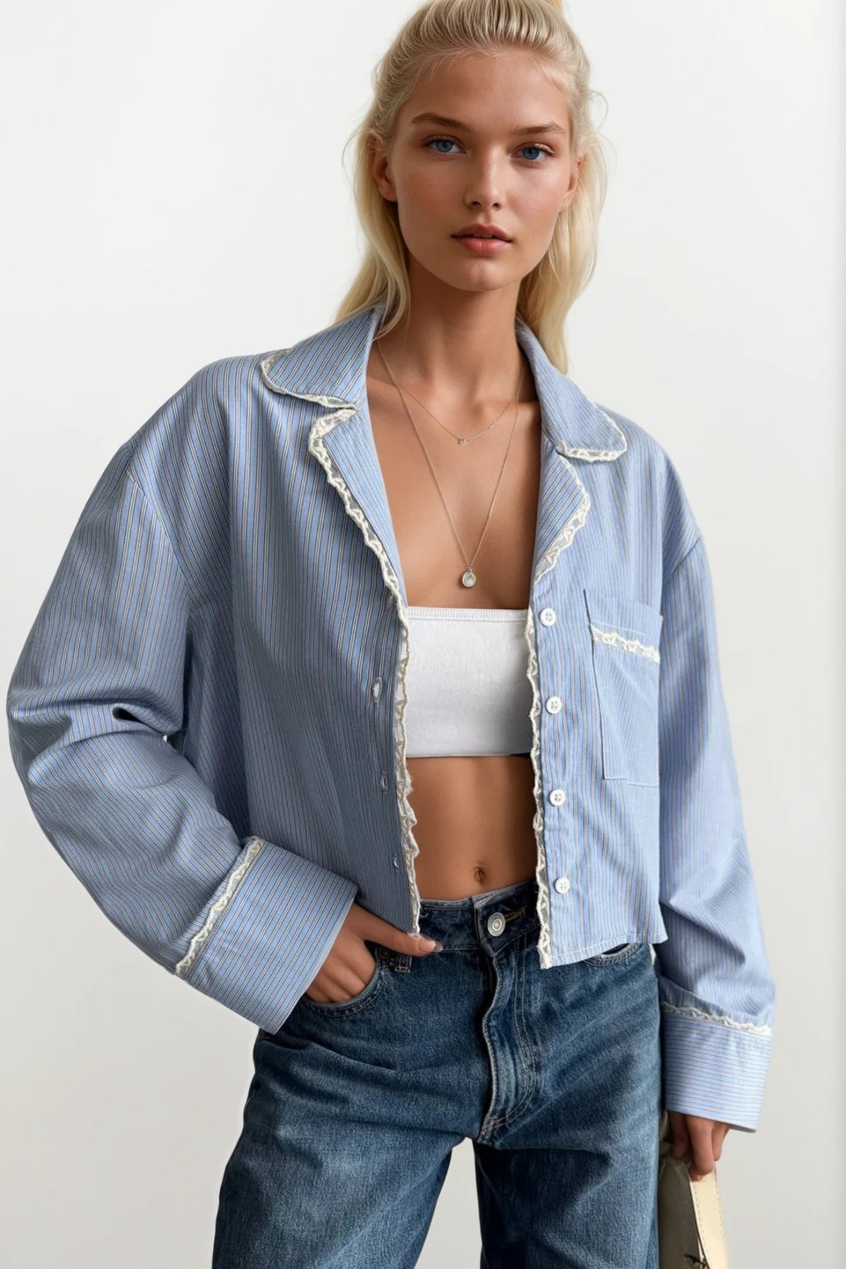 Çizgili Cep Detay Crop Mavi Gömlek