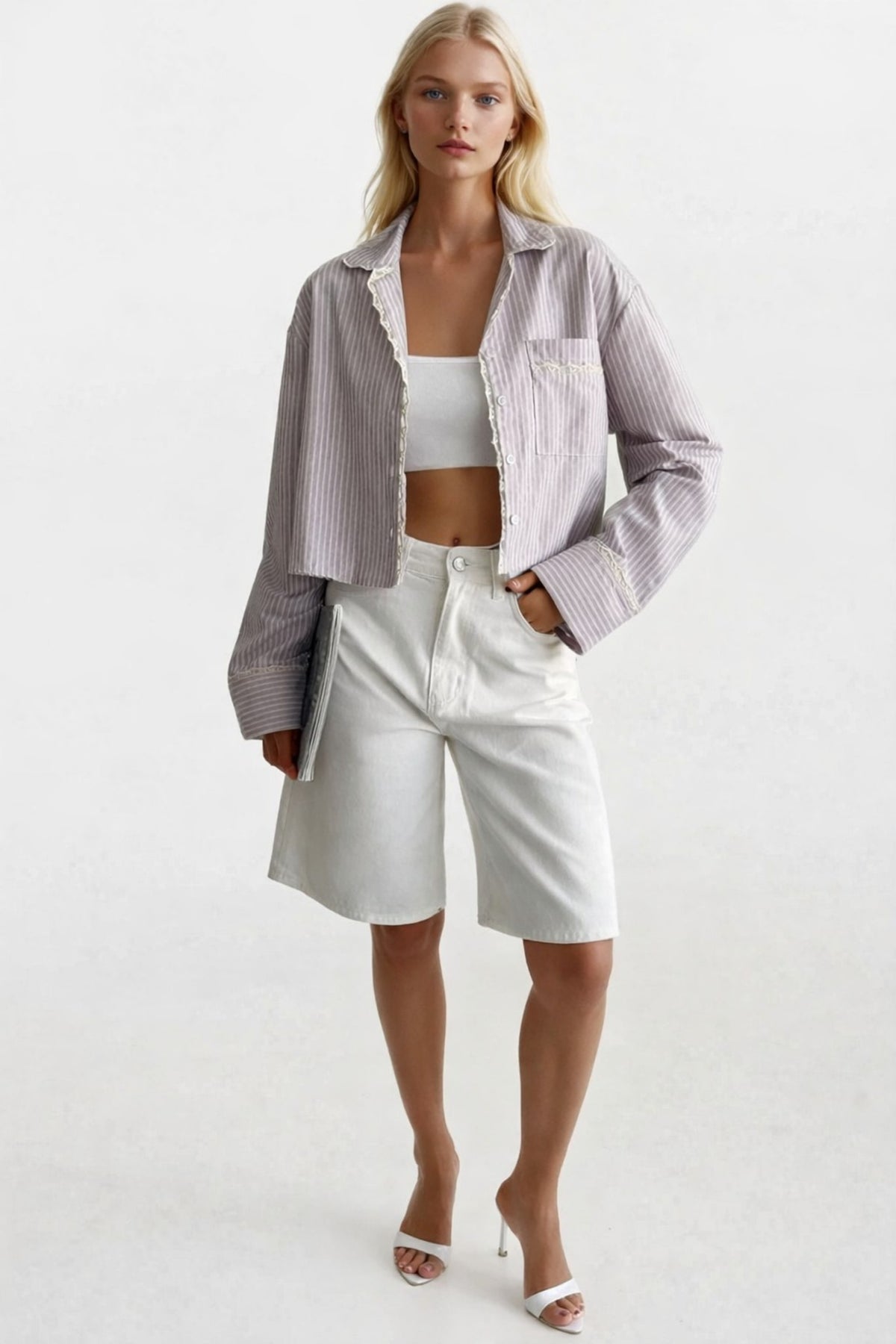 Dantel İşlemeli, Önü Cepli, Pamuklu Kumaş Crop Gömlek