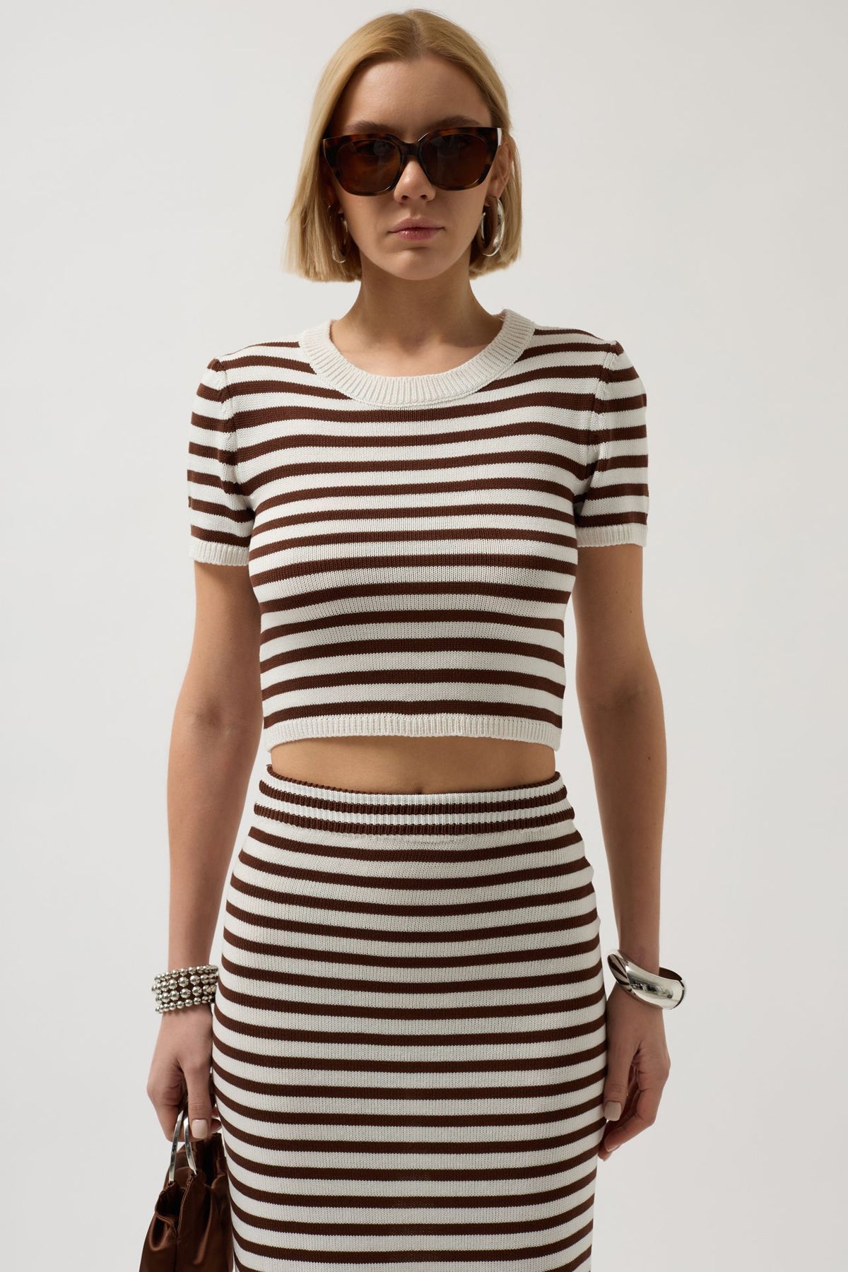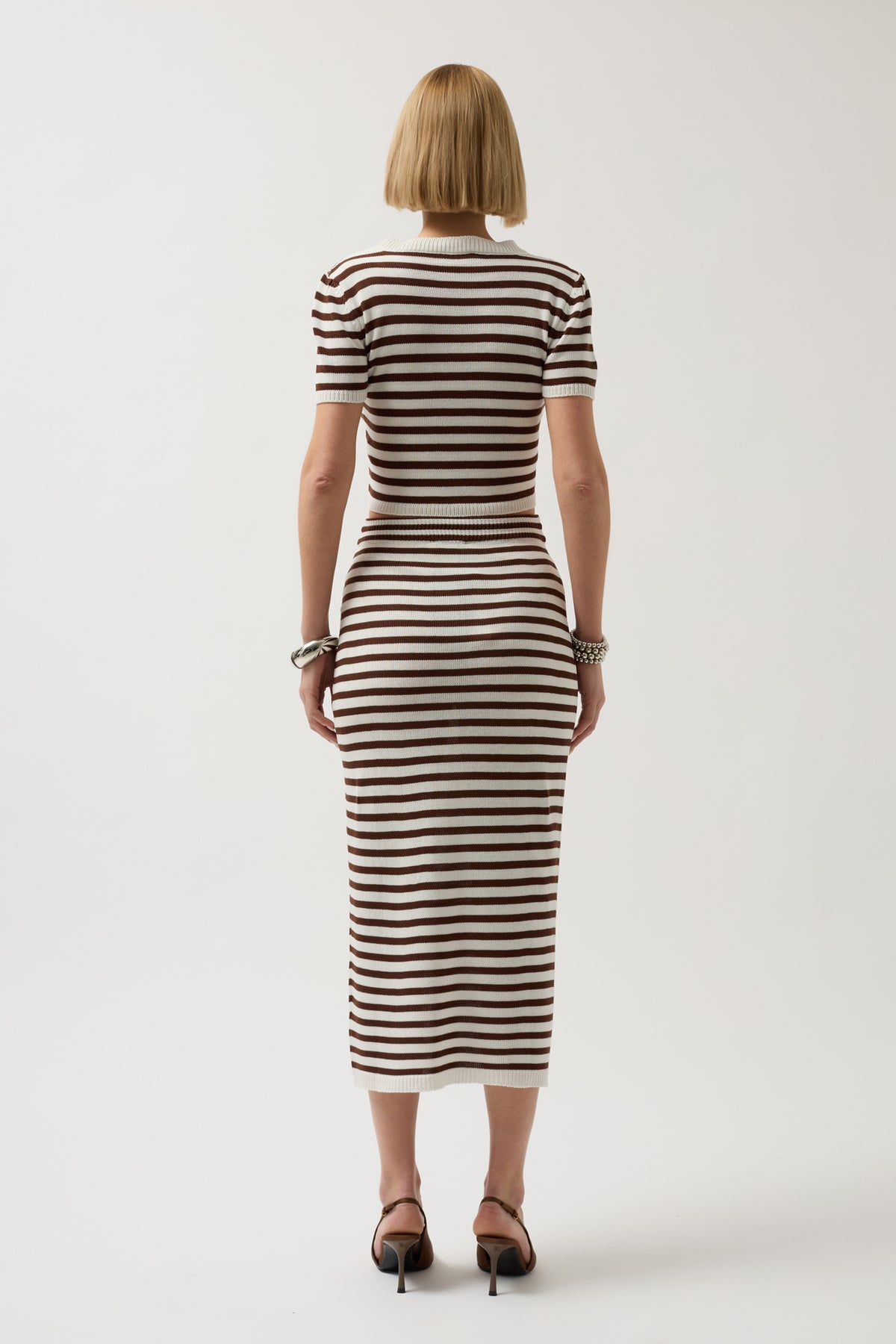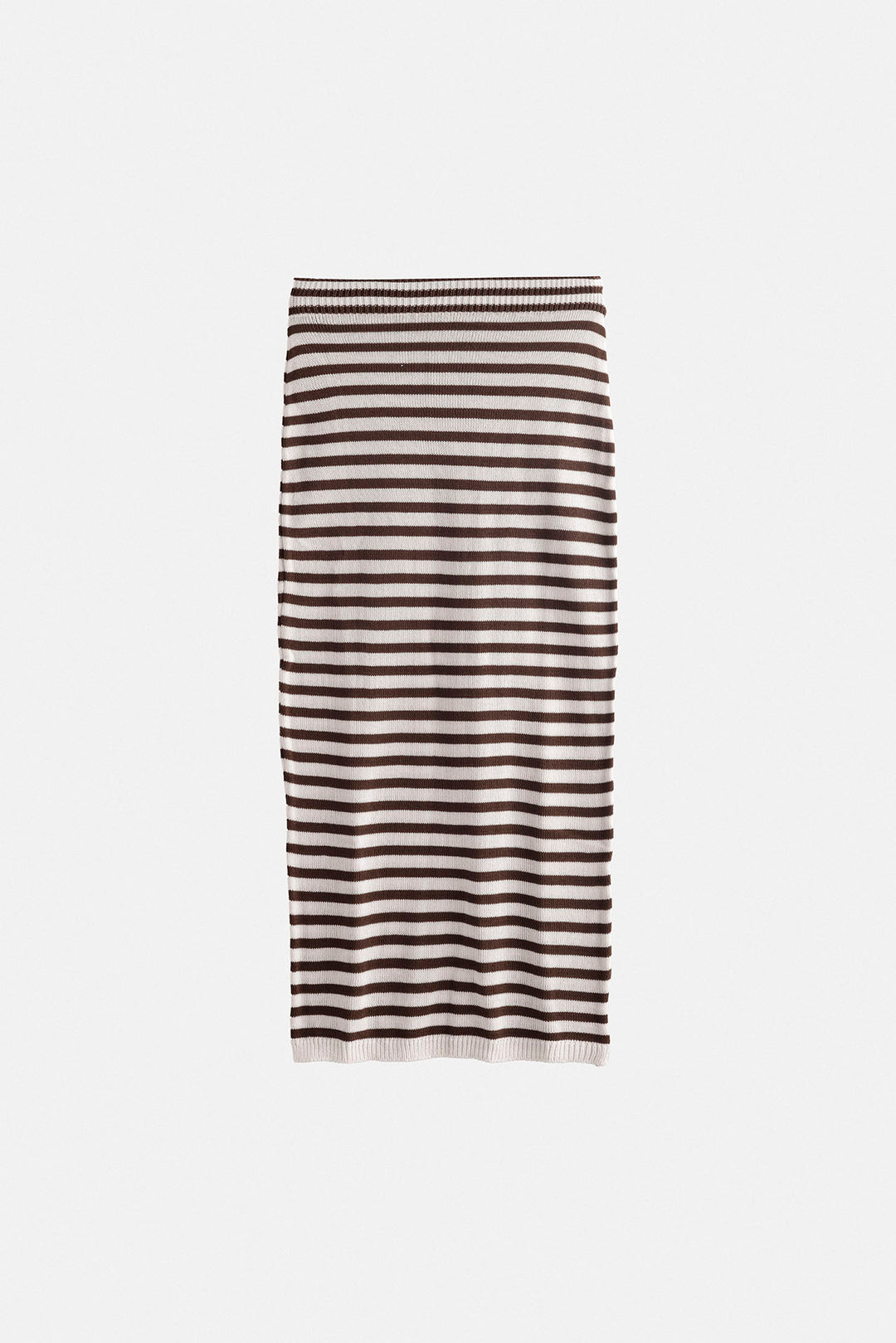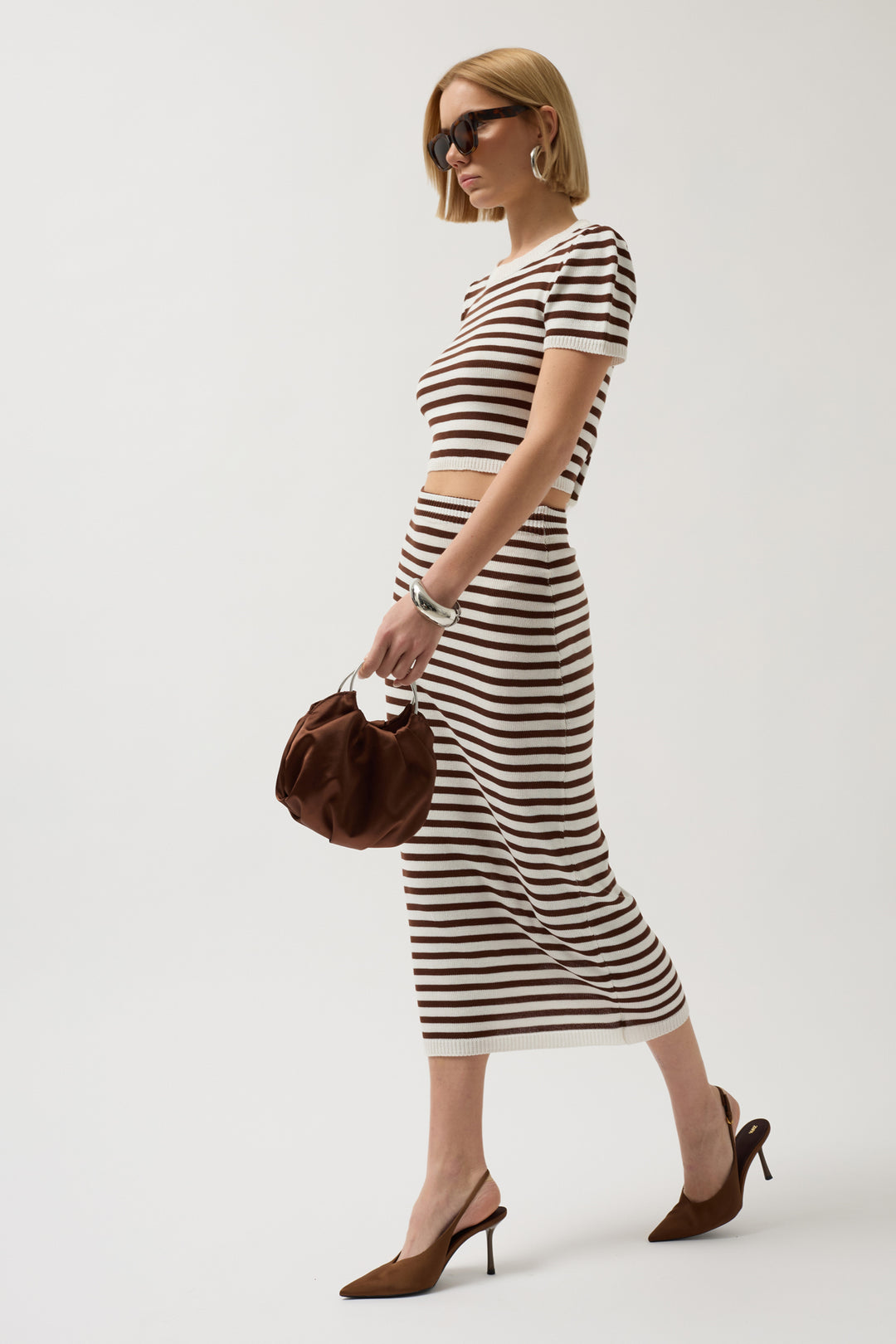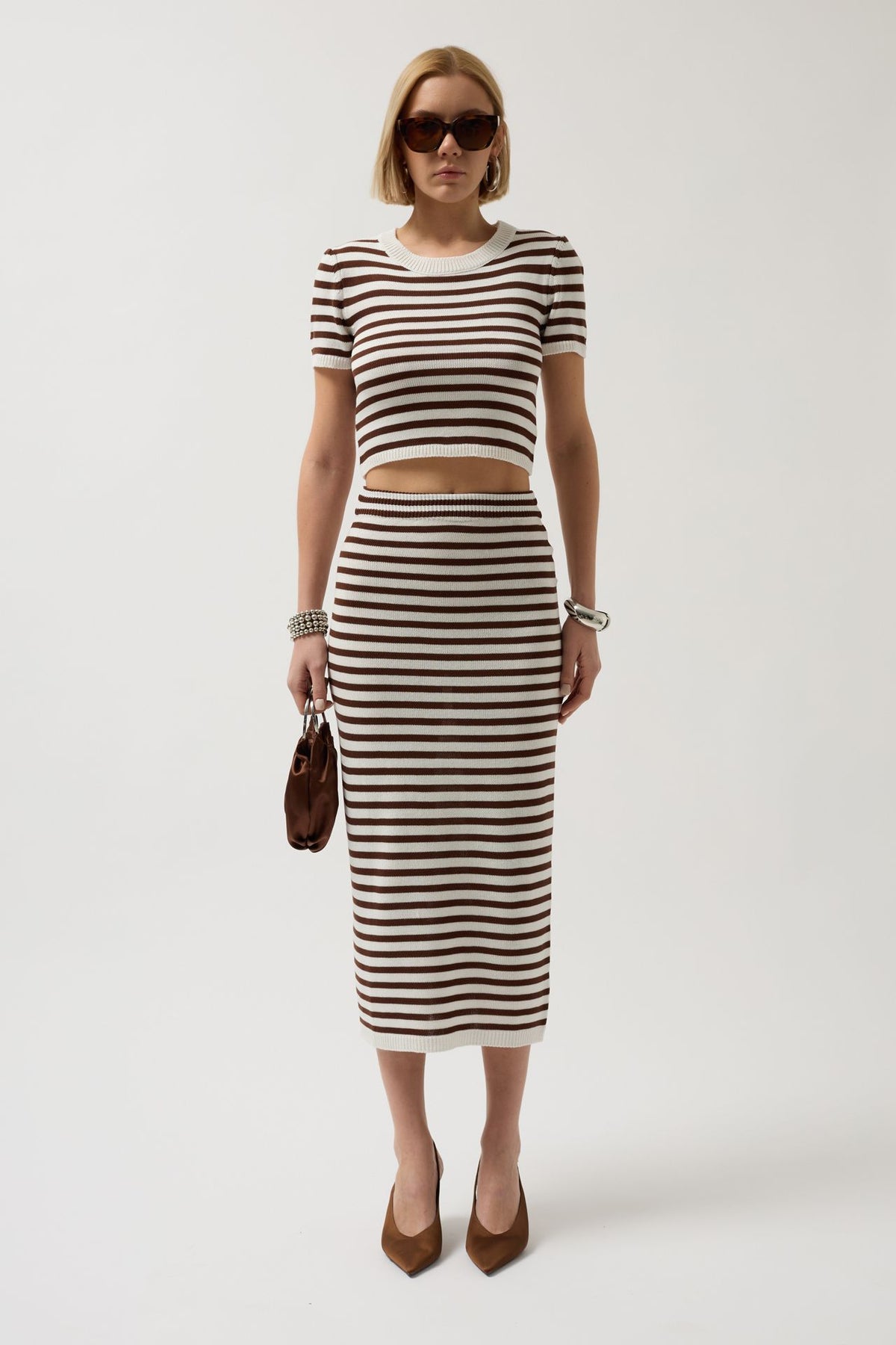 Çizgili Midi Dokulu Beyaz-Kahverengi Etek