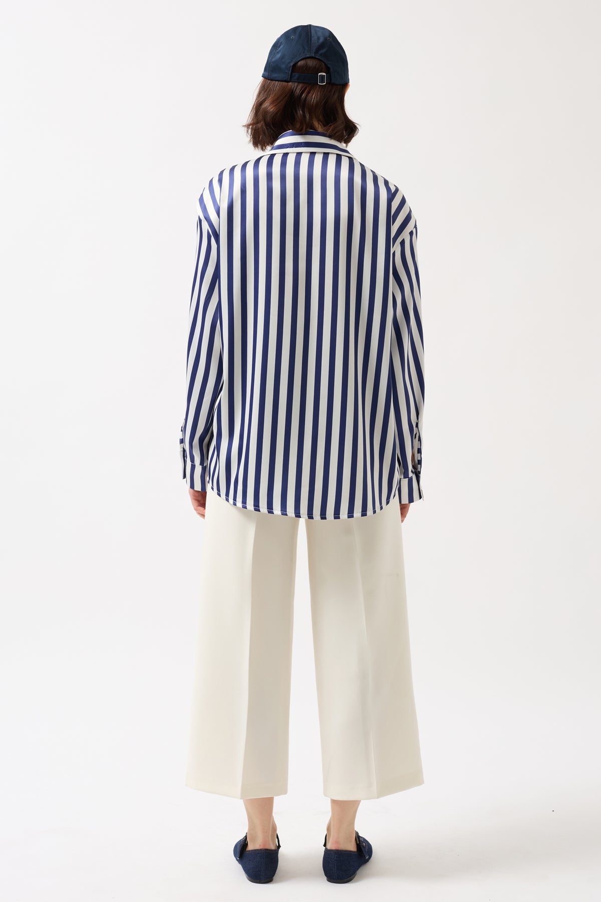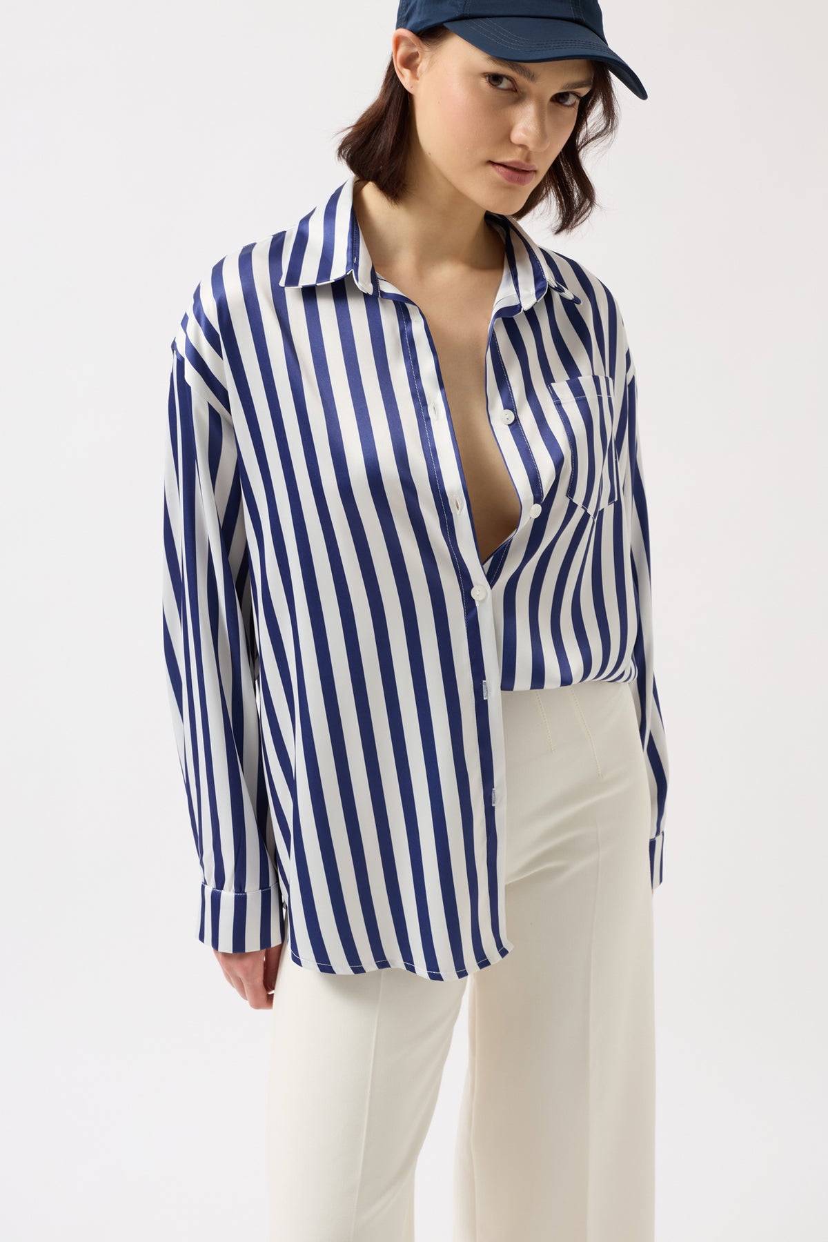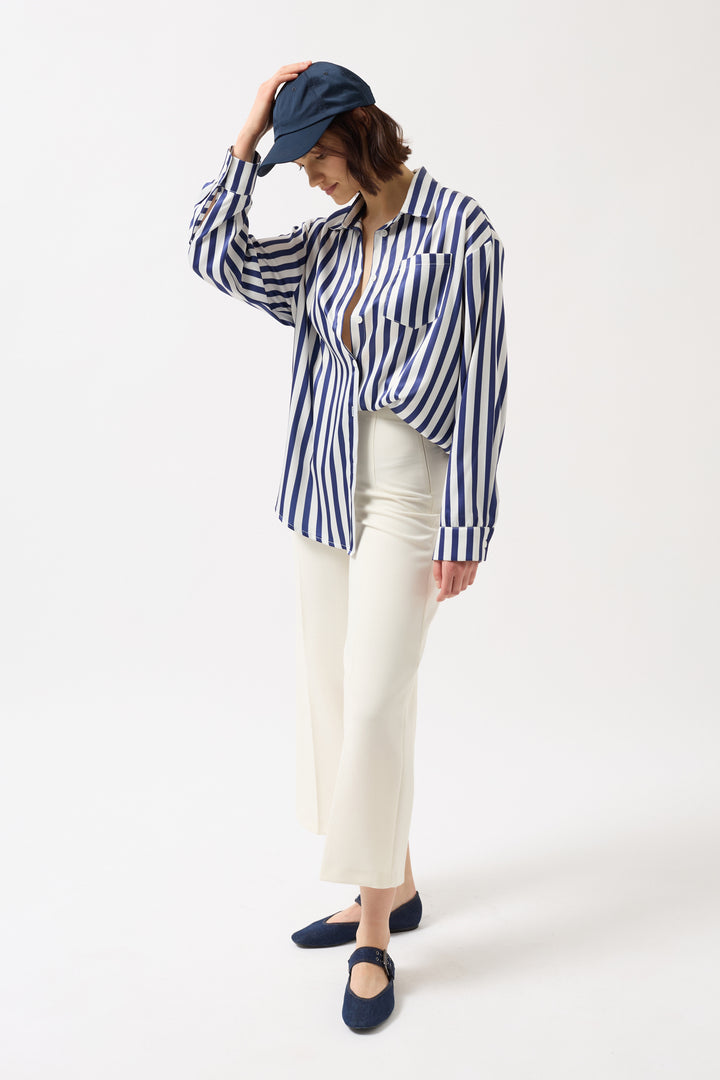 Çizgili Saten Lacivert Gömlek