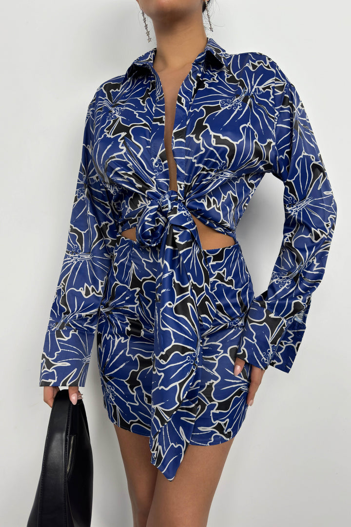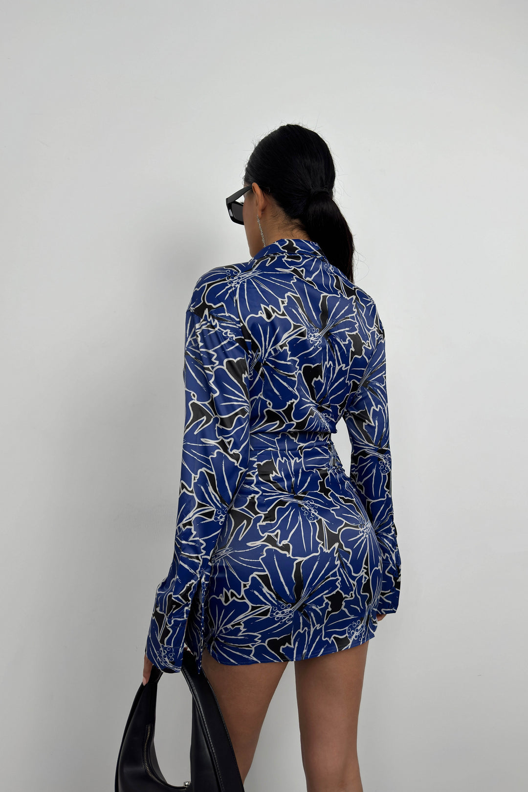 Desenli Kumaş, Bağlama Detaylı, Uzun Kollu, Gömlek Yaka, Manşetli, Mini Elbise