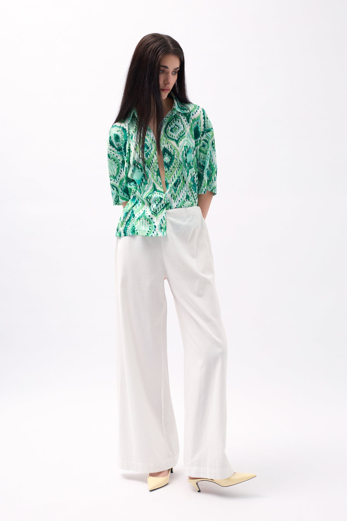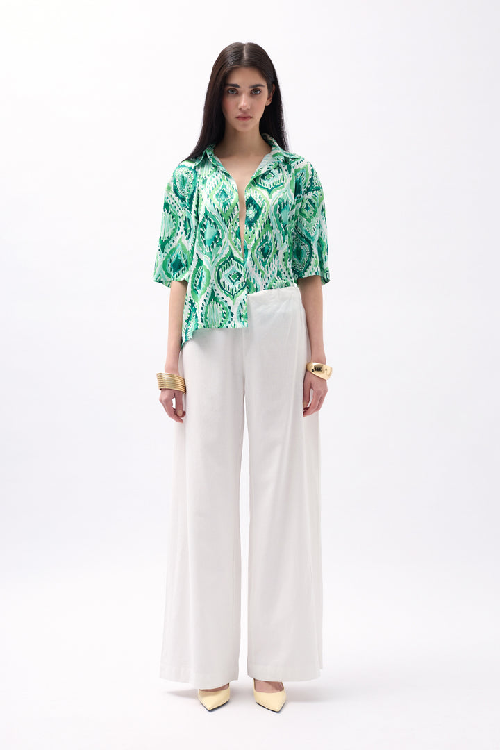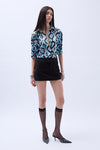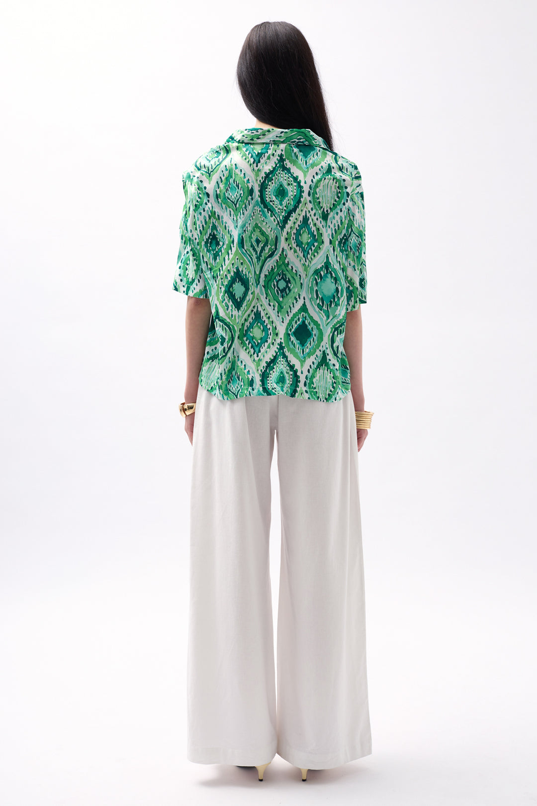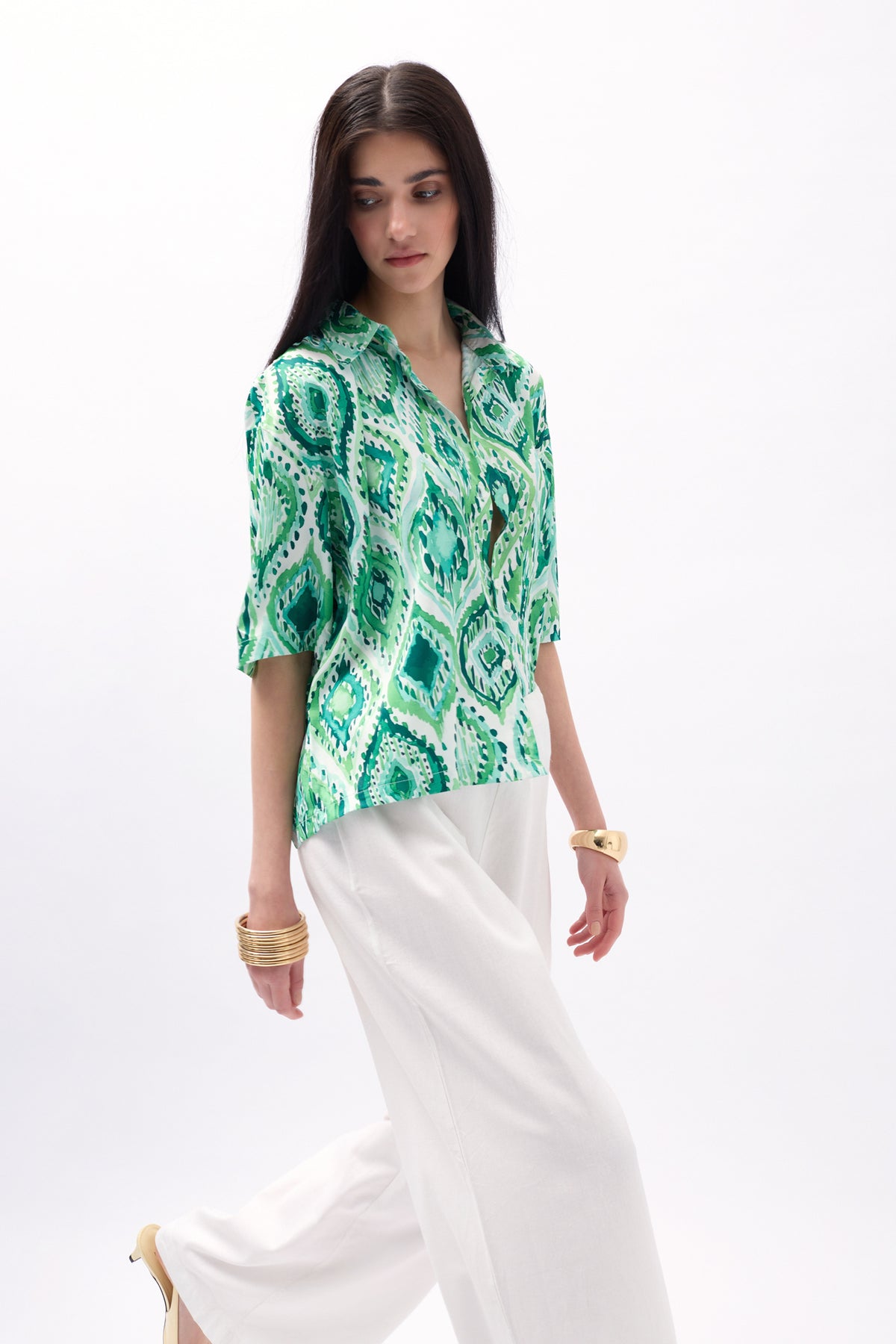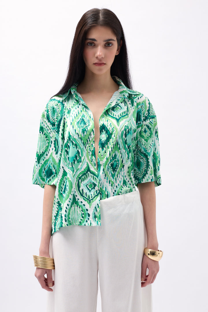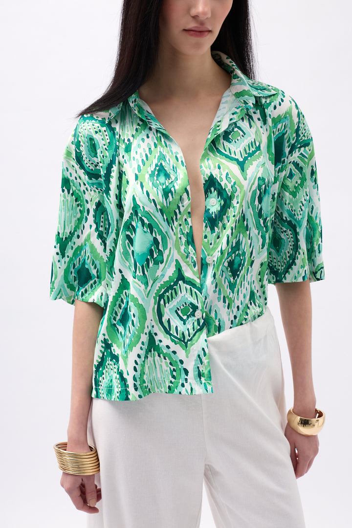 Desenli, Kısa Kollu, Önü Düğmeli, Ceket Yaka, Normal Boy, Saten Gömlek