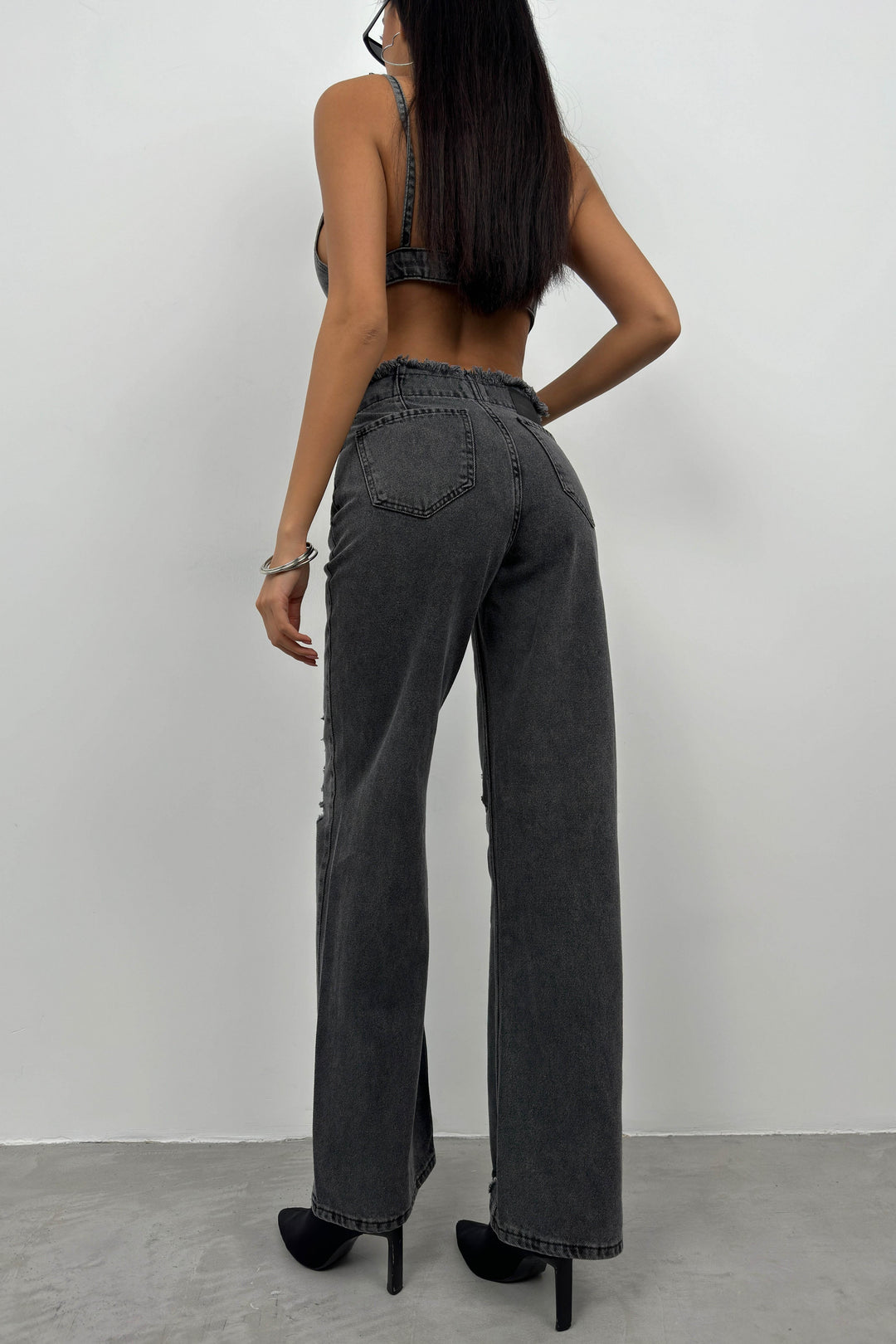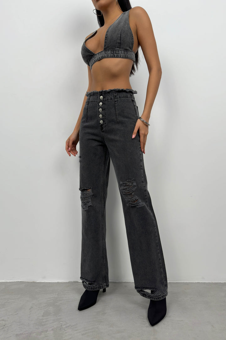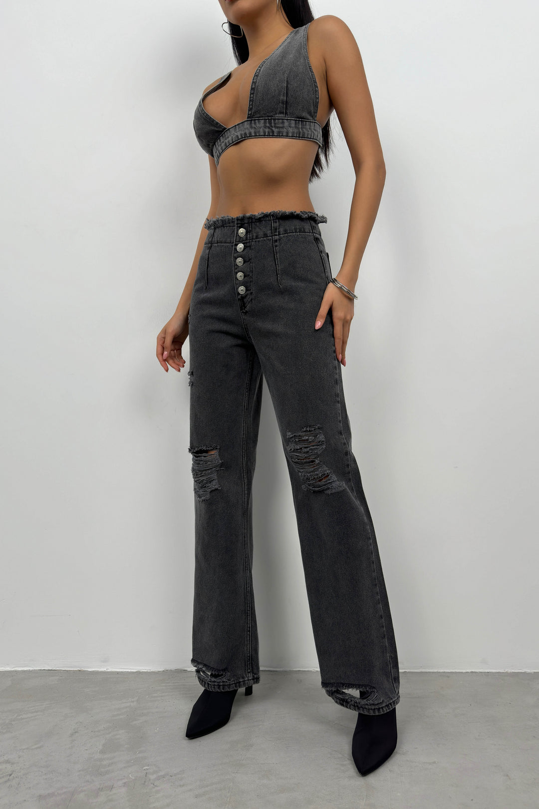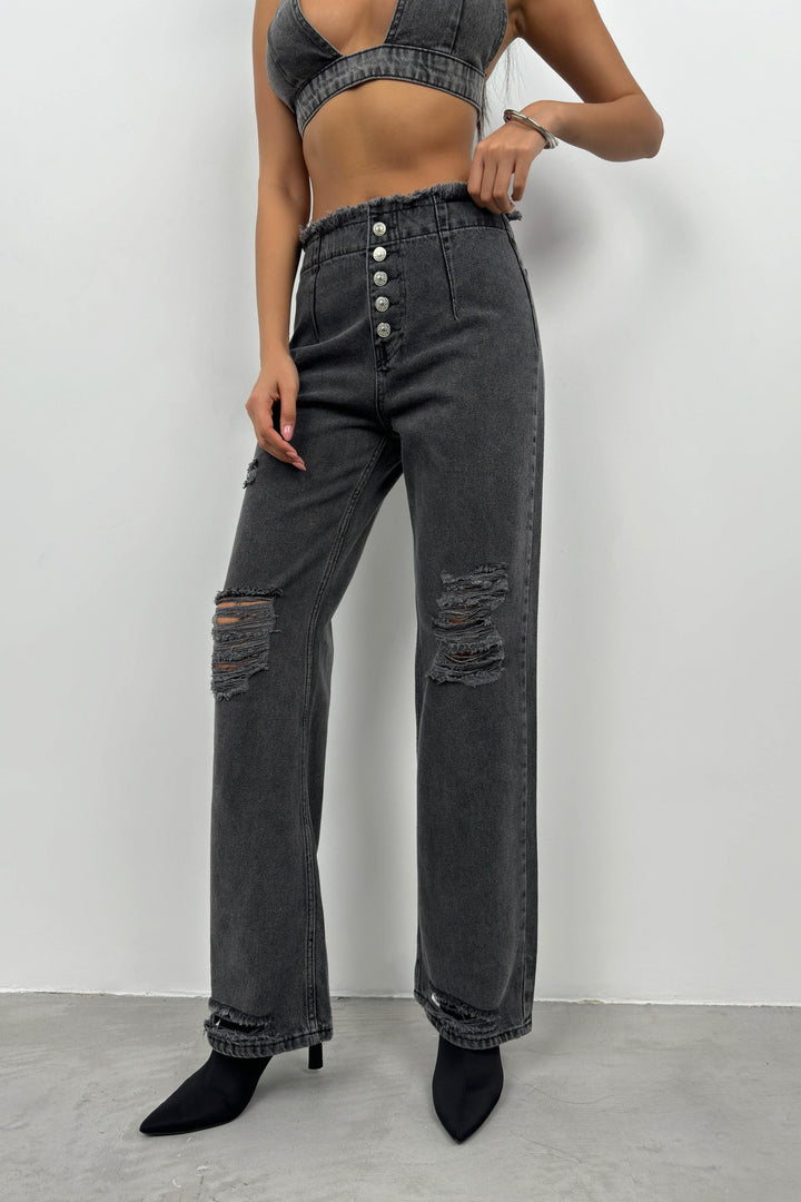 Düğme Detay, Lazer Kesim, Yırtıklı, Bol Paça Jean