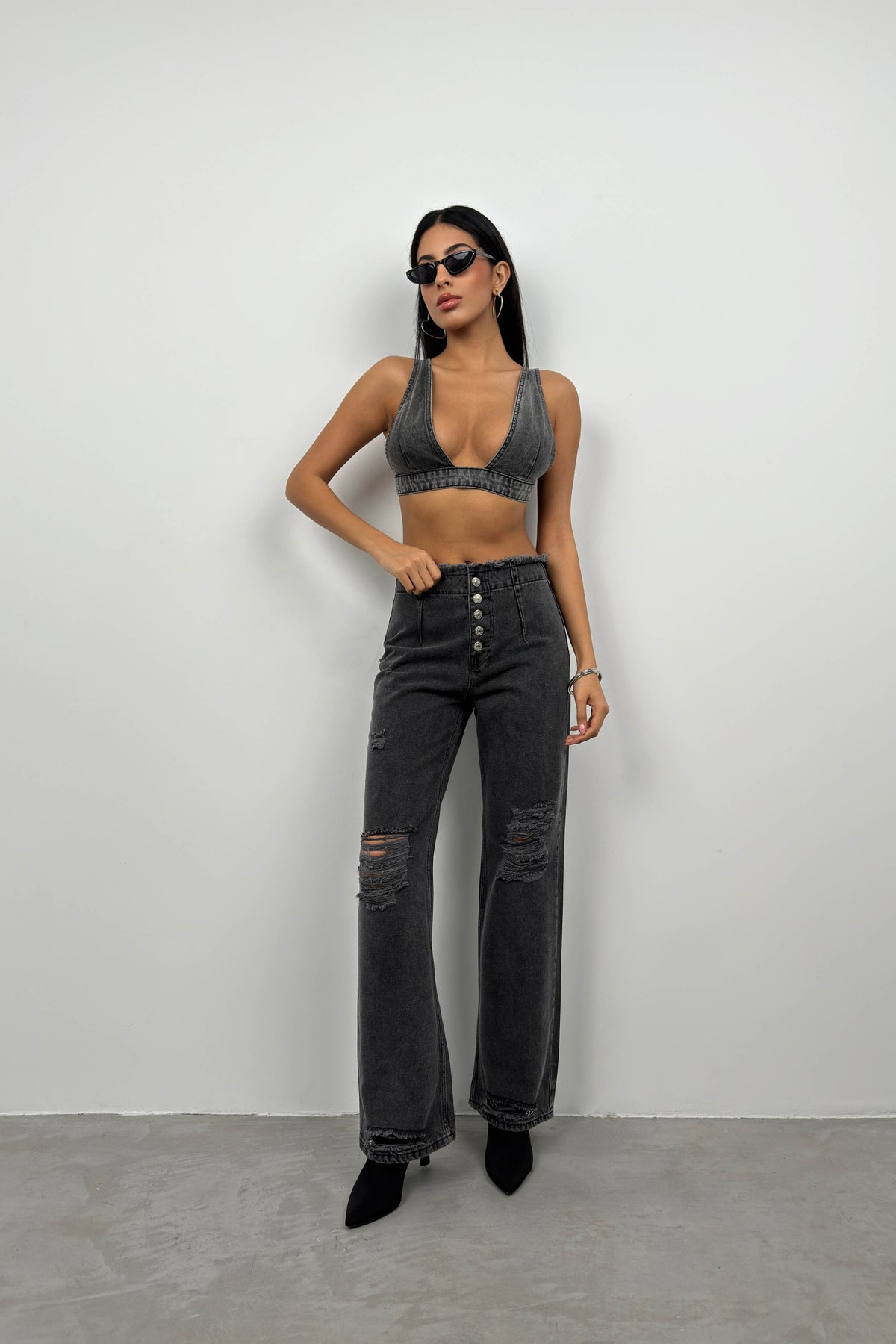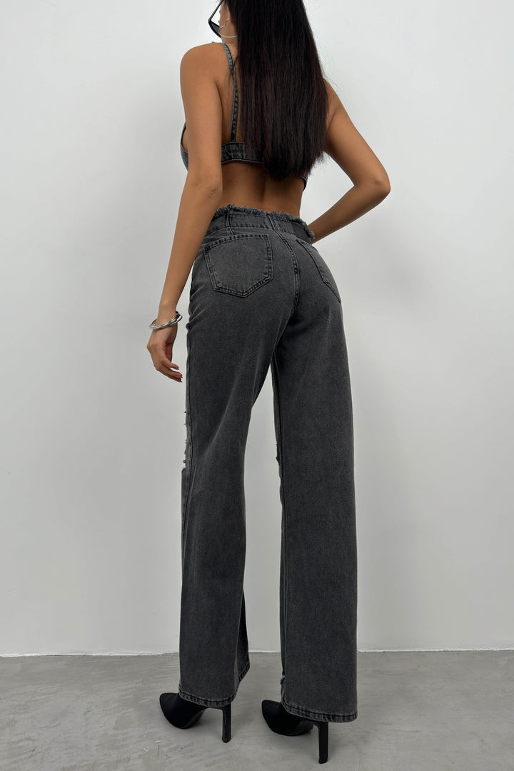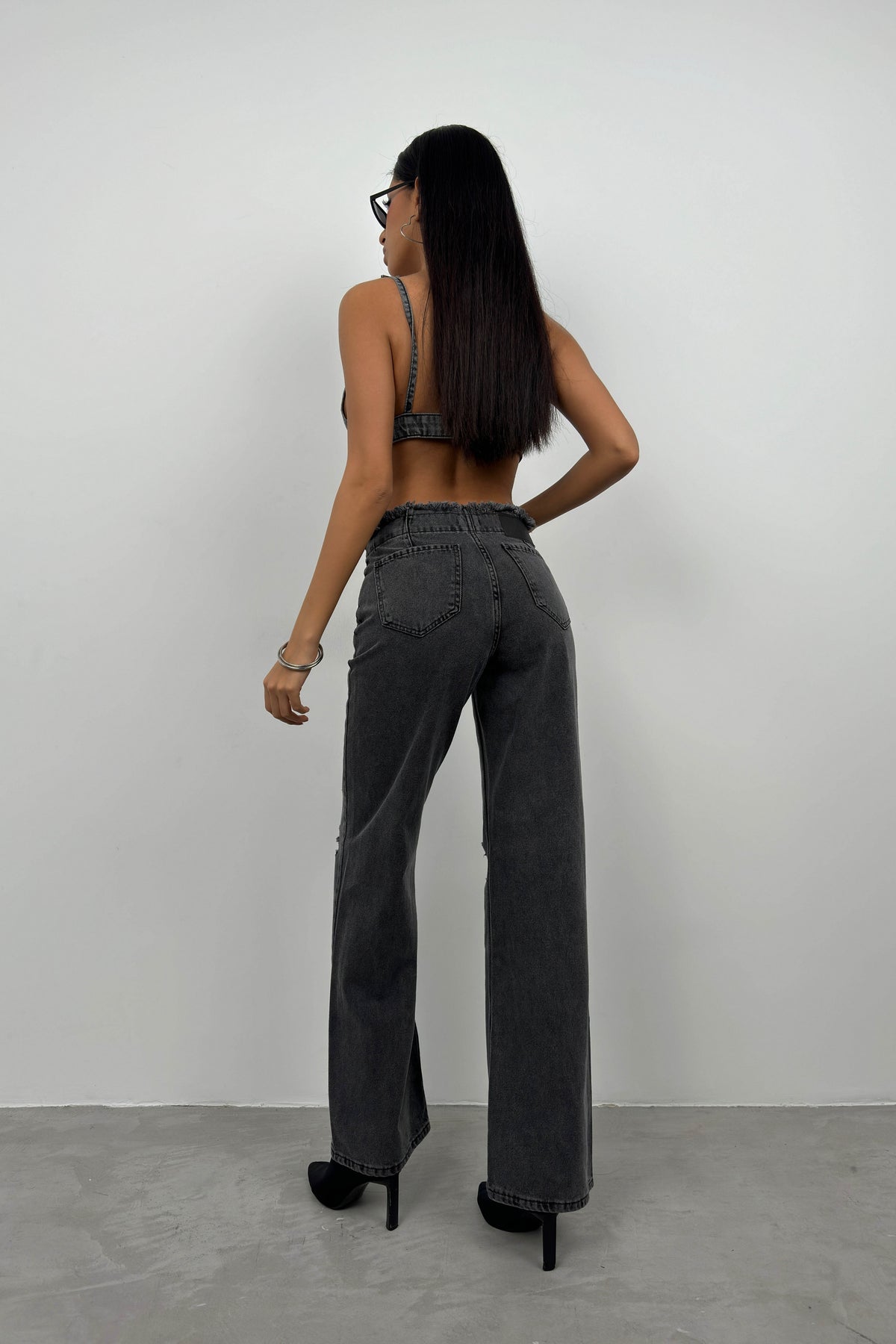 Düğme Detay, Lazer Kesim, Yırtıklı, Bol Paça Jean