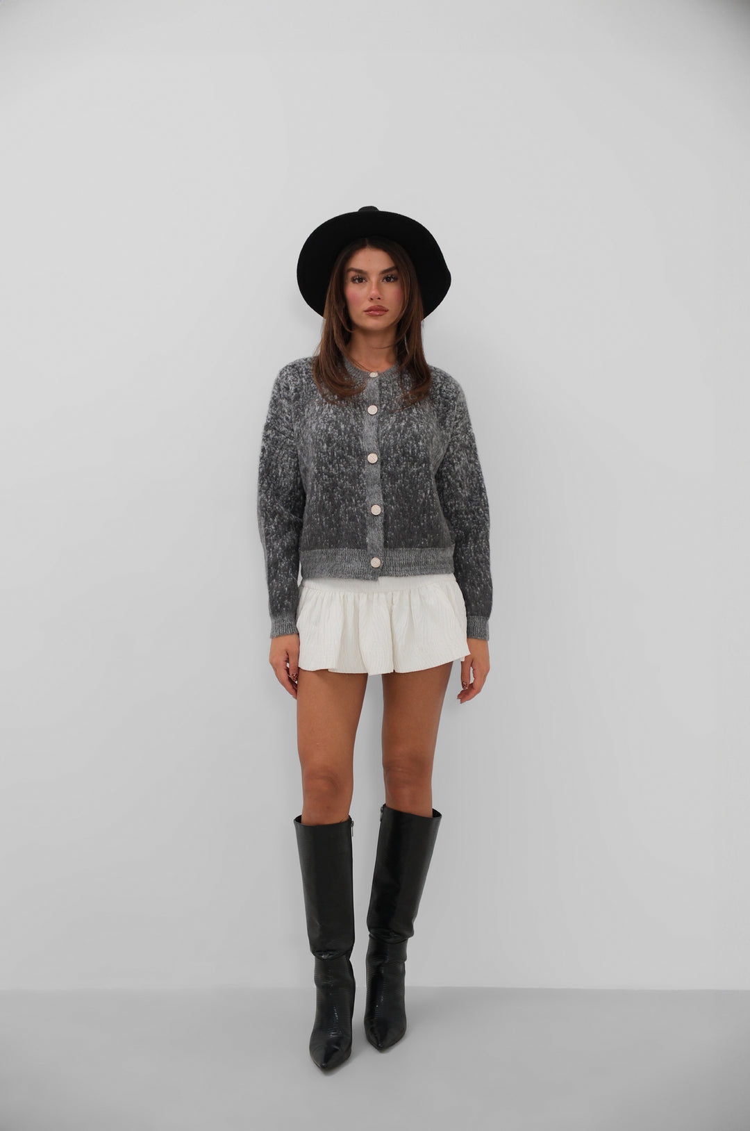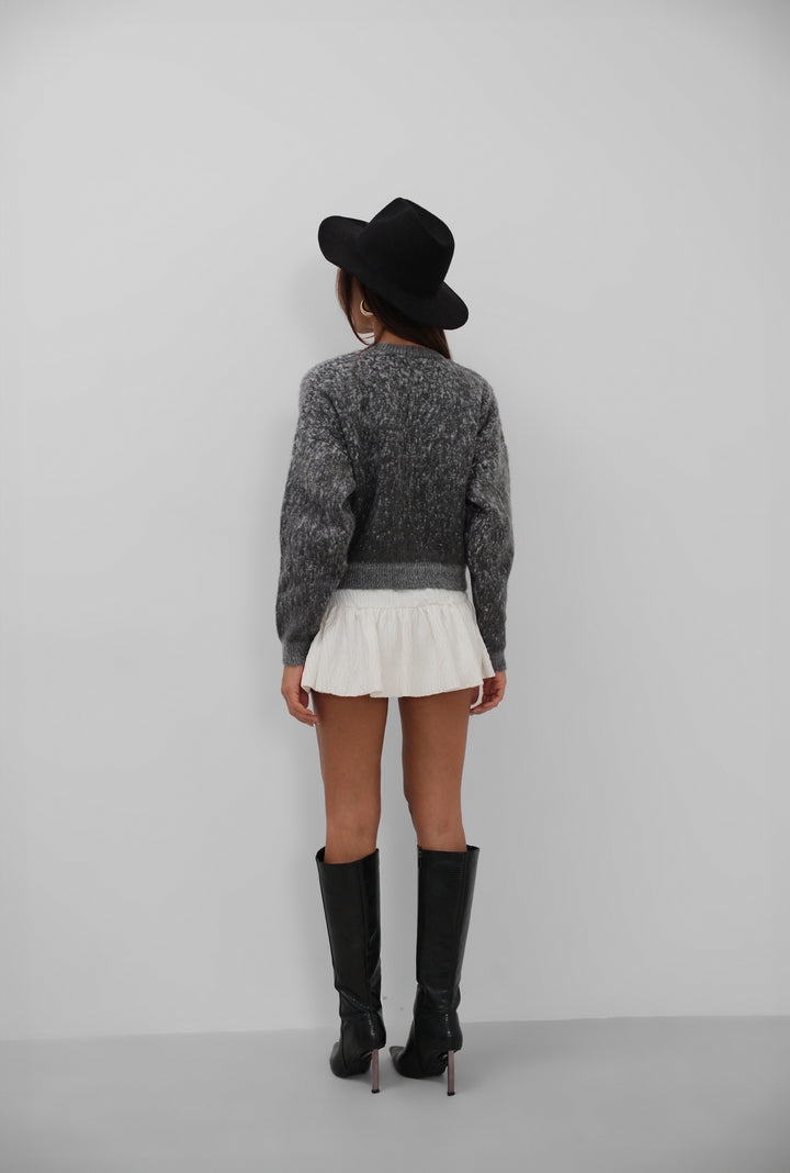 Düğmeli Desenli Sakallı Füme Hırka