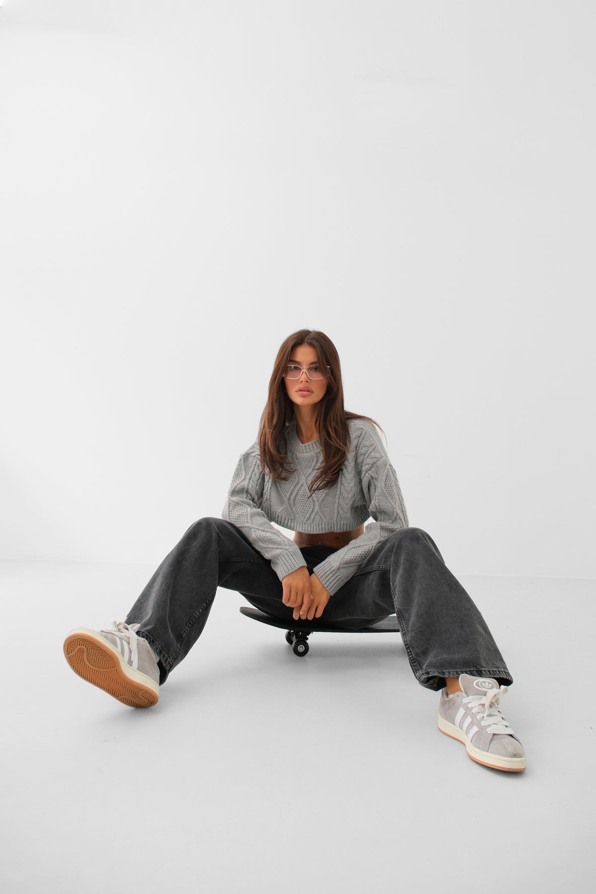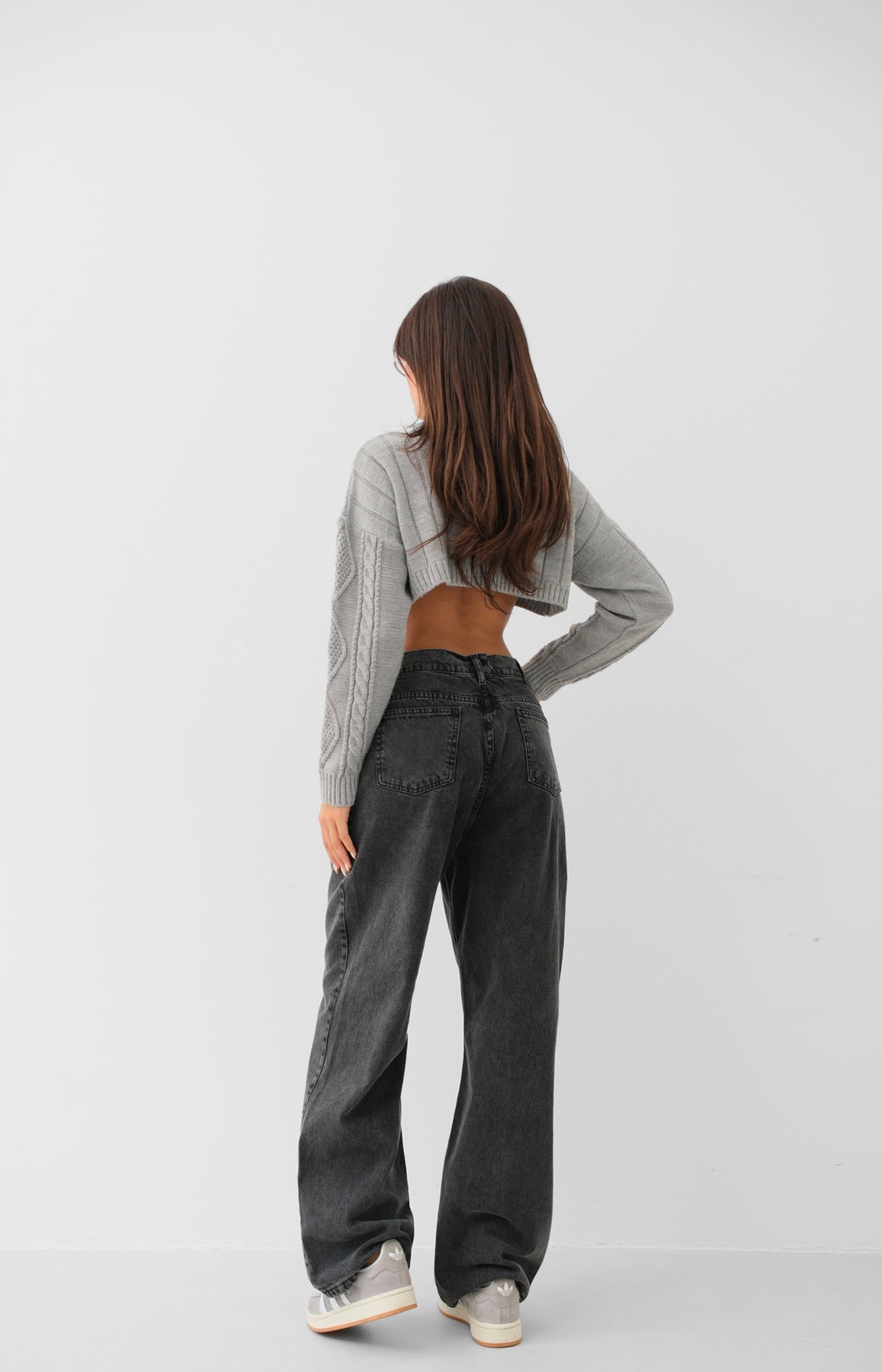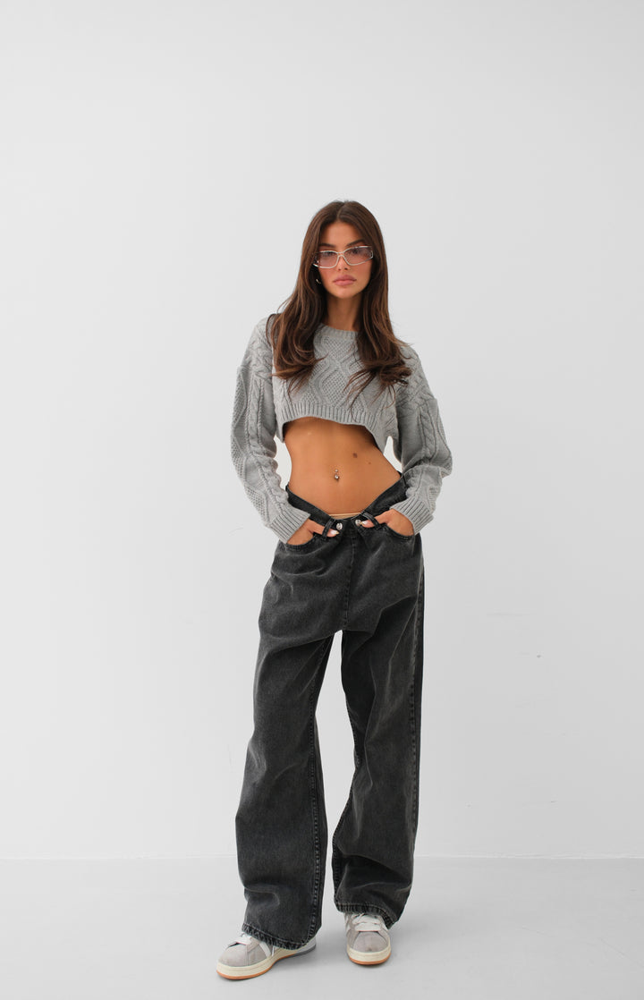 Düşük Bel Çift Düğmeli Gri Wide Leg Jean