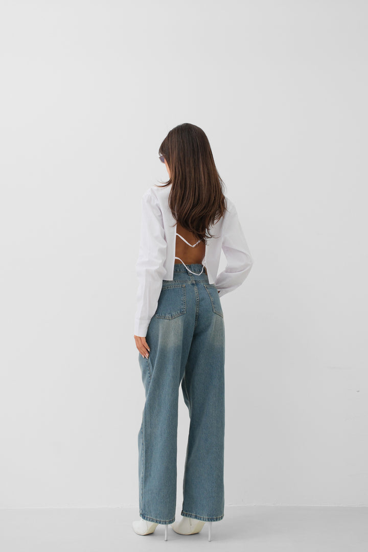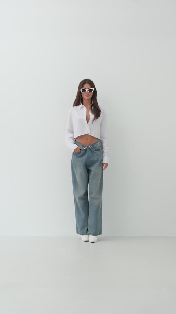 Düşük Bel Çift Düğmeli Mavi Wide Leg Jean