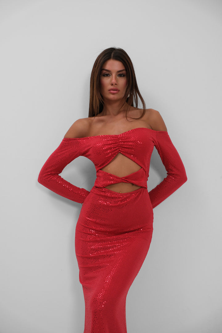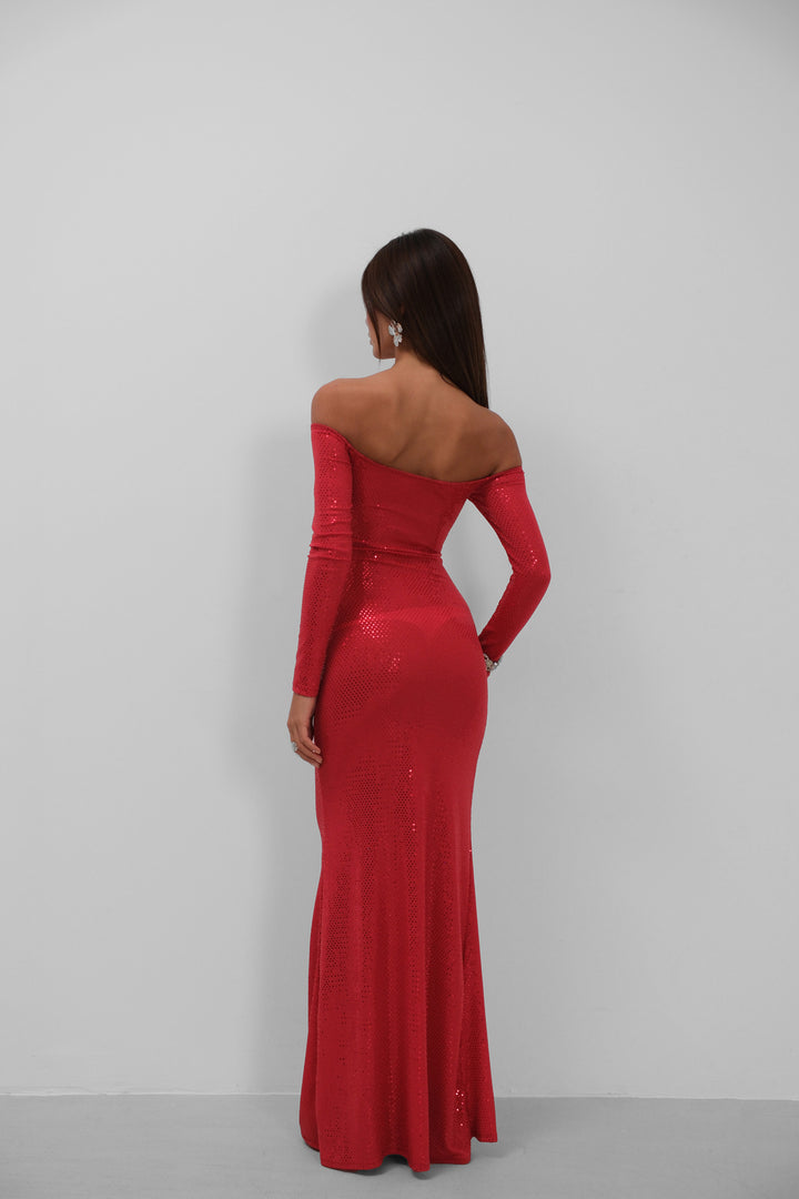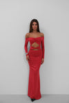 Düşük Omuz Bel Dekolteli Maxi Kırmızı Elbise