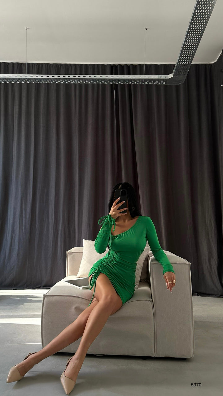 Düşük Omuz Büzgülü Yeşil Mini Elbise