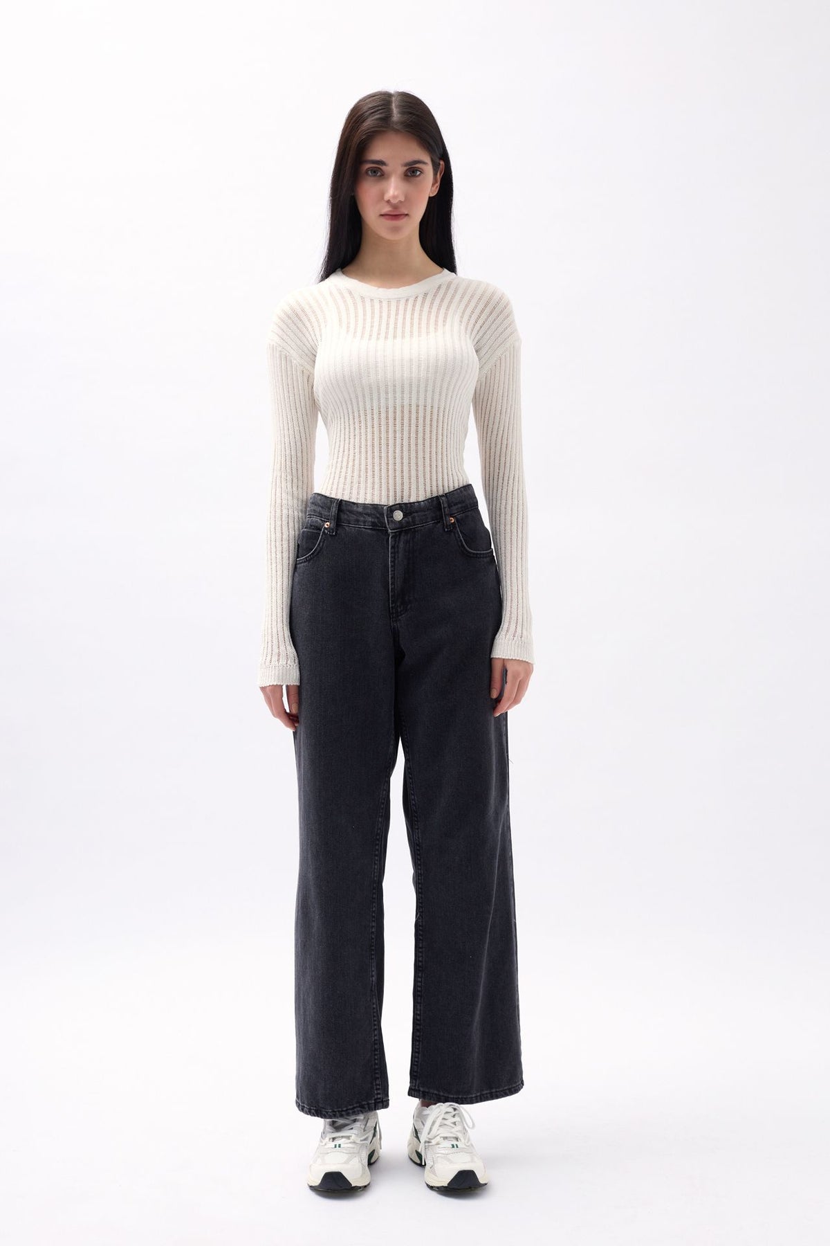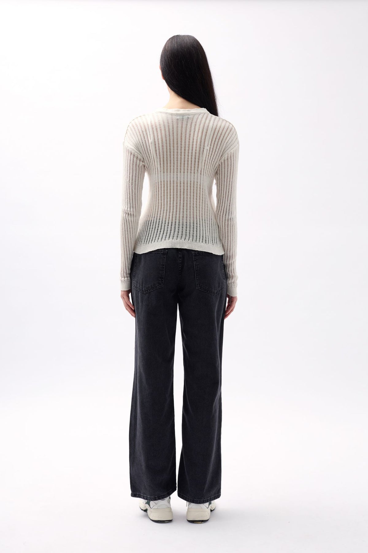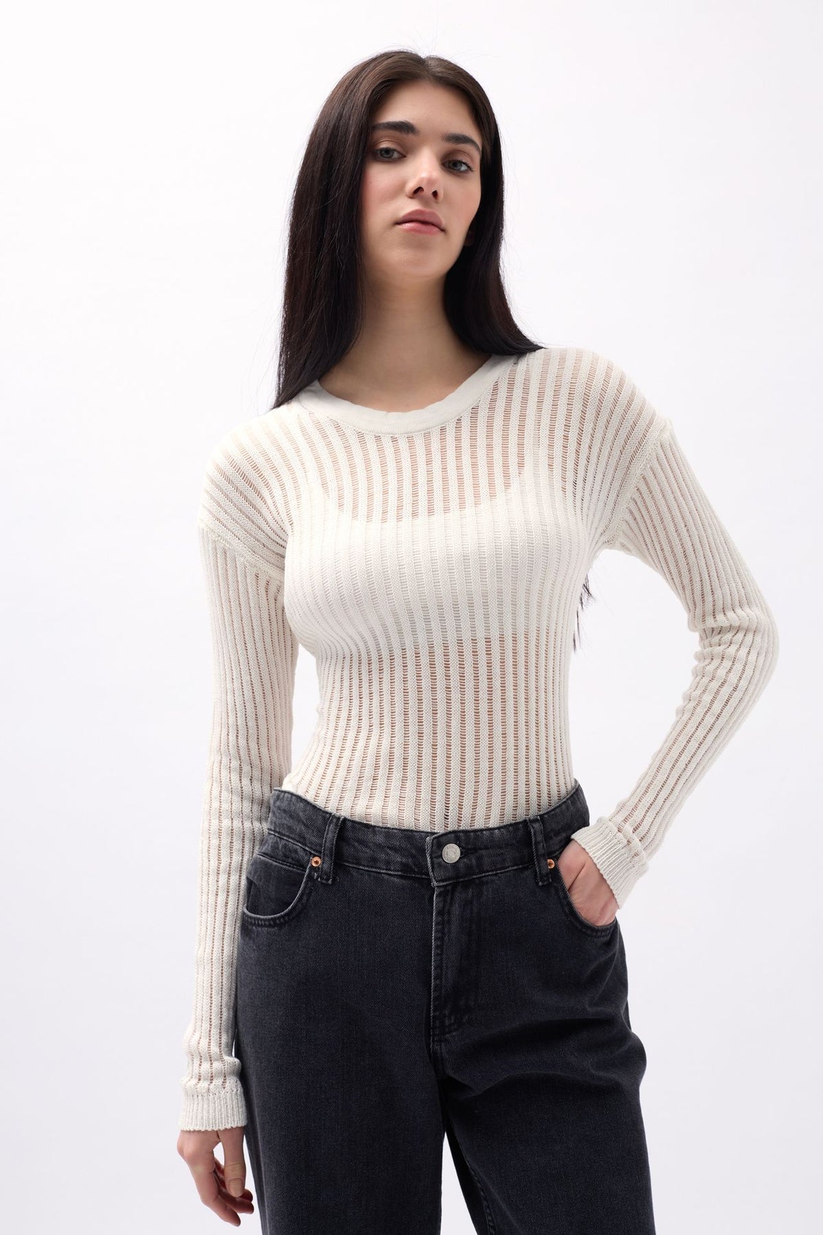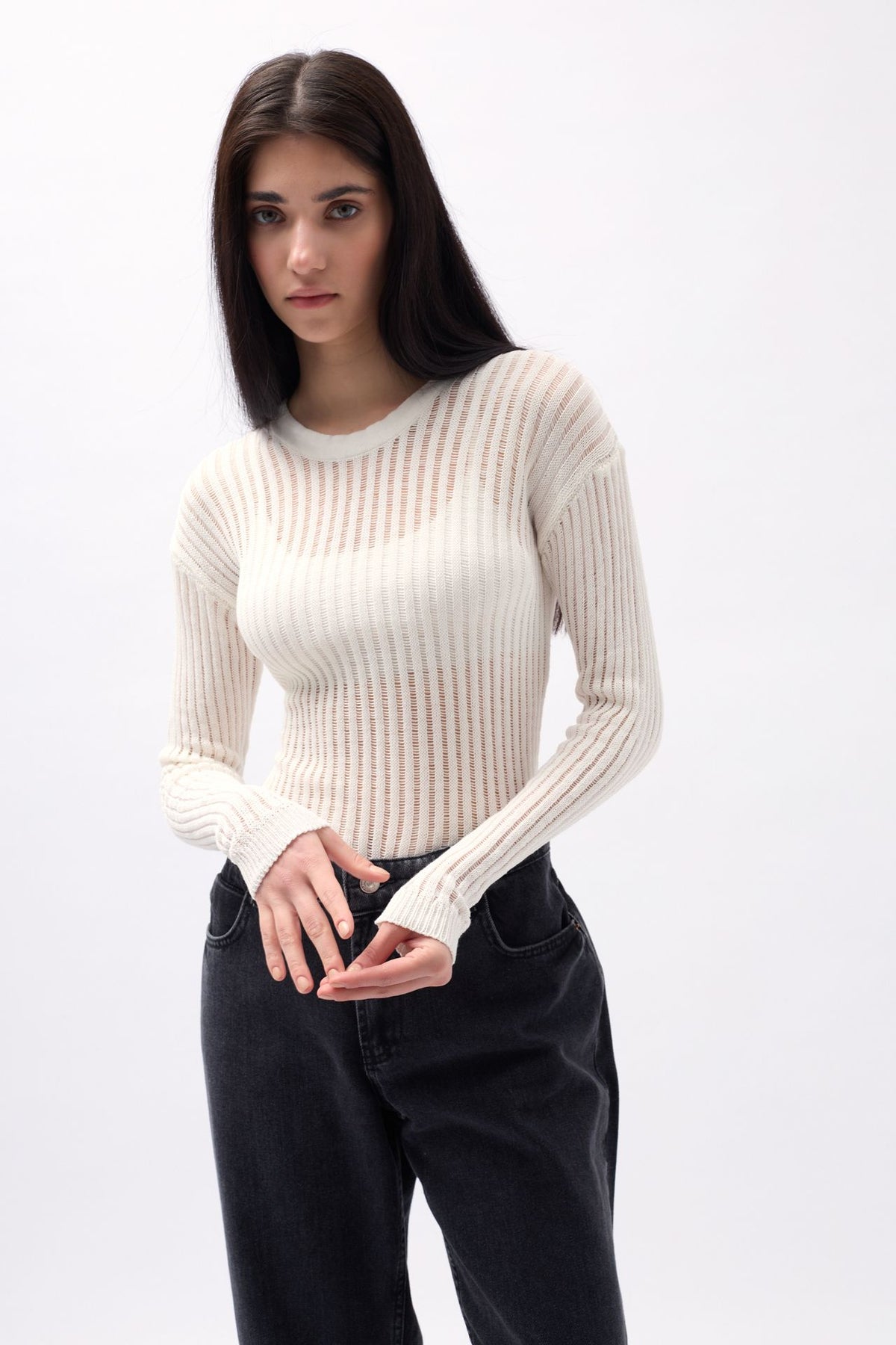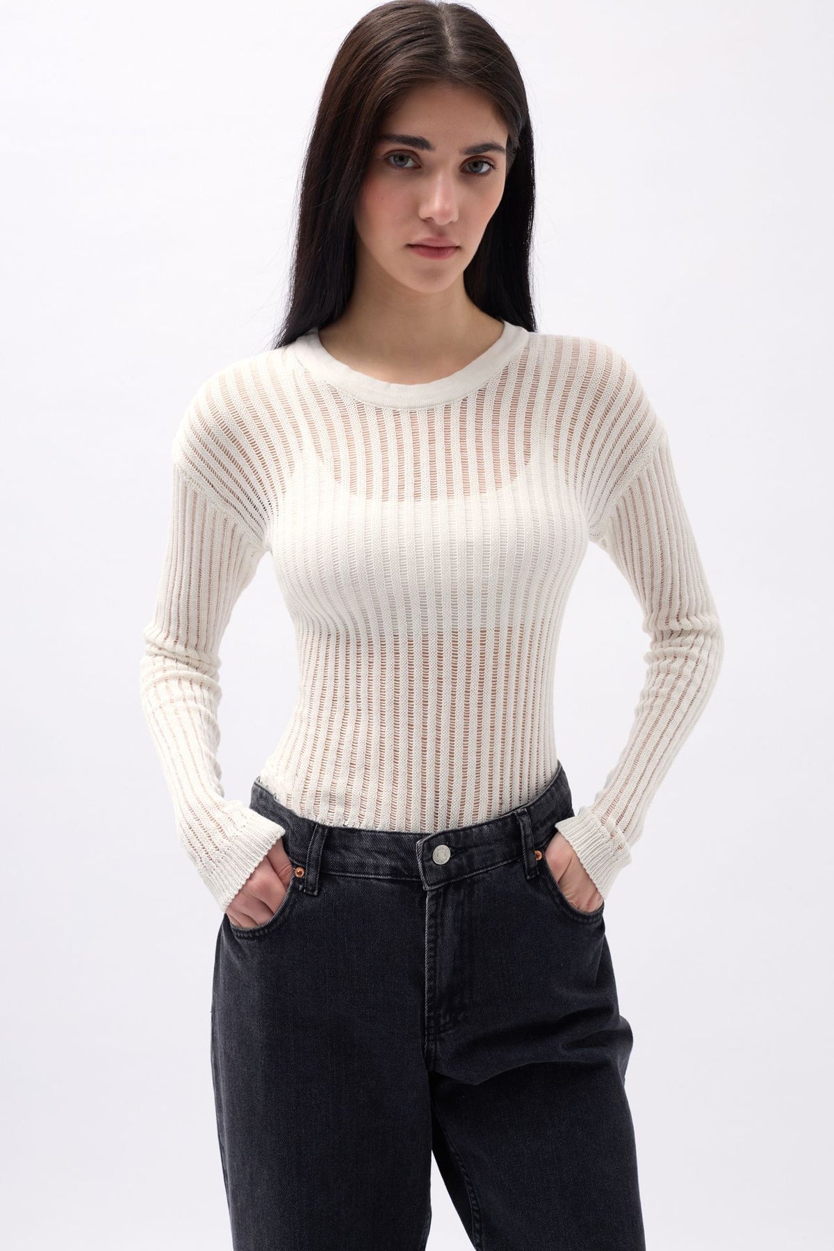 Fitilli Triko Örgü, Dokulu Bluz, Uzun Kol Bluz, Sıfır Yaka, Transparan Bluz