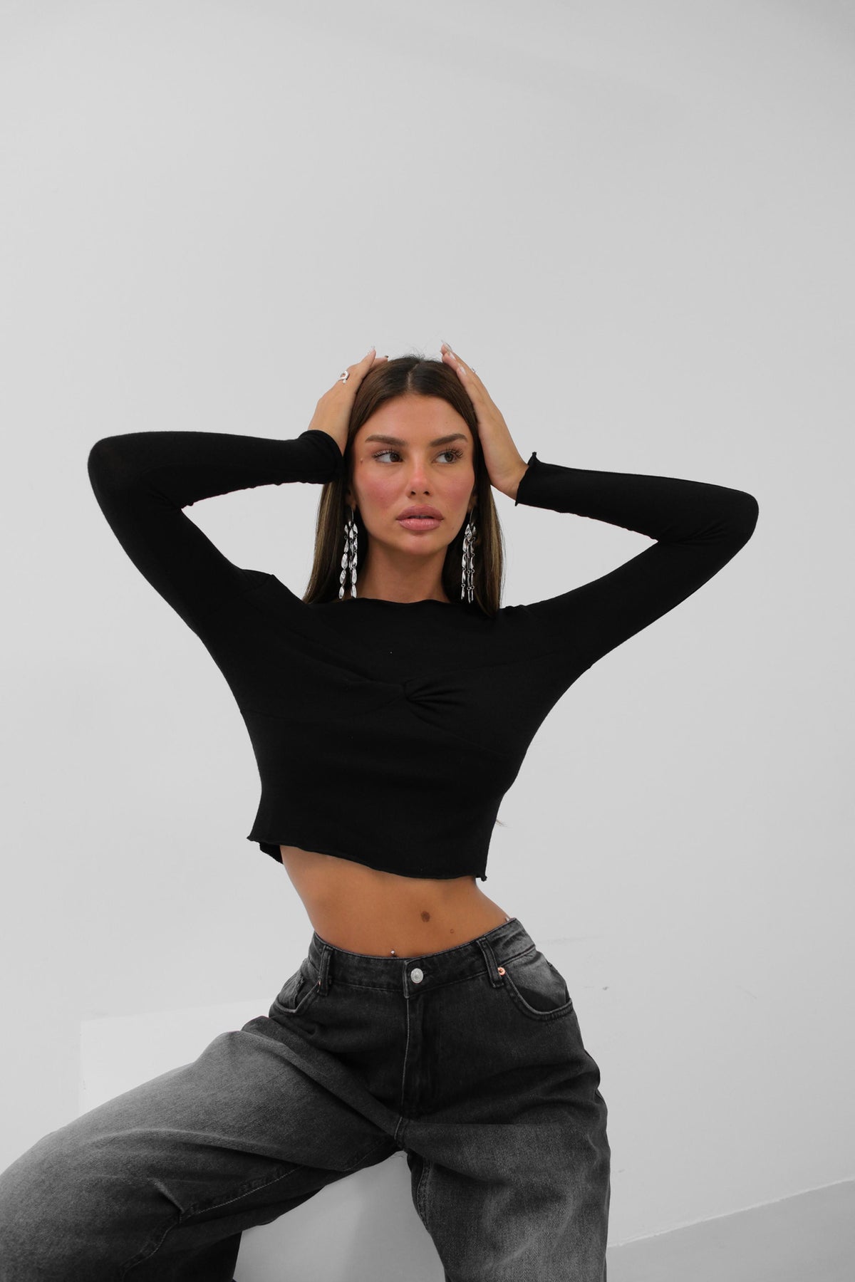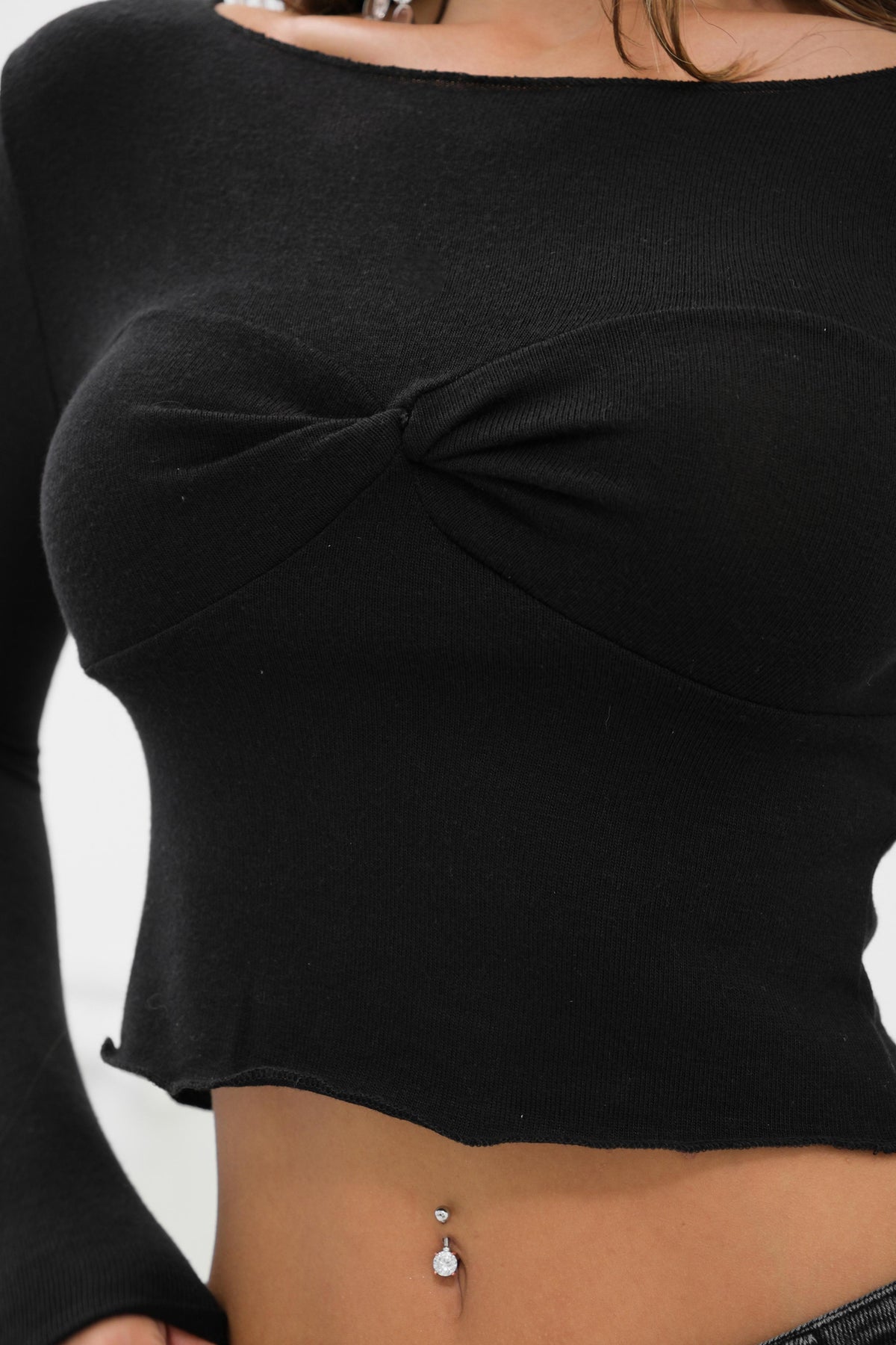 Göğüs Düğüm Detay, Kayık Yaka, Uzun Kollu, Bluz