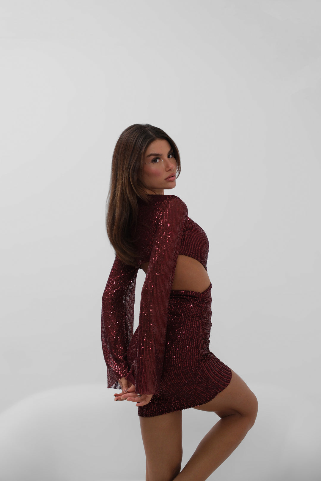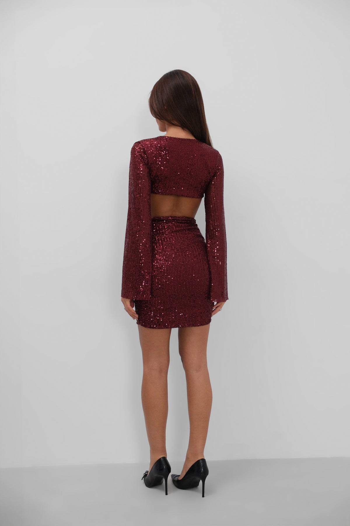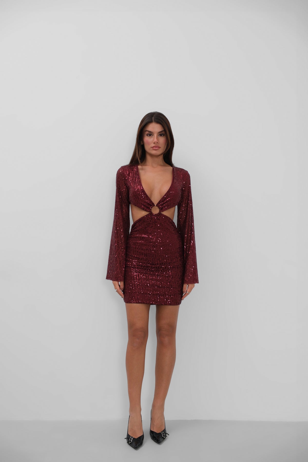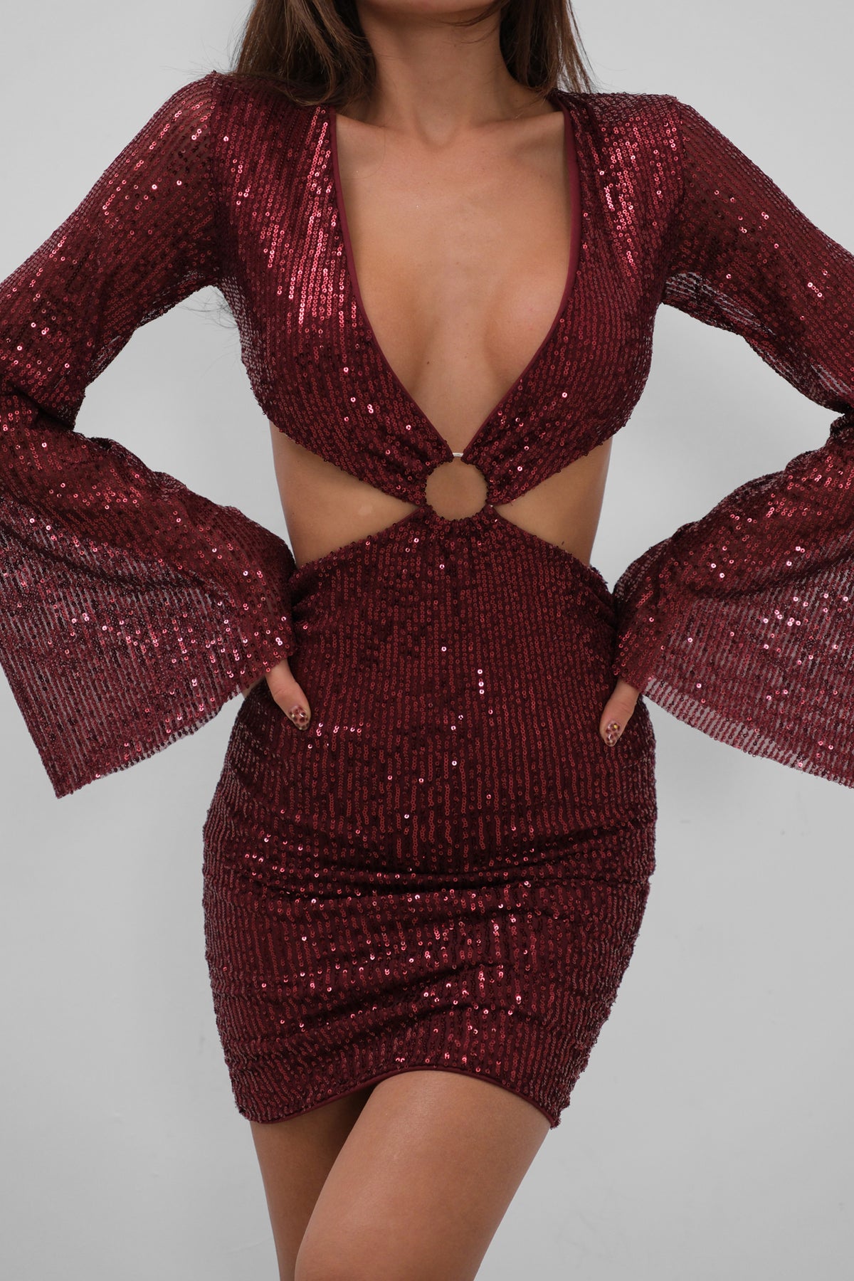Halka Detay Yarasa Kol Payetli Mini Bordo Elbise