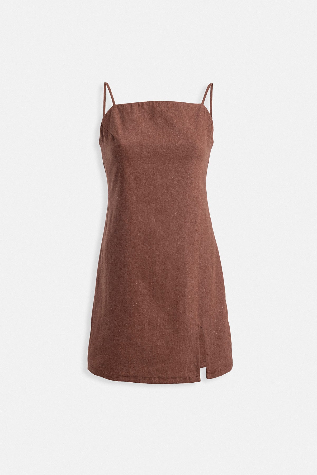 İp Askılı Yırtmaç Detay Keten Mini Kahverengi Elbise