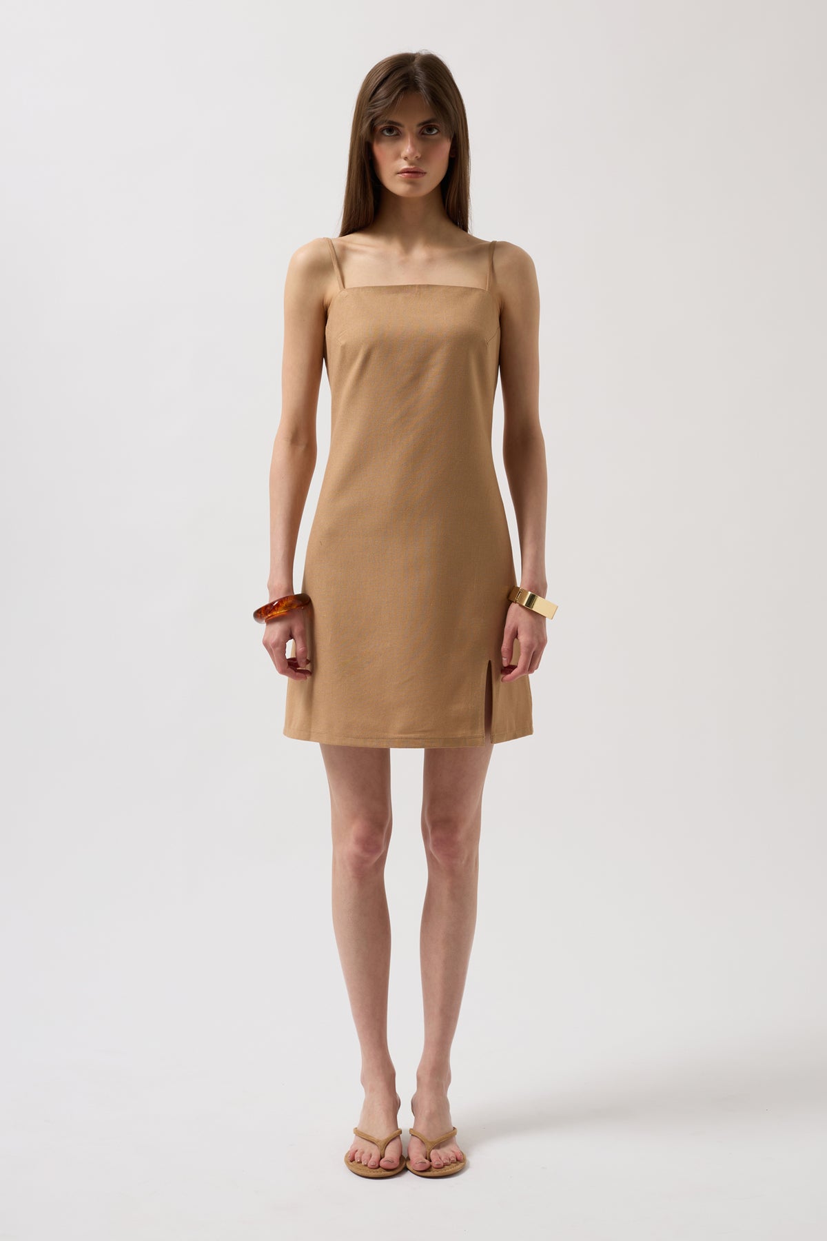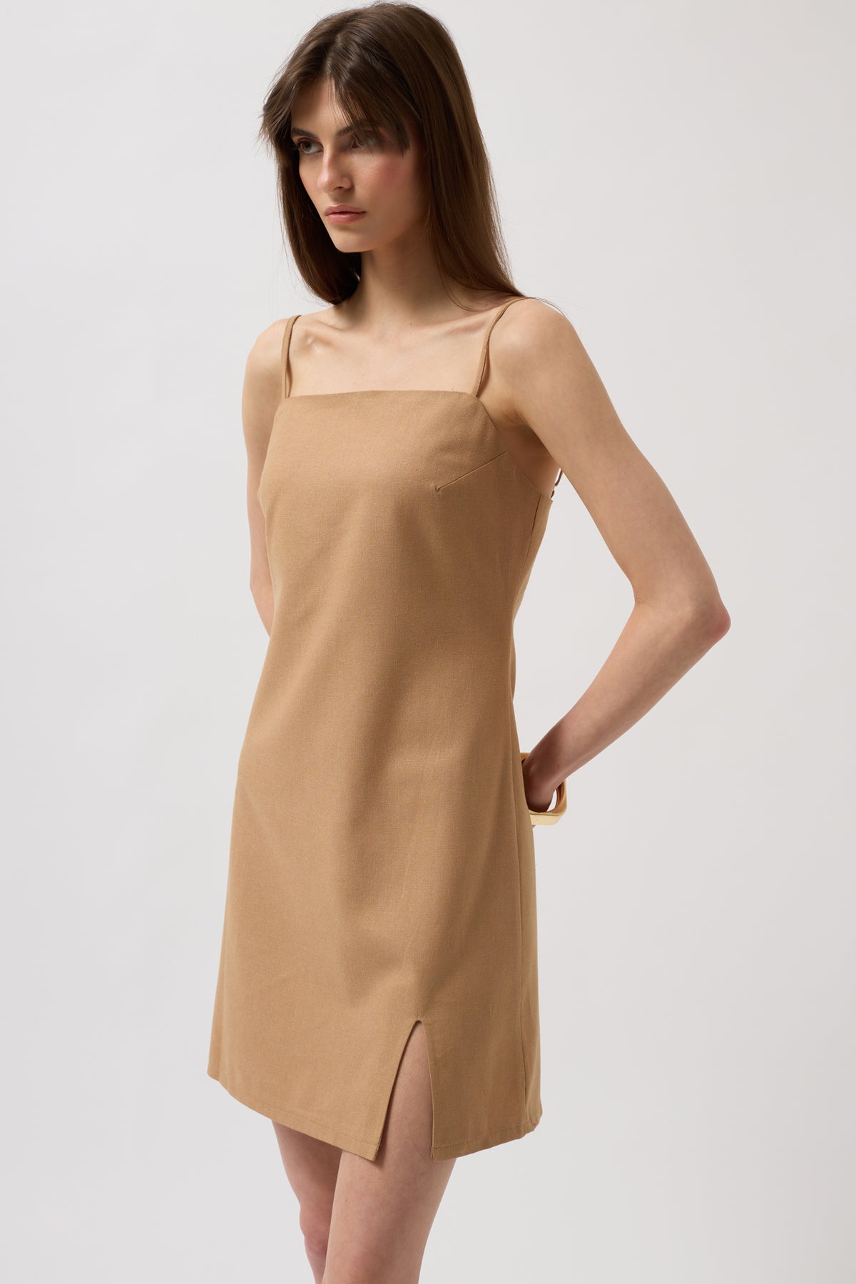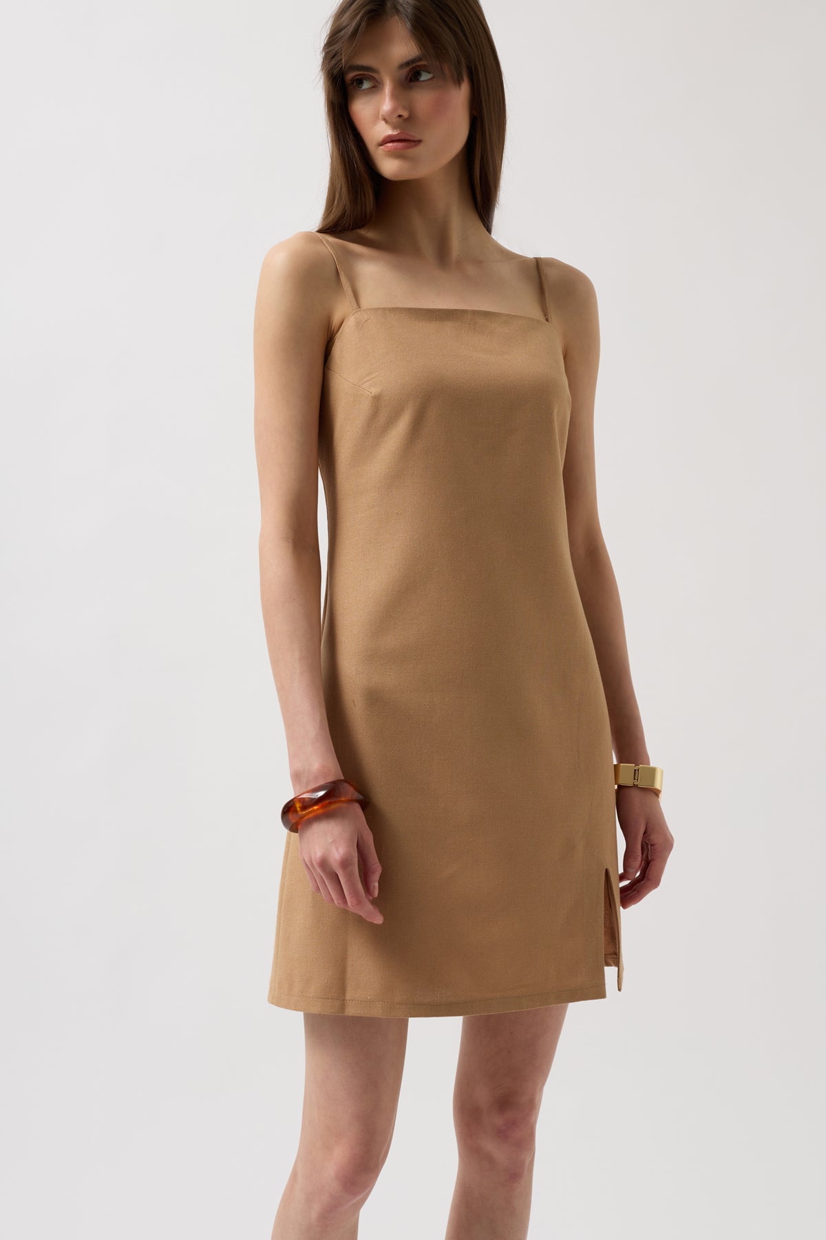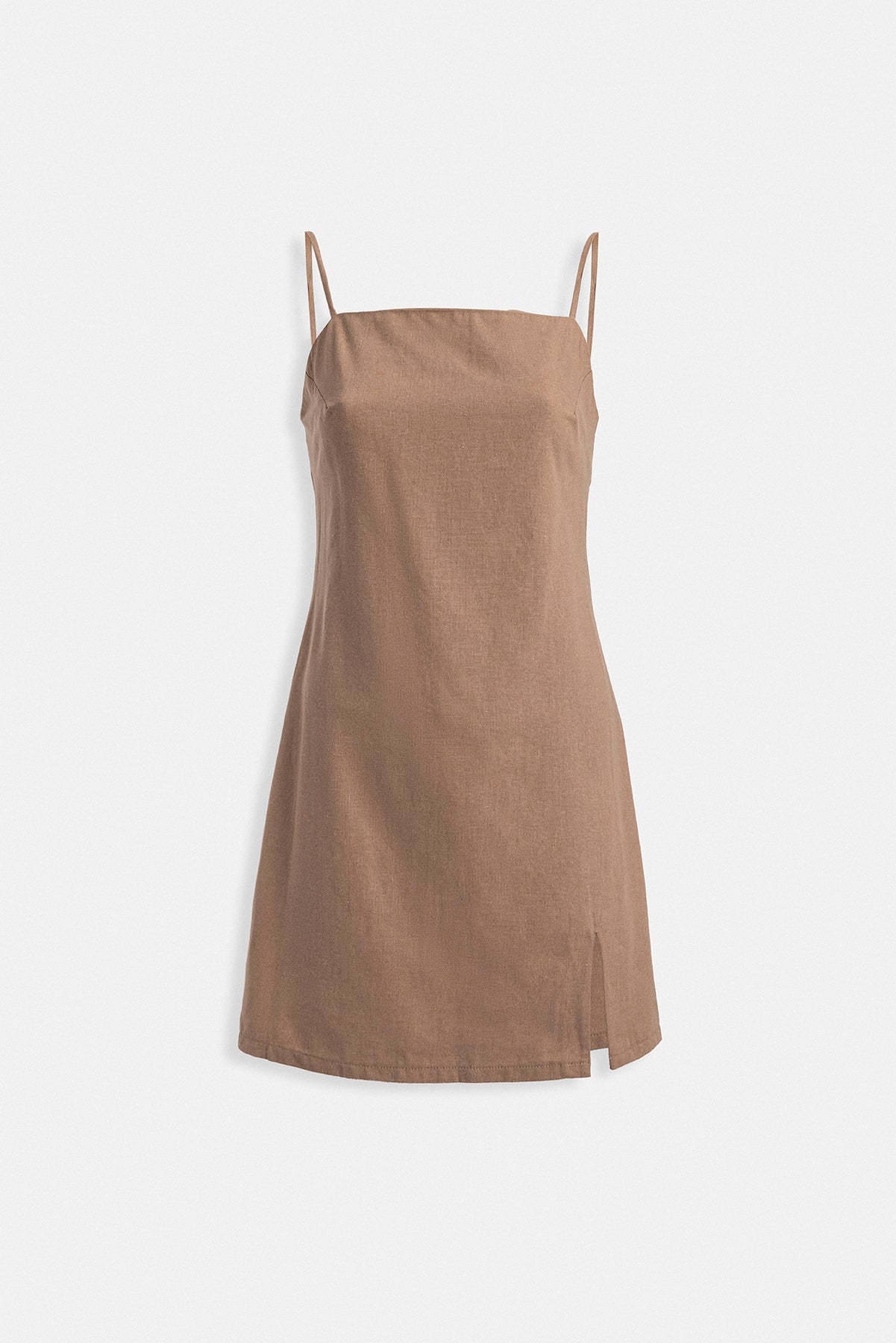 Ayarlanabilir İp Askılı, Arkası Gizli Fermuarlı, İnce Askılı, Keten Mini Elbise