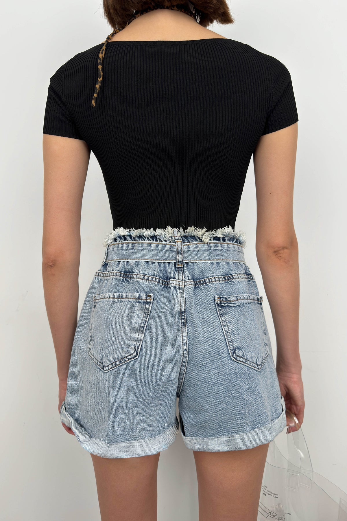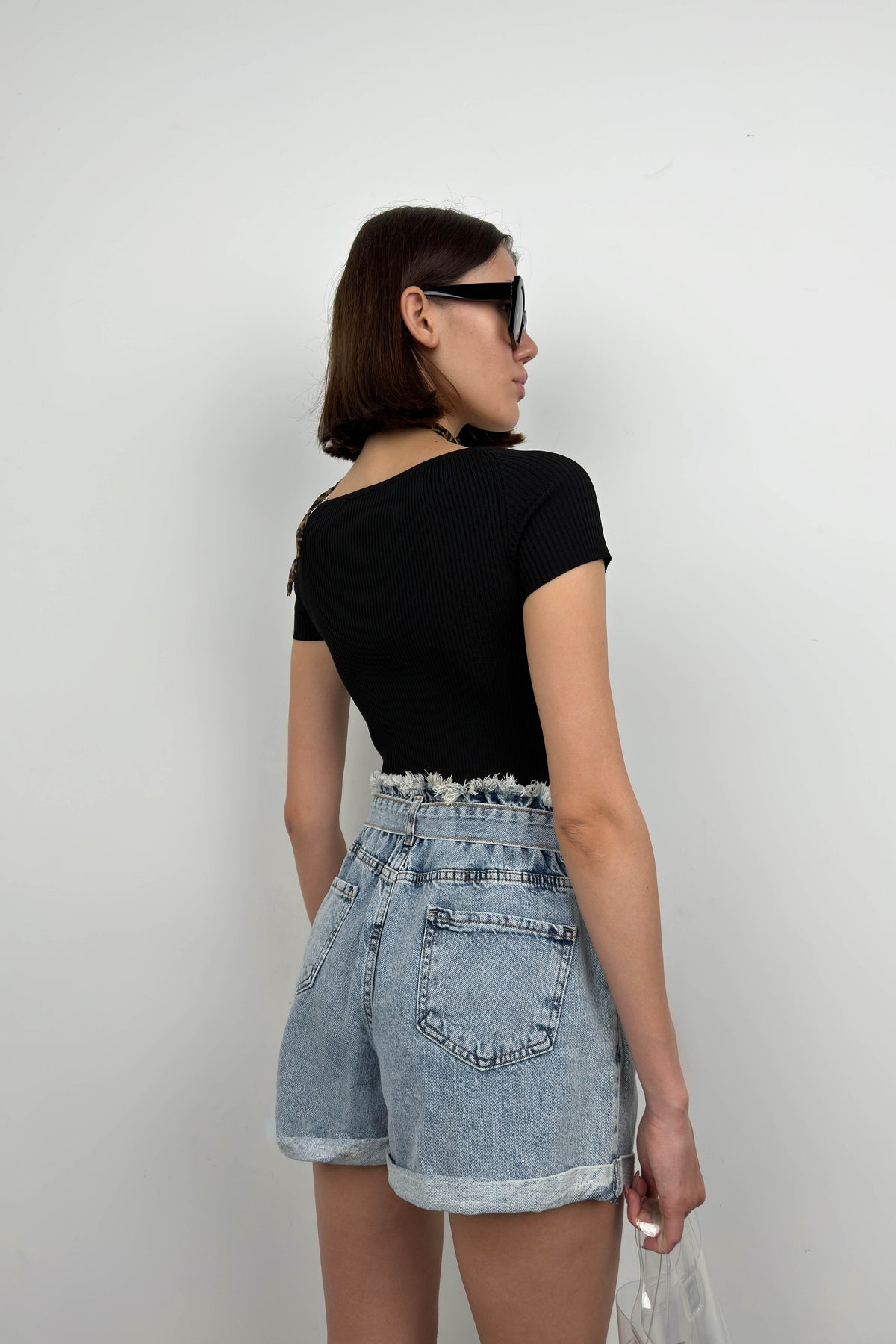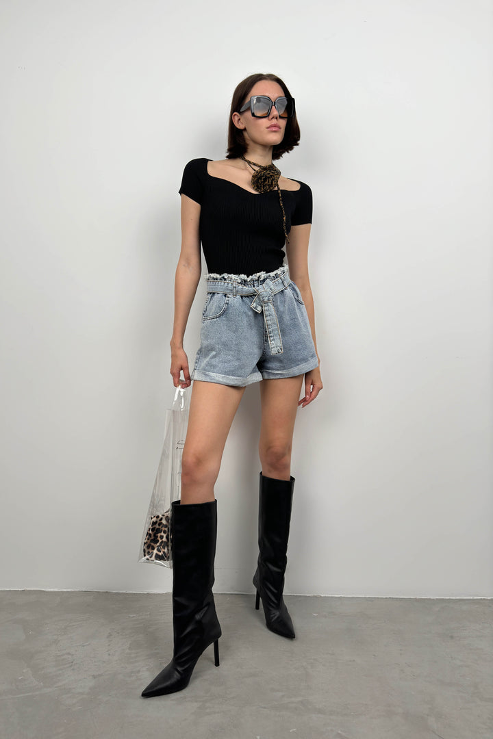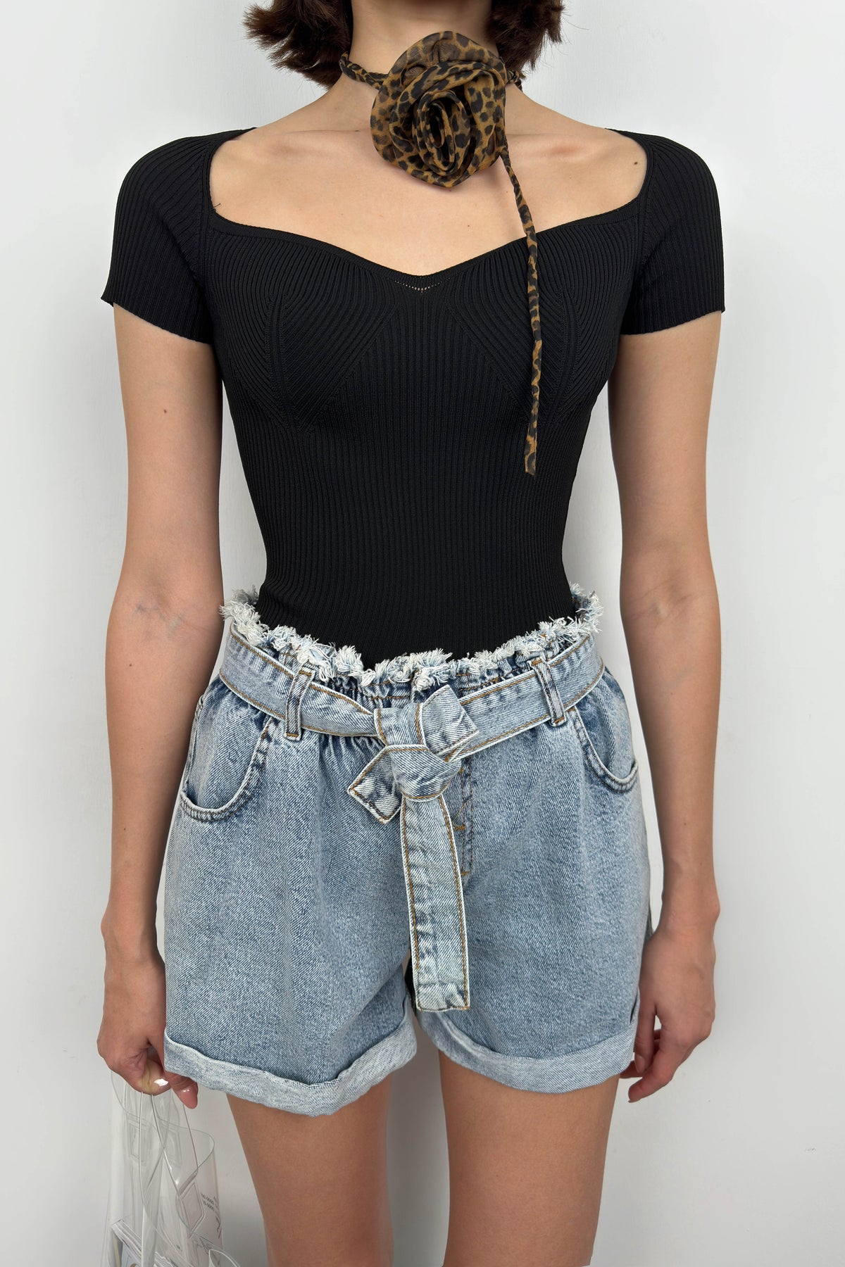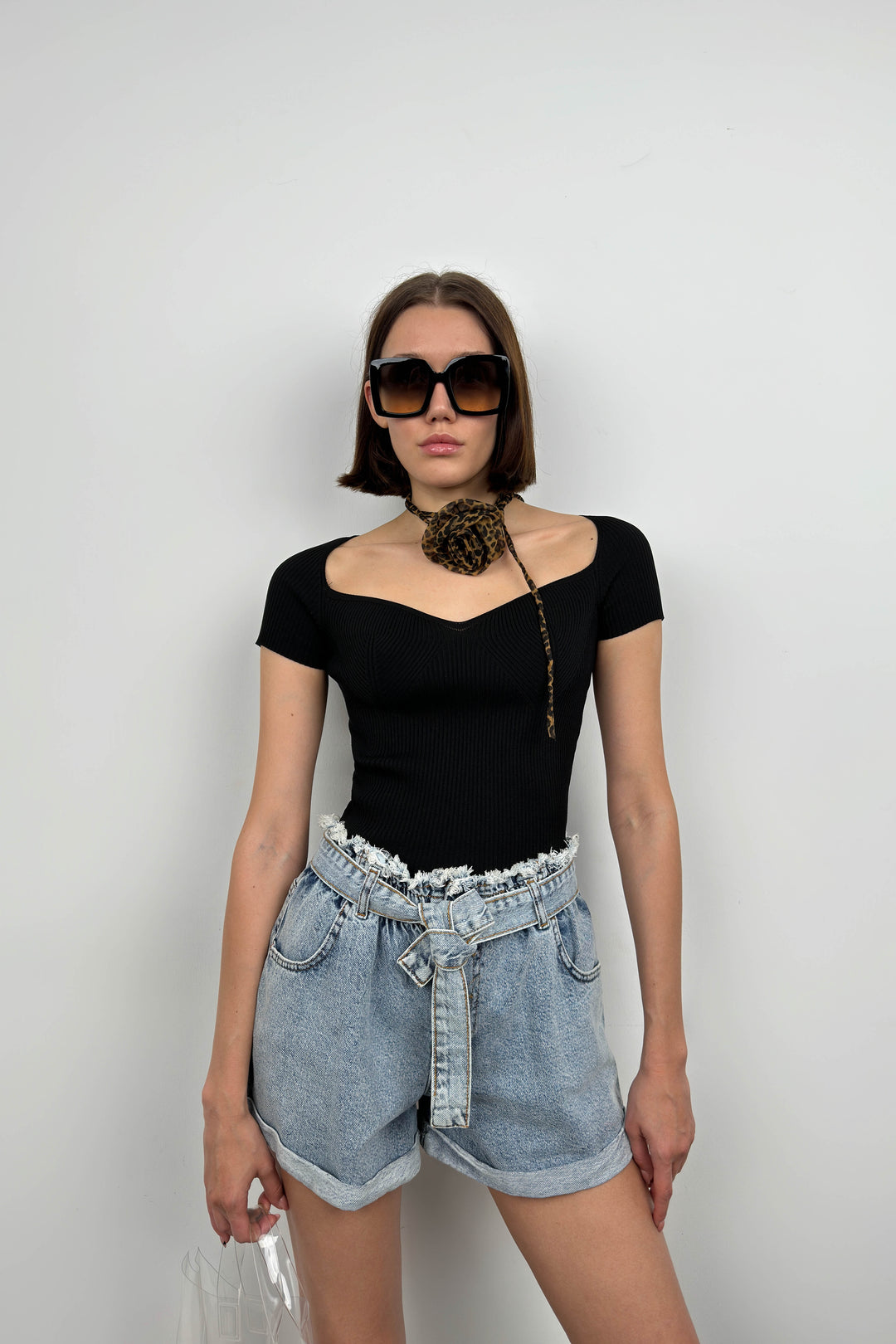 Göğüs Dekolteli, Kısa Kollu, Triko Bluz Slim Fit, Göğüs Biye Detaylı
