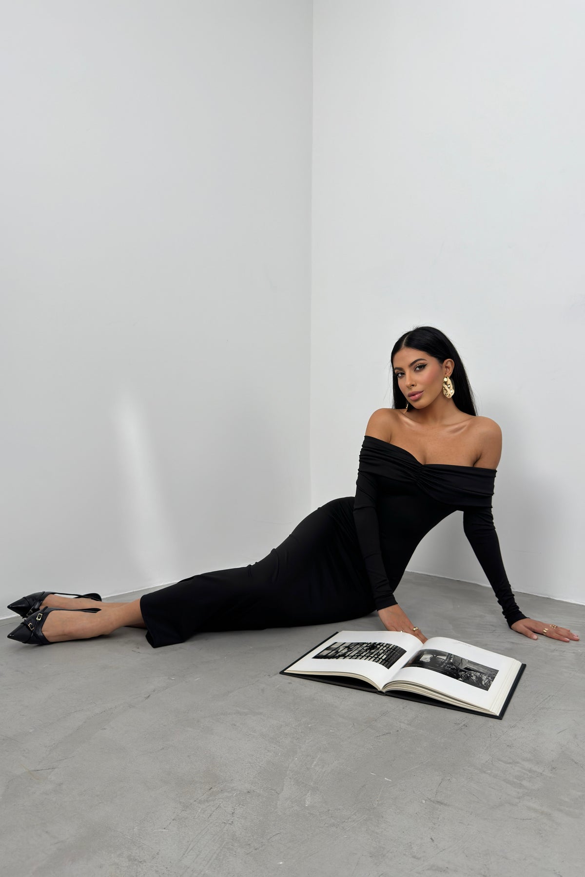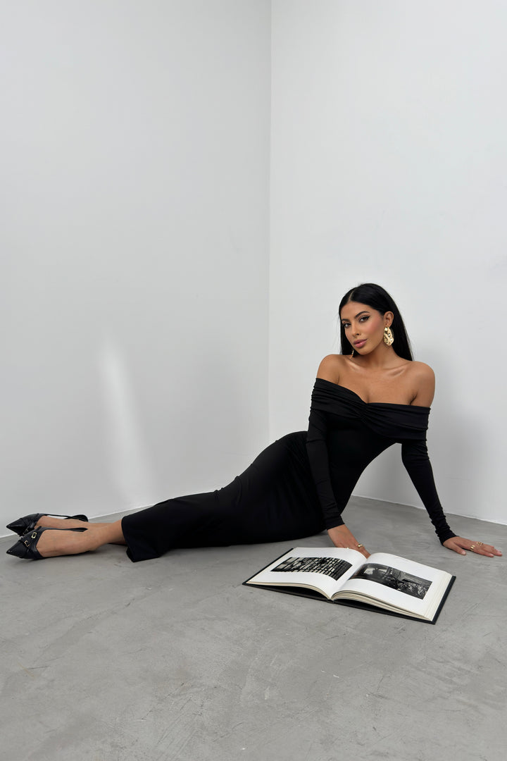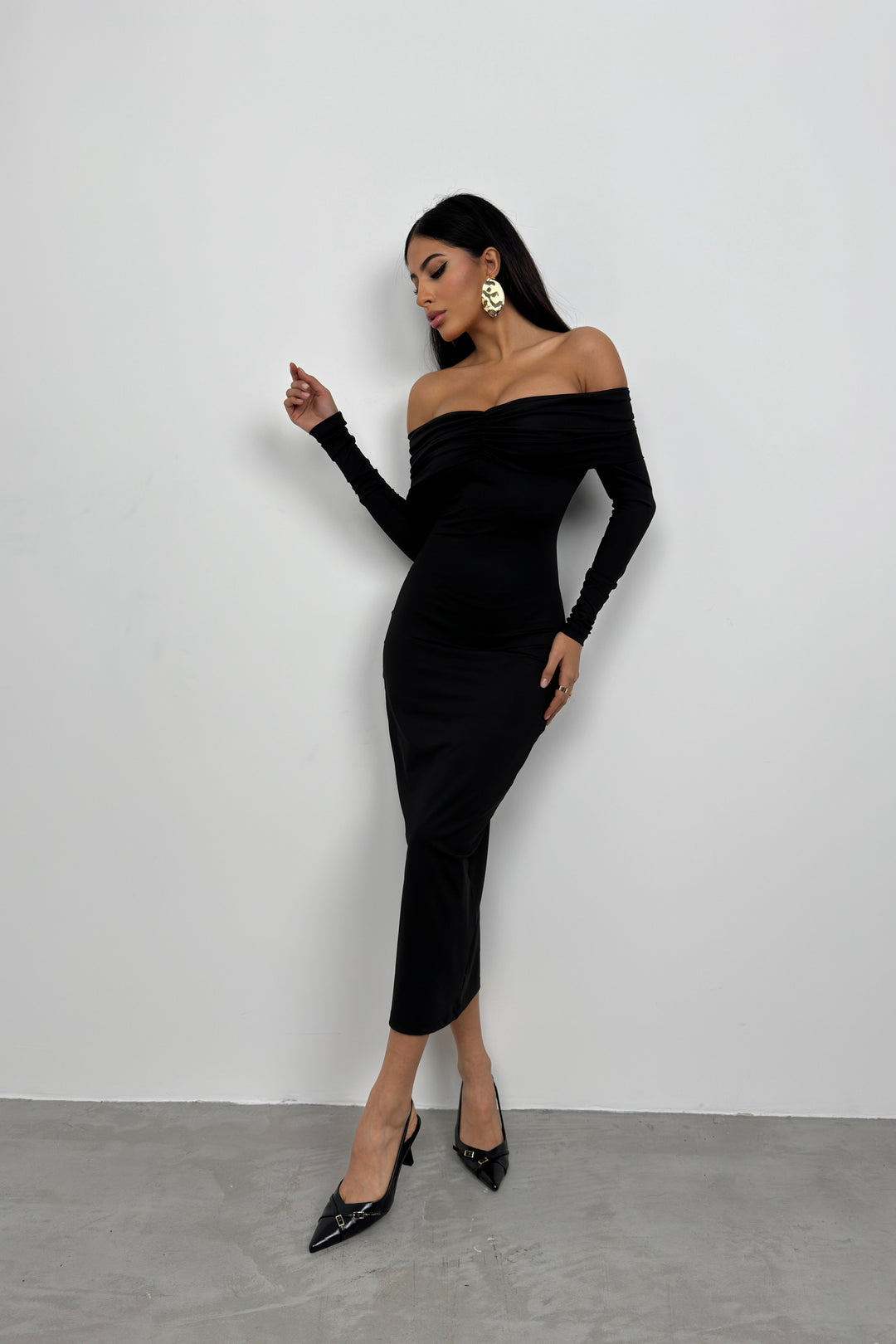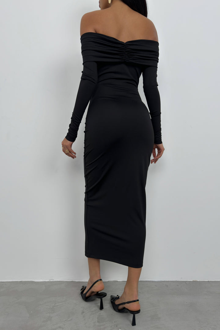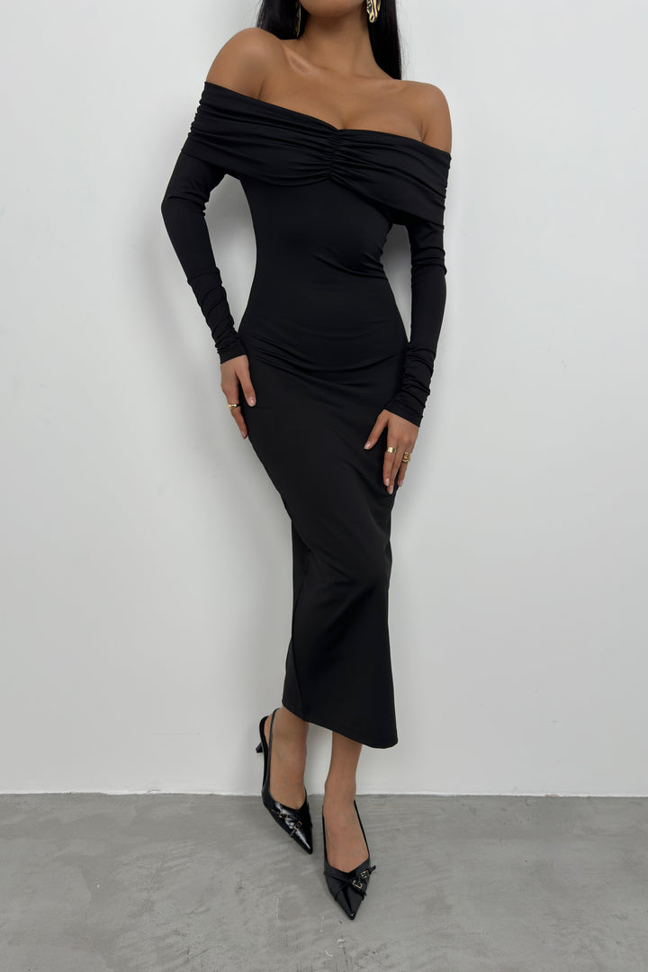 Kayık Yaka Büzgü Detay Siyah Maxi Elbise