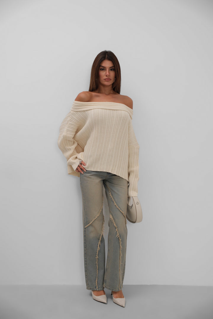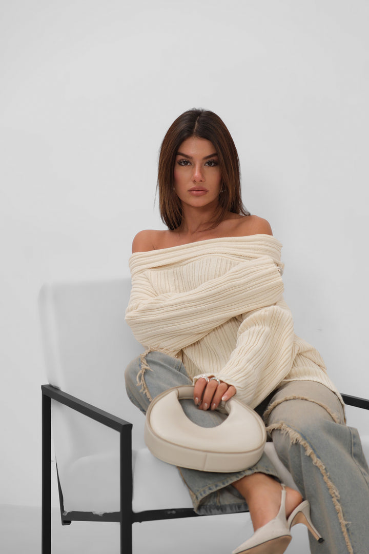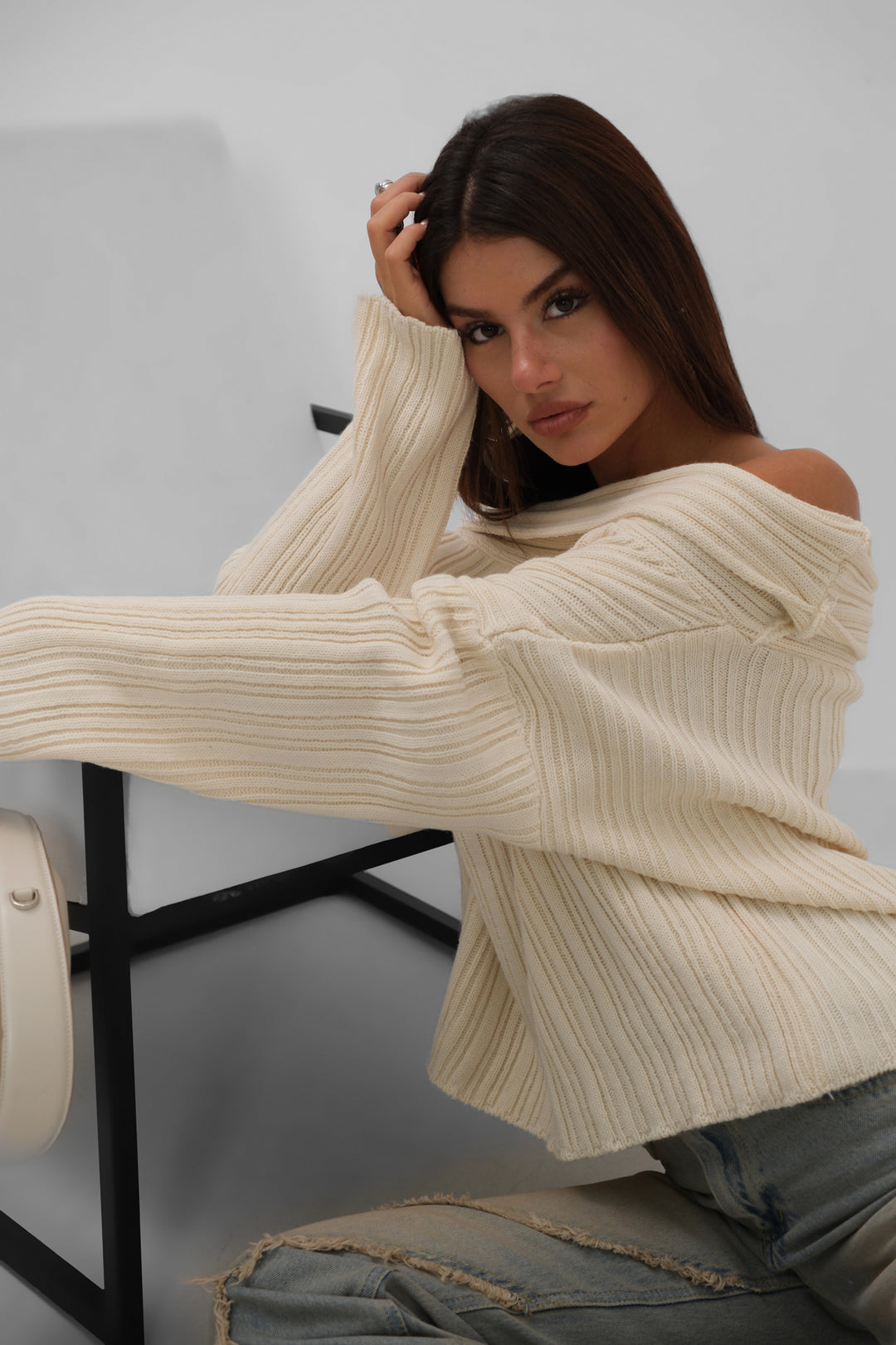 Uzun Kollu, Geniş Manşet, Madonna Yaka, Düşük Omuz, Bluz, Kazak, Fashion, Esnek, Rahat Kalıp