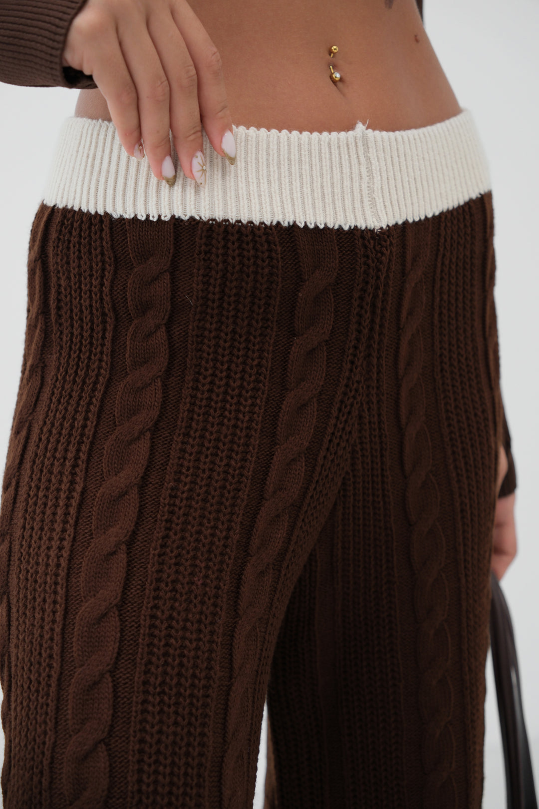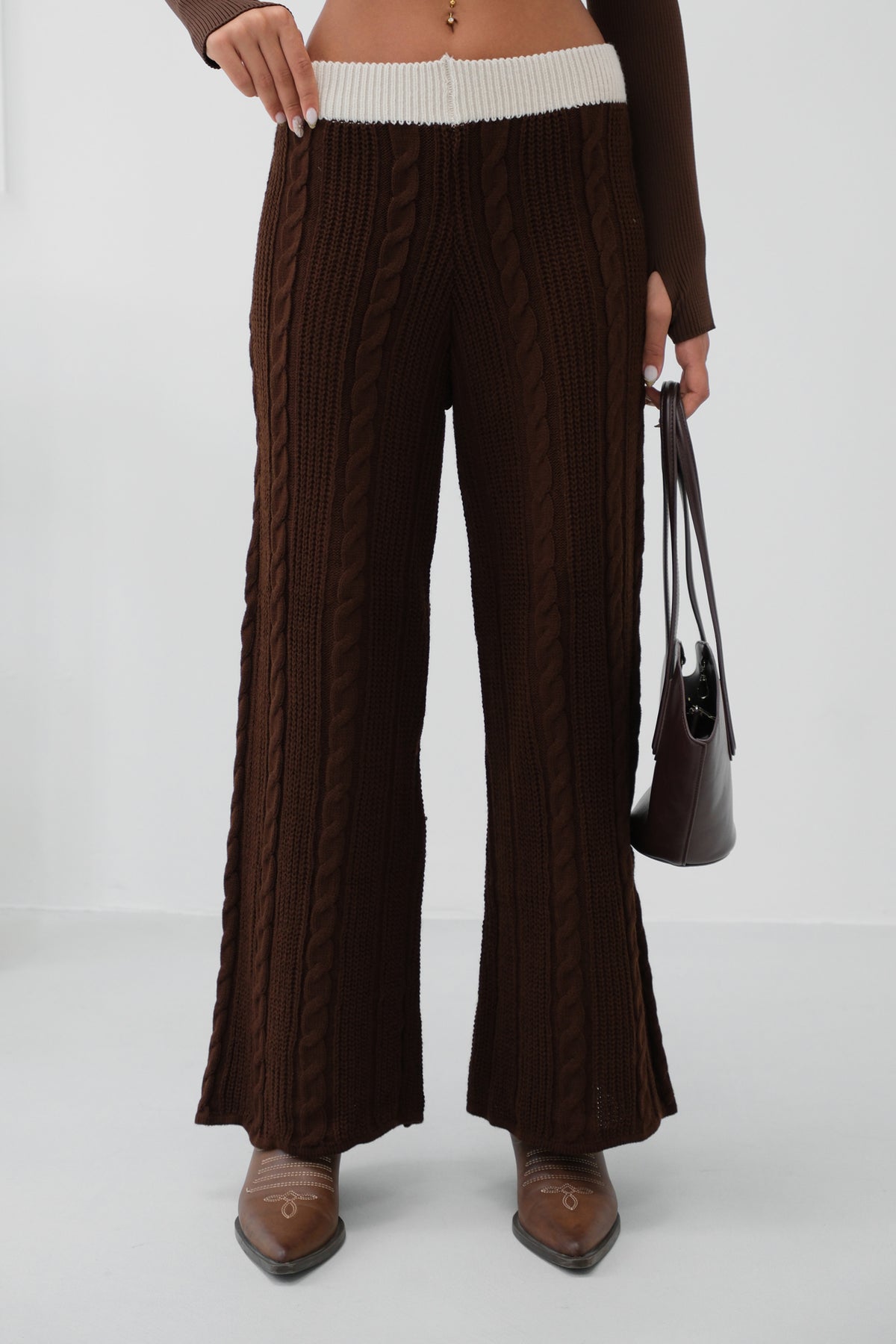Kemer Detay Bol Paça Kahverengi Triko Pantolon