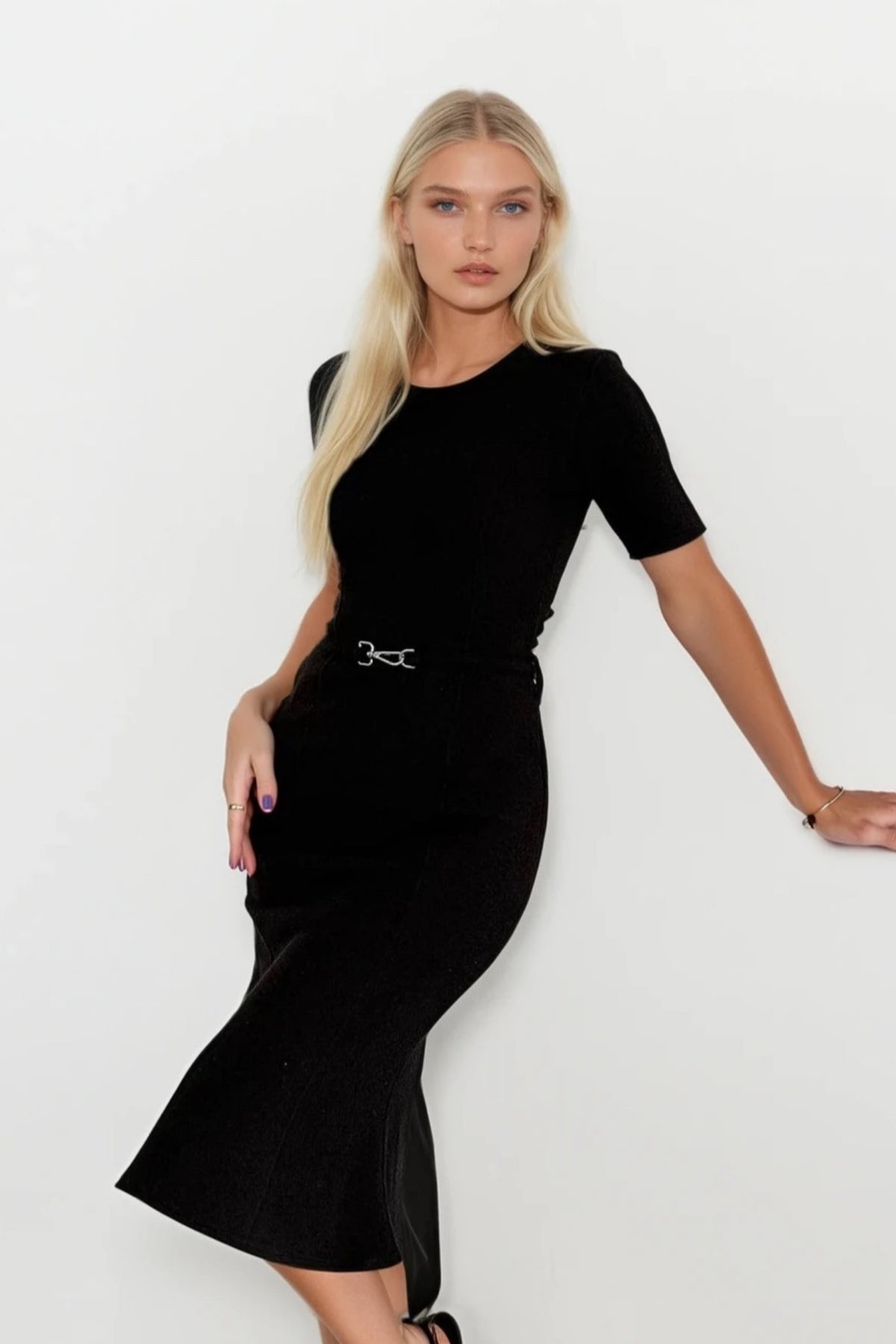Kemerli Kısa Kol Siyah Midi Elbise