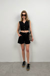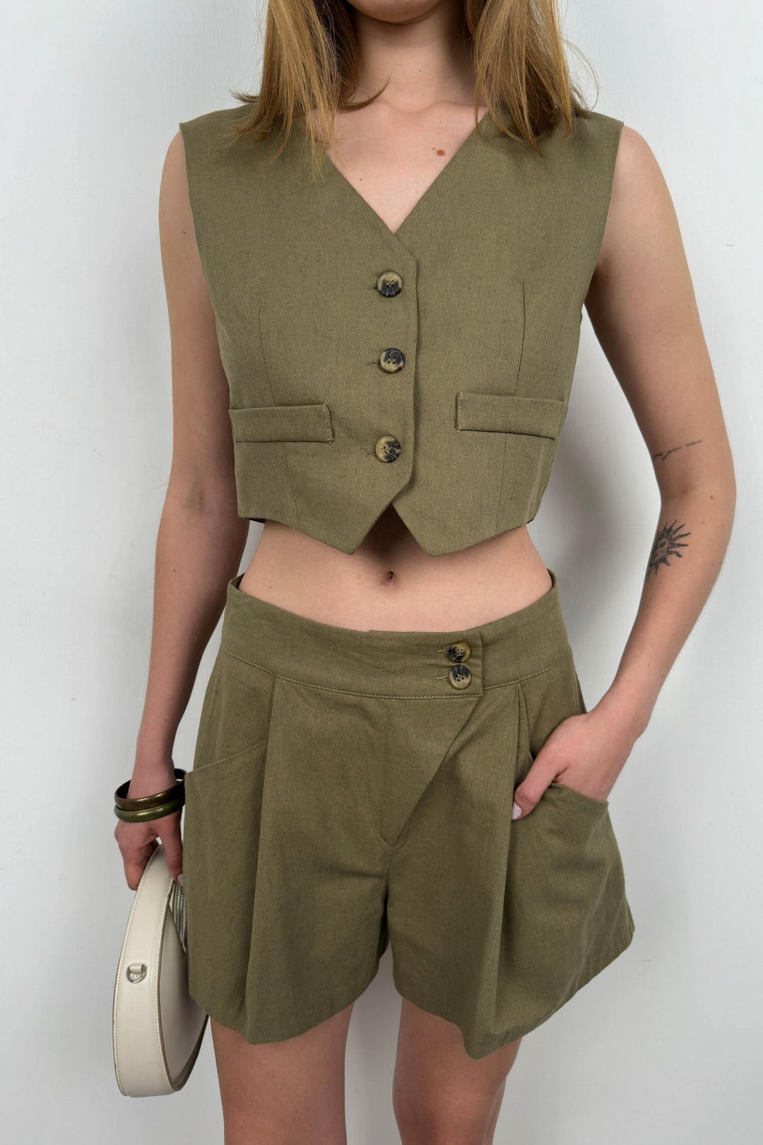 Keten, Crop, Yelek ve Normal Bel Şort Takım