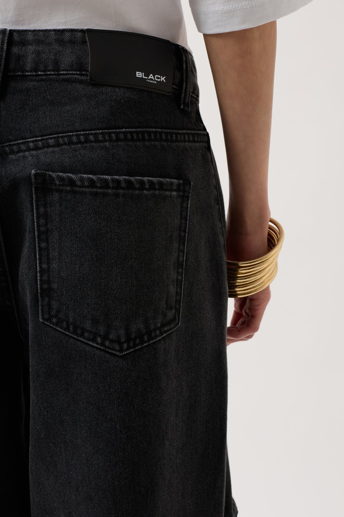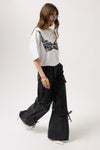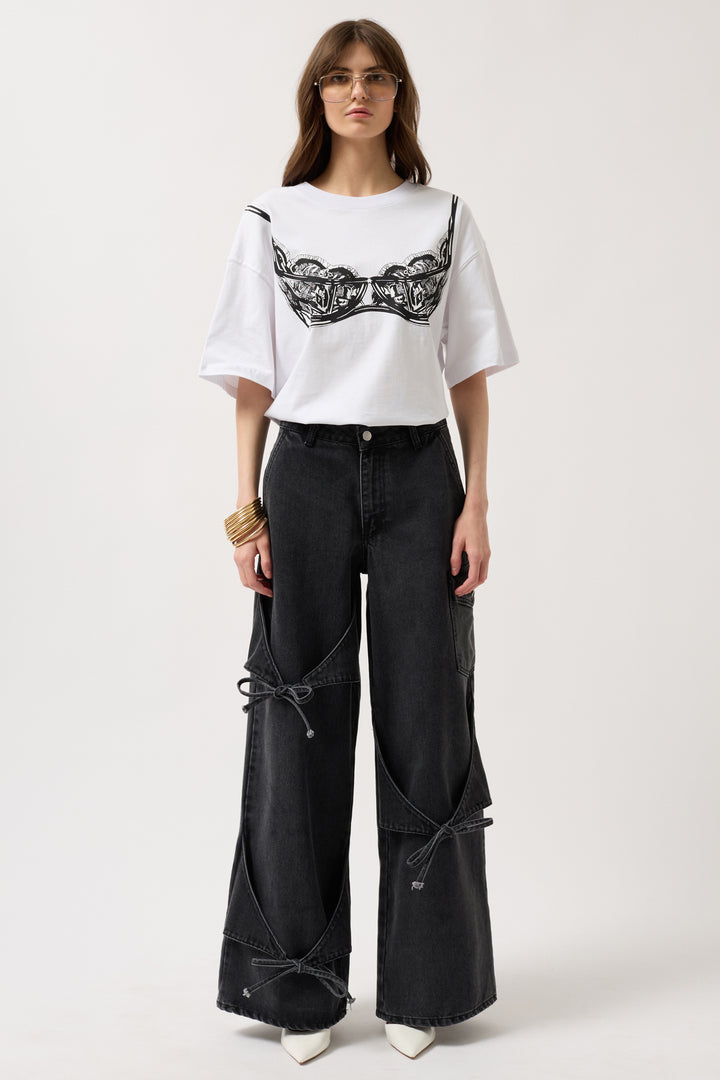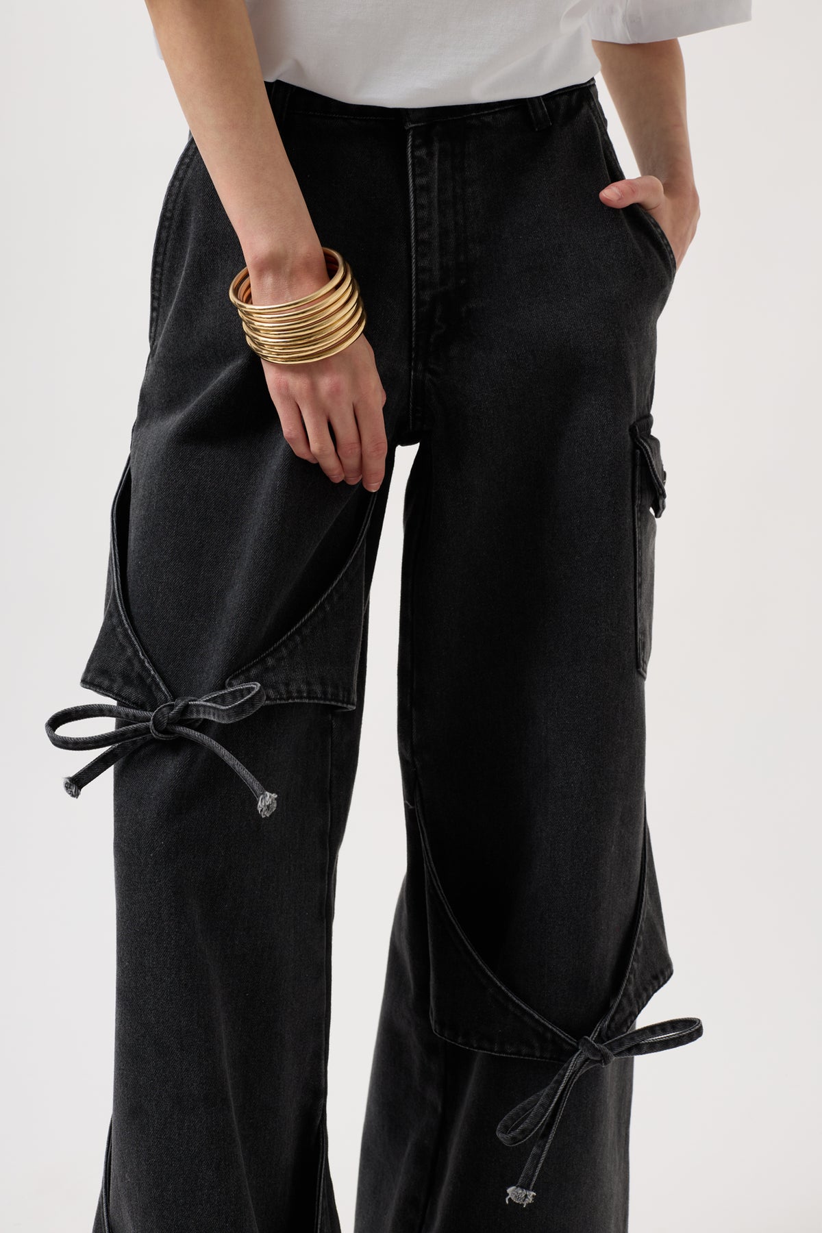 Kurdele Detay Kargo Cep Geniş Paça Siyah Jean