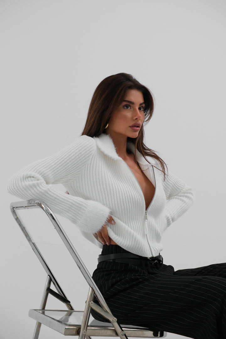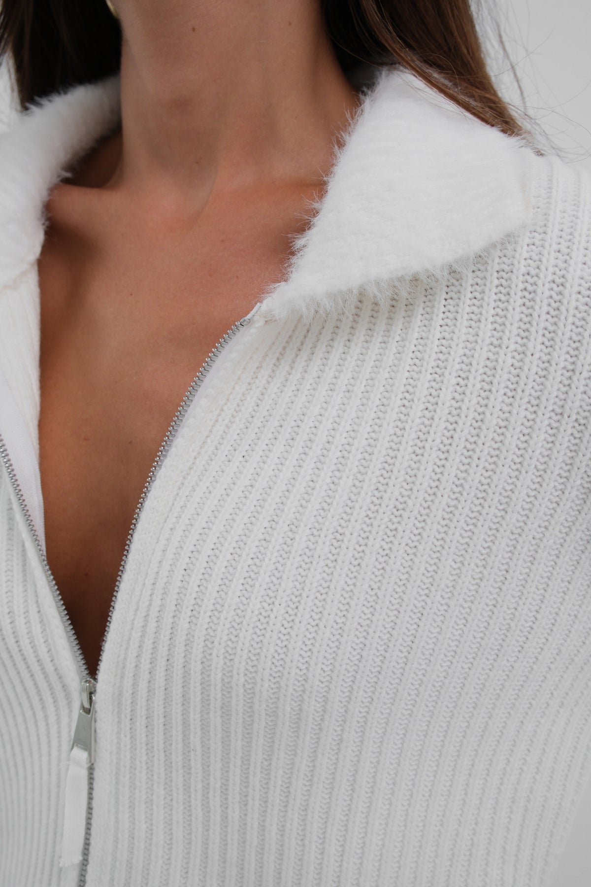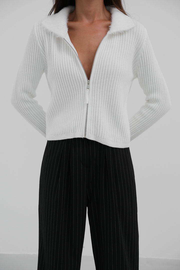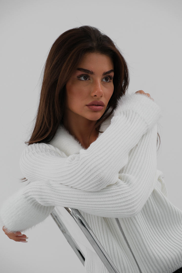 Kürk Detaylı Fermuarlı Ekru Triko Hırka