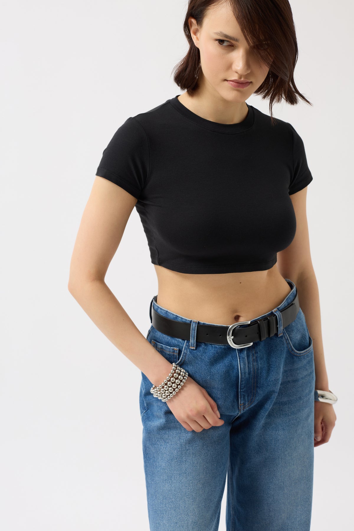 Likralı Pamuklu Kumaş, Kısa Kol Crop Tişört