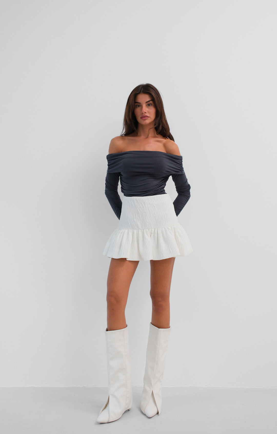 Omuz Dekolte Straplez Gri Bluz