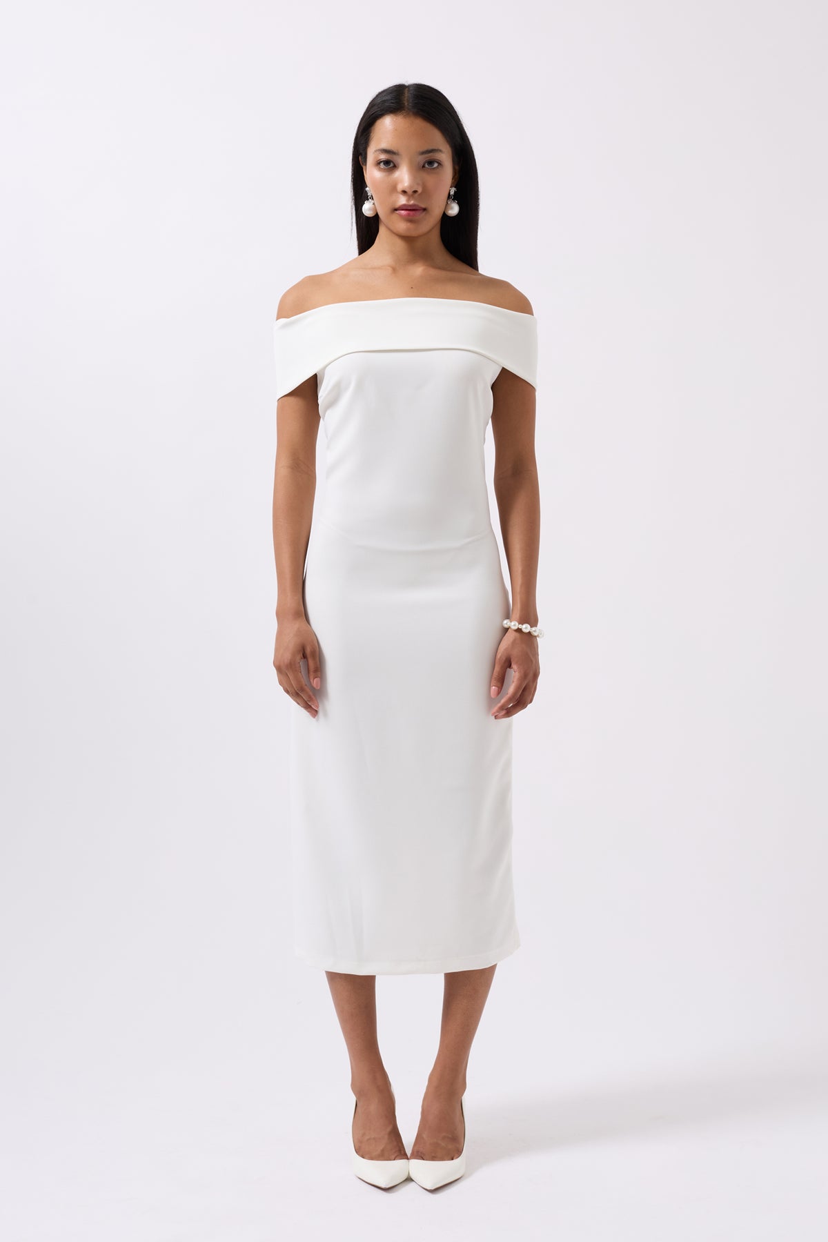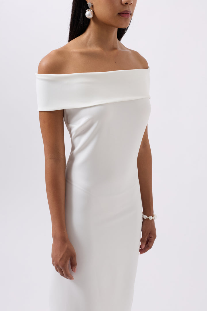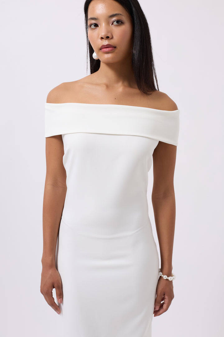 Omuz Katlama Detay Maxi Beyaz Elbise