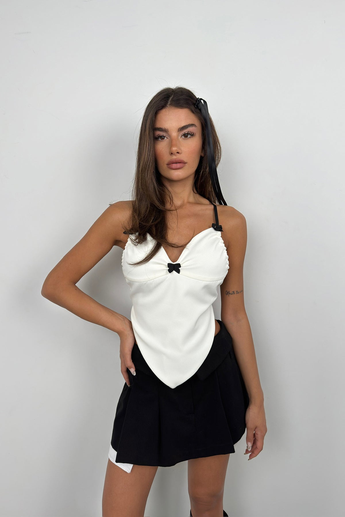 Ön Büzgü Detay Sirt Baglamali Beyaz Bluz