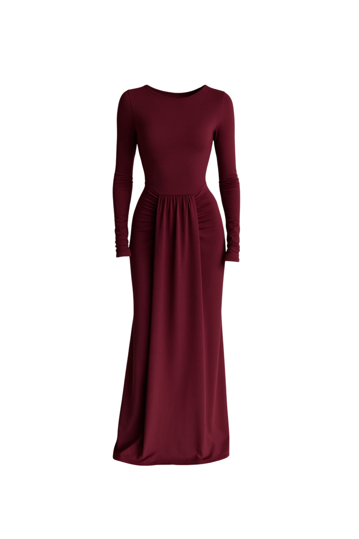 Önü Büzgülü Bordo Maxi Elbise