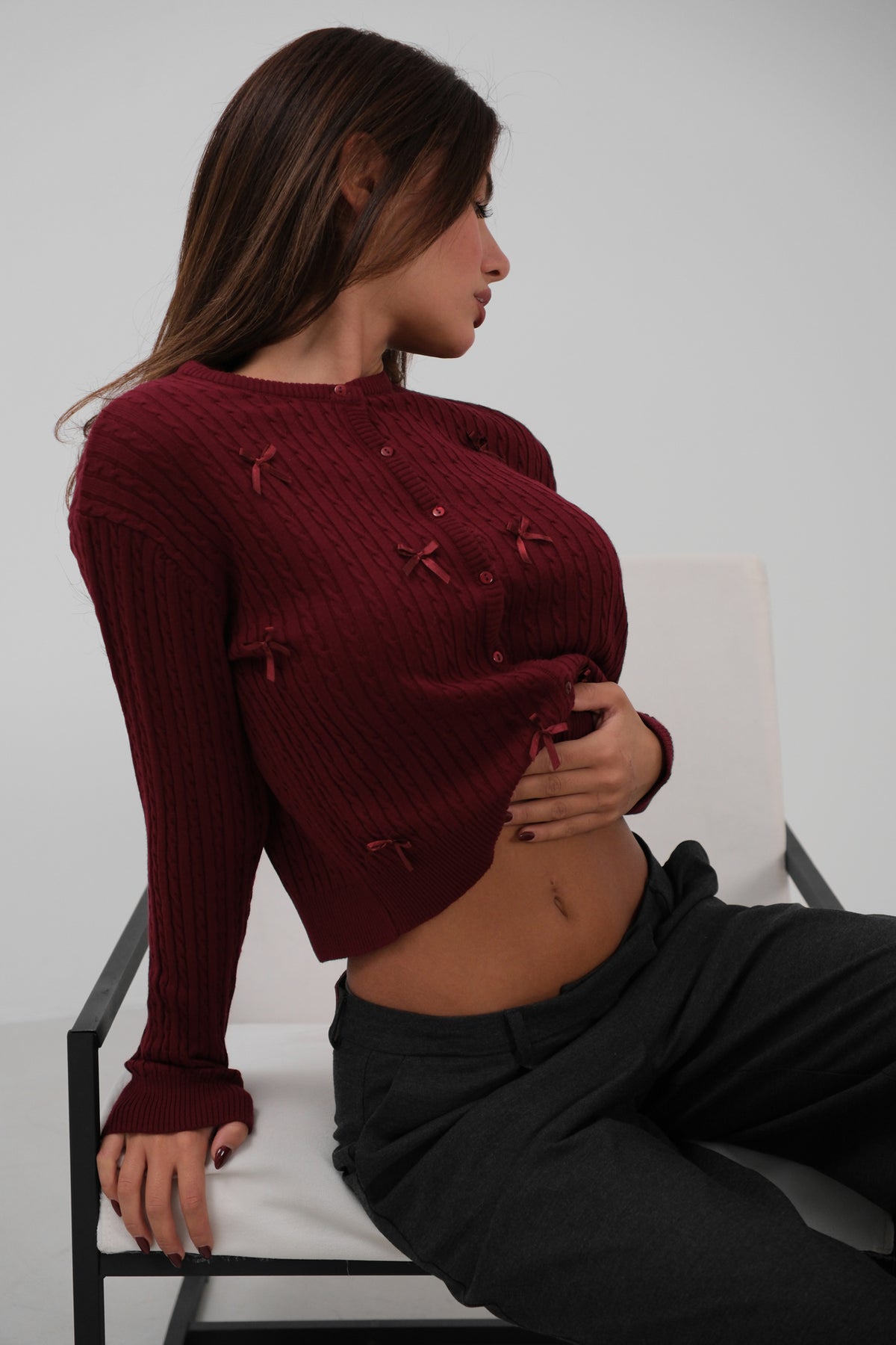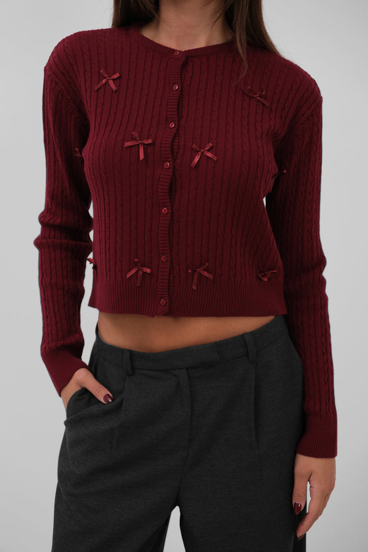 Örgü Detaylı, Sıfır Yaka, Önü Düğme Detaylı, Fiyonk Detaylı, Uzun Kollu, Yumuşak Dokulu, Fitilli Triko Kazak, Hırka