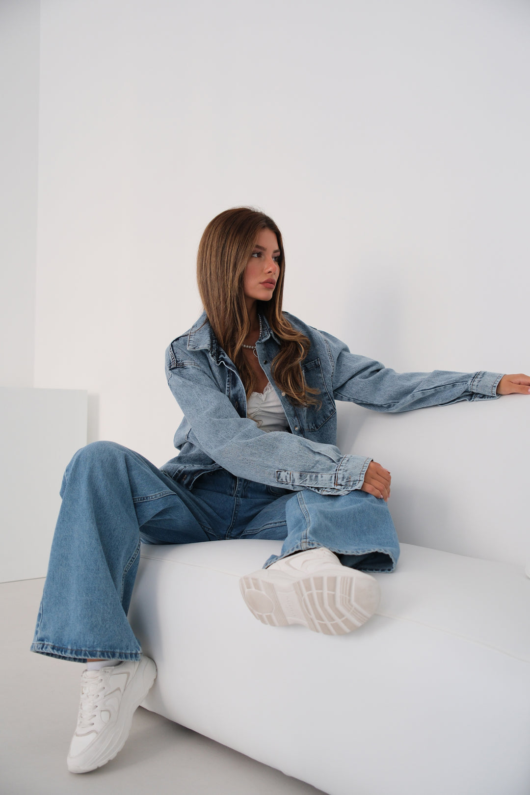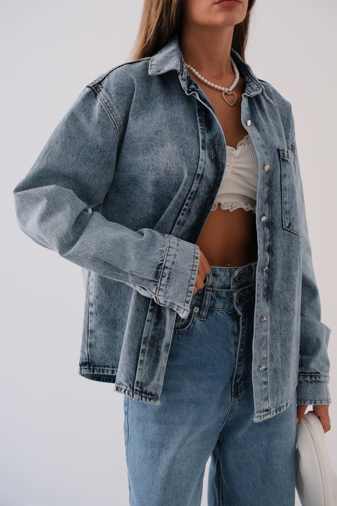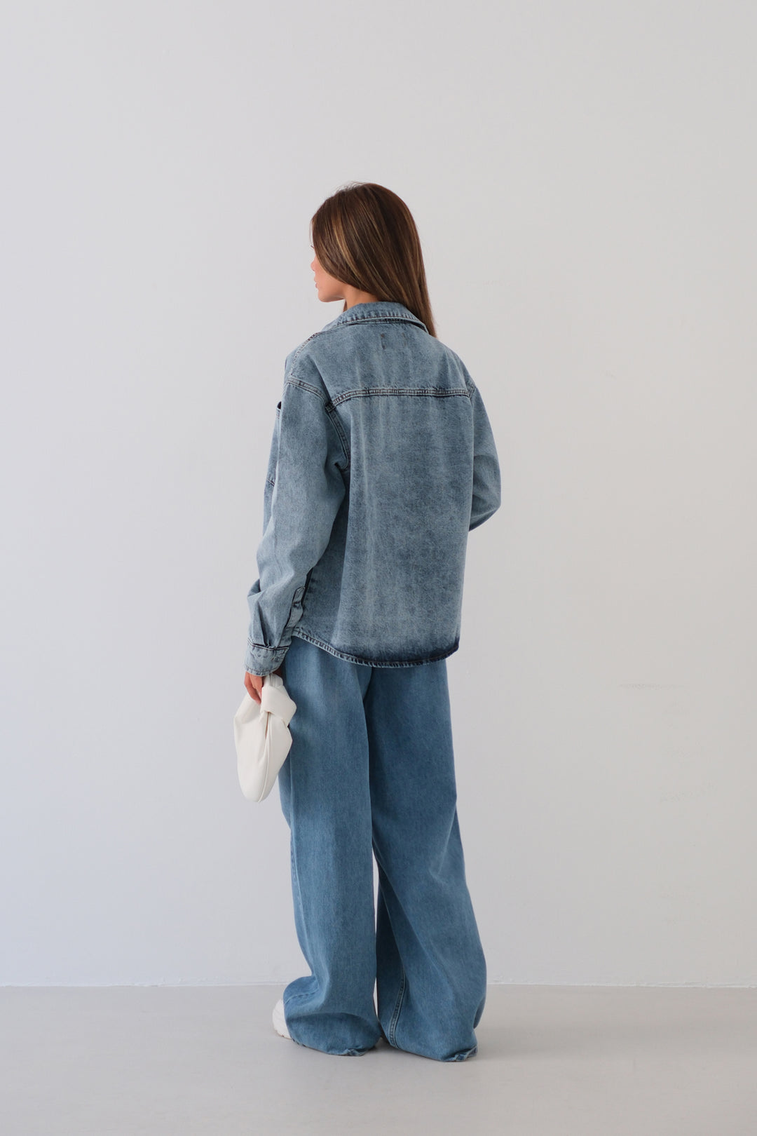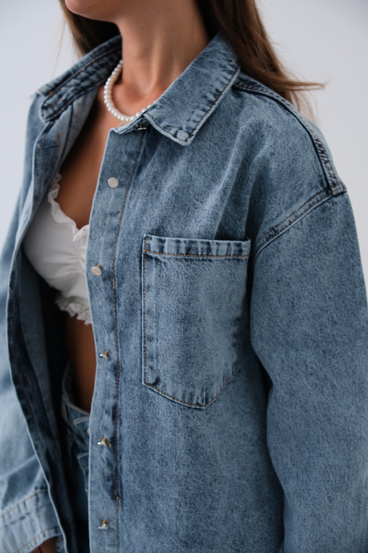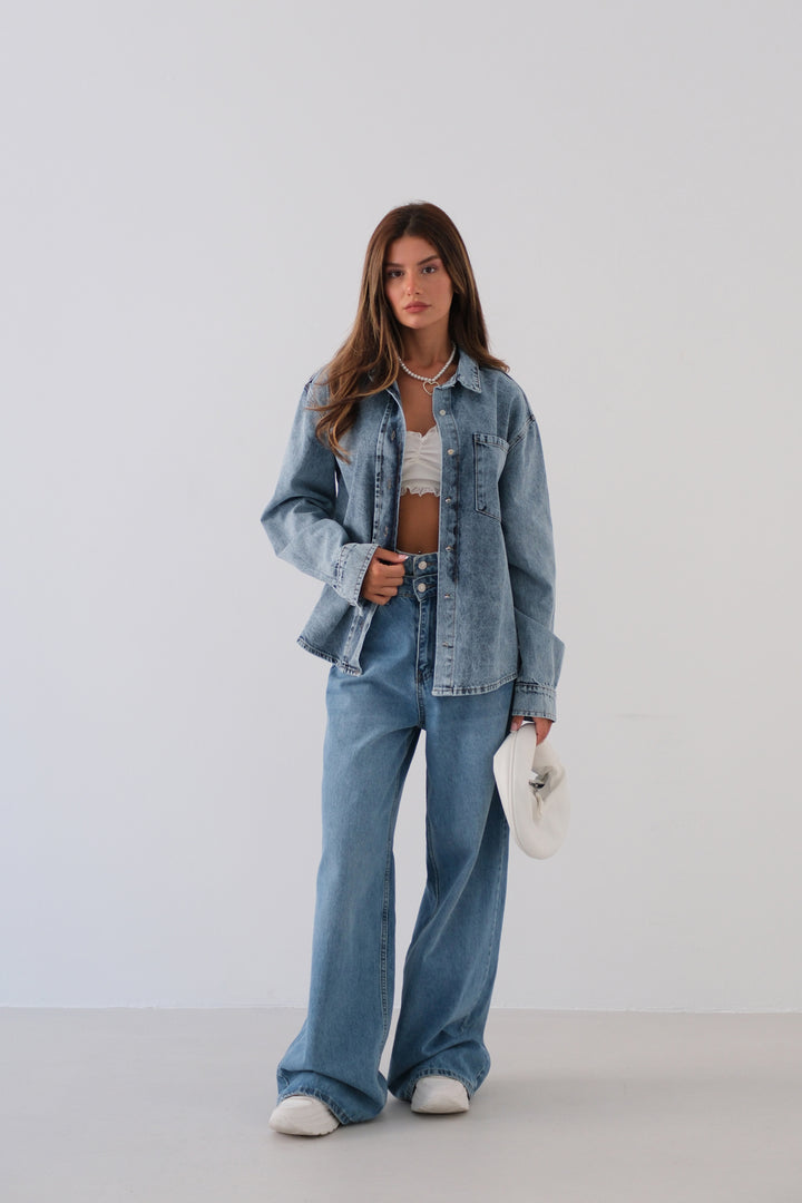 Uzun Kollu, Gömlek Yaka, Önü Düğmeli, Normal Boy, Oversize Denim Gömlek