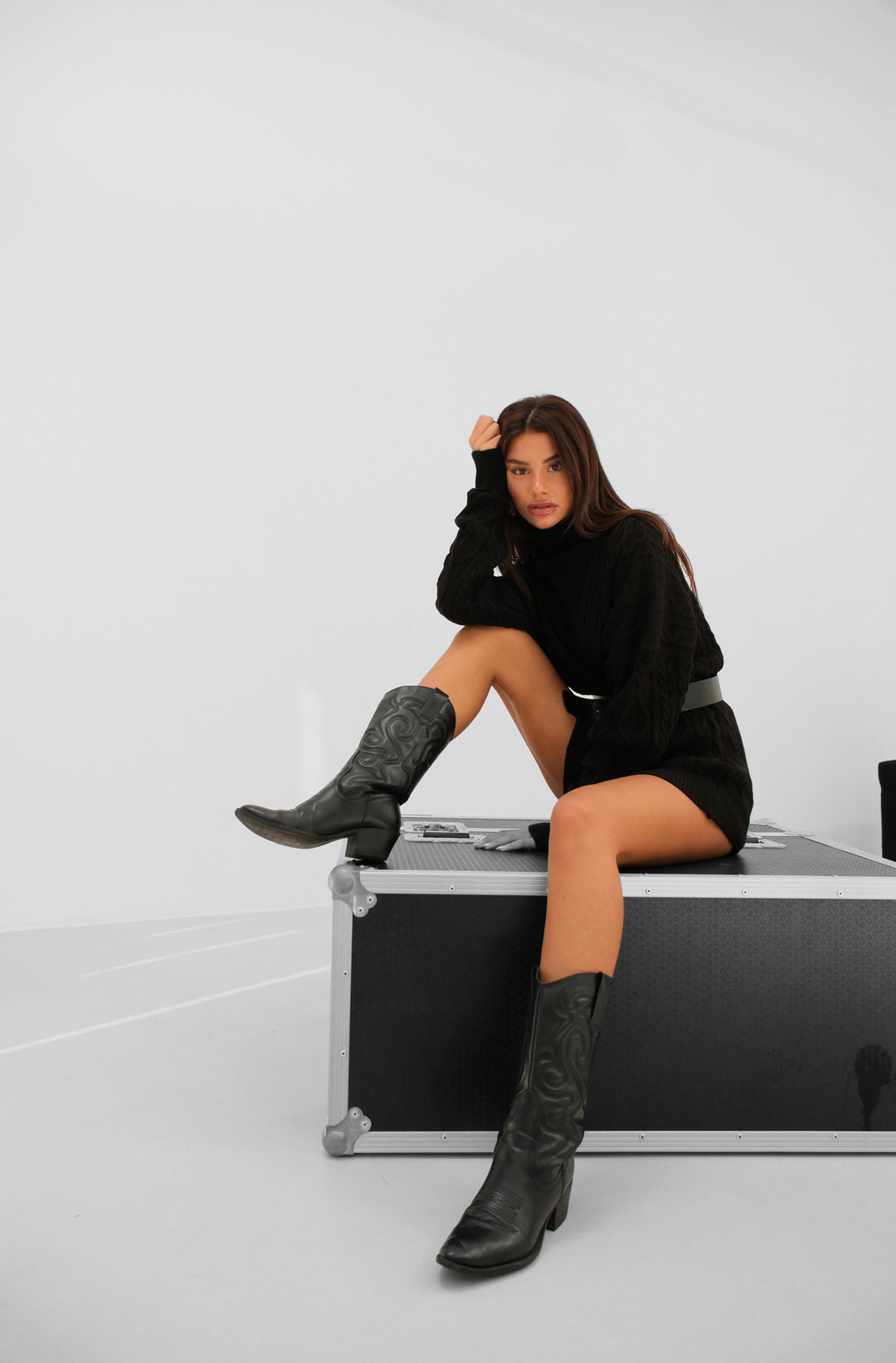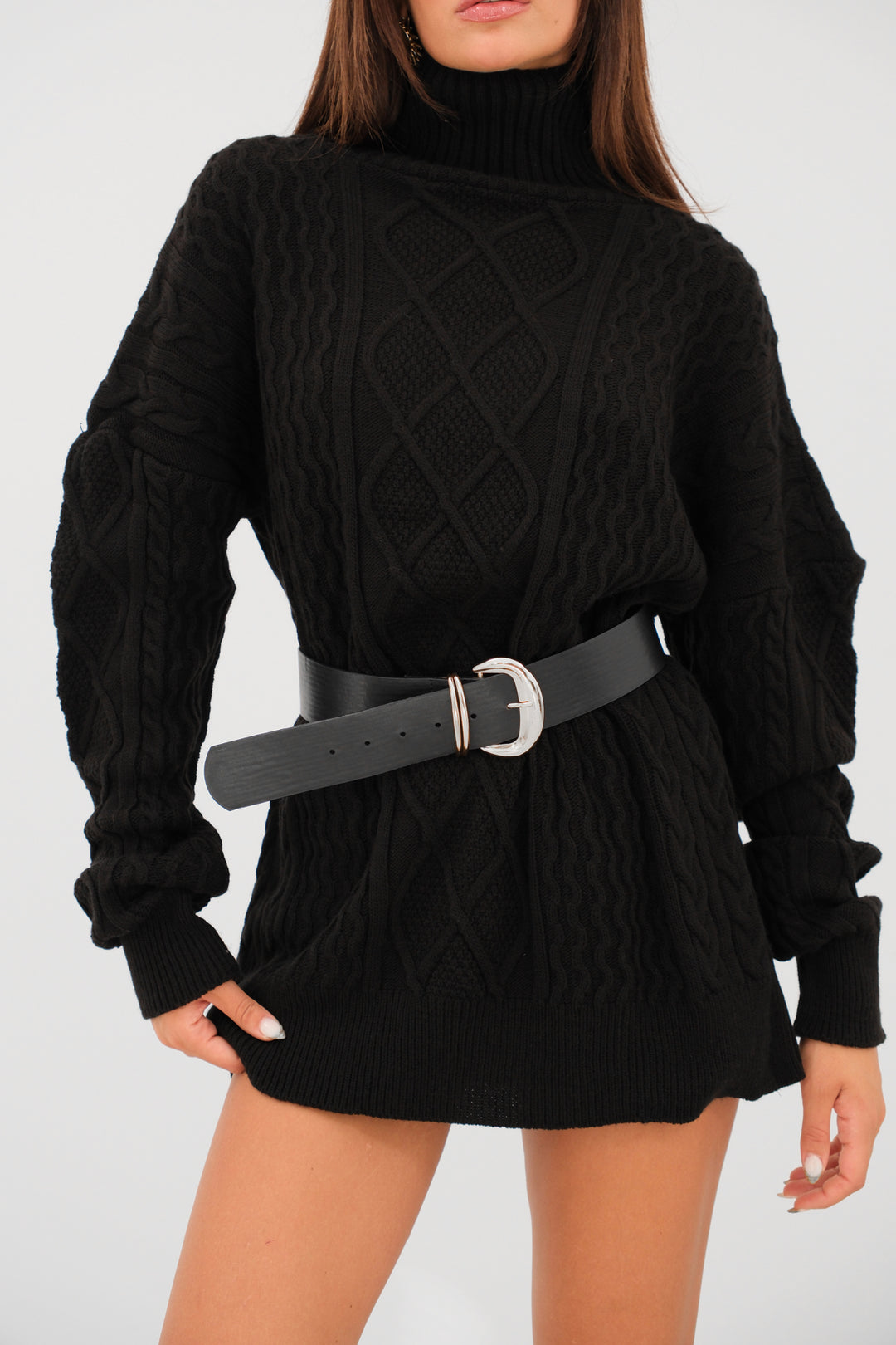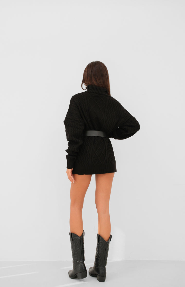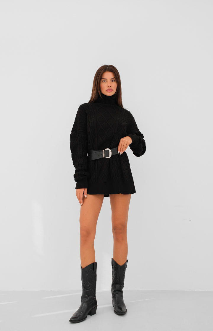 Oversize Boğazlı Siyah Örgü Kazak