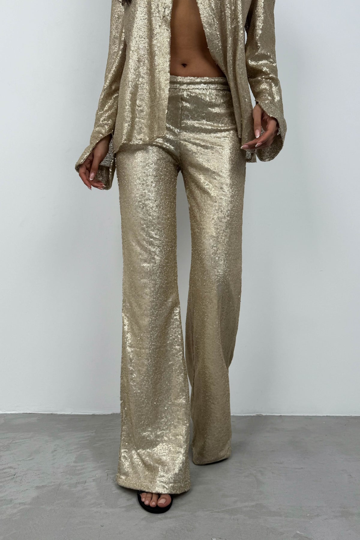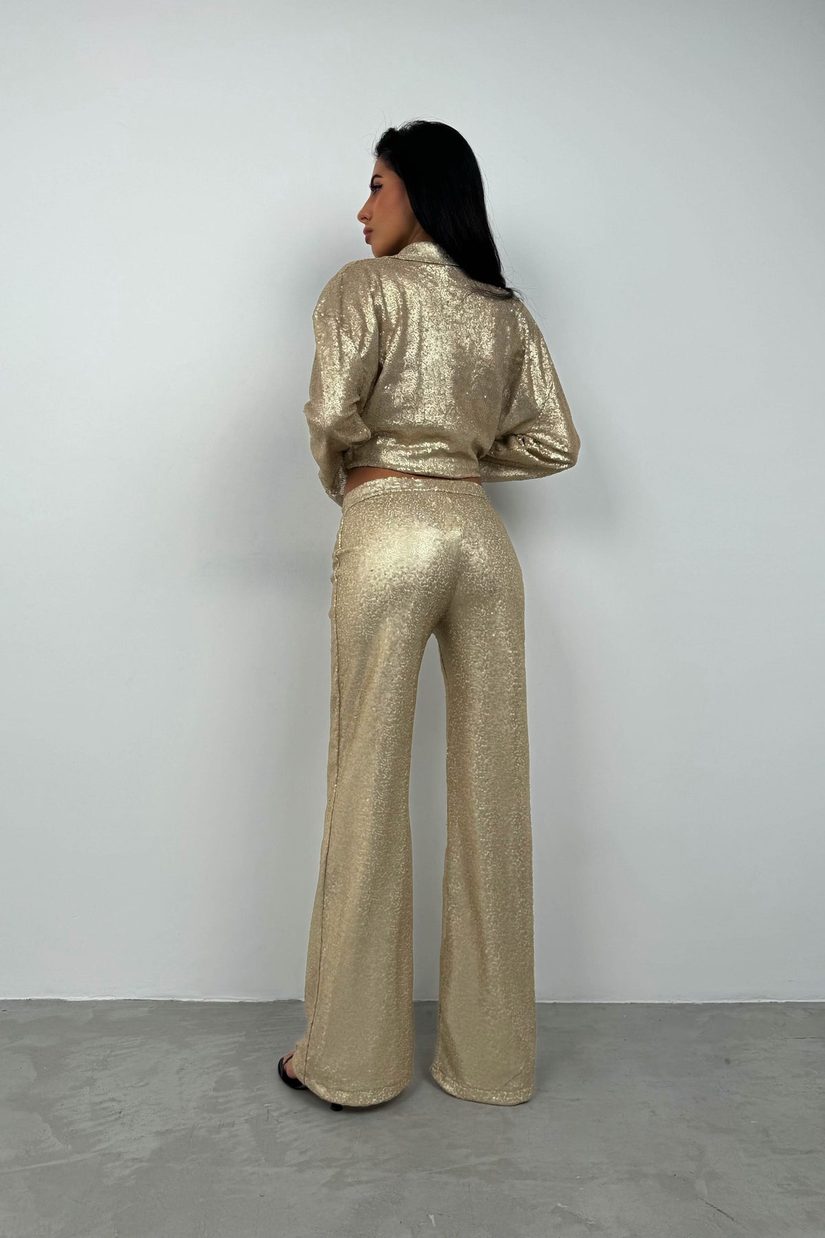 Payetli Wide Leg Gold Pantolon