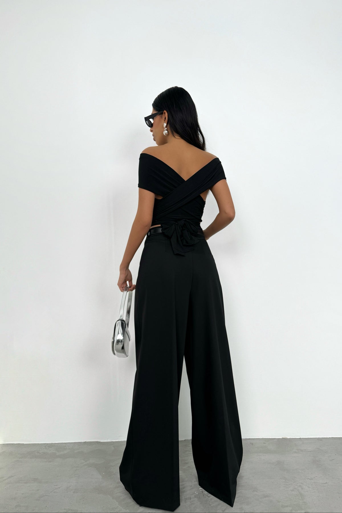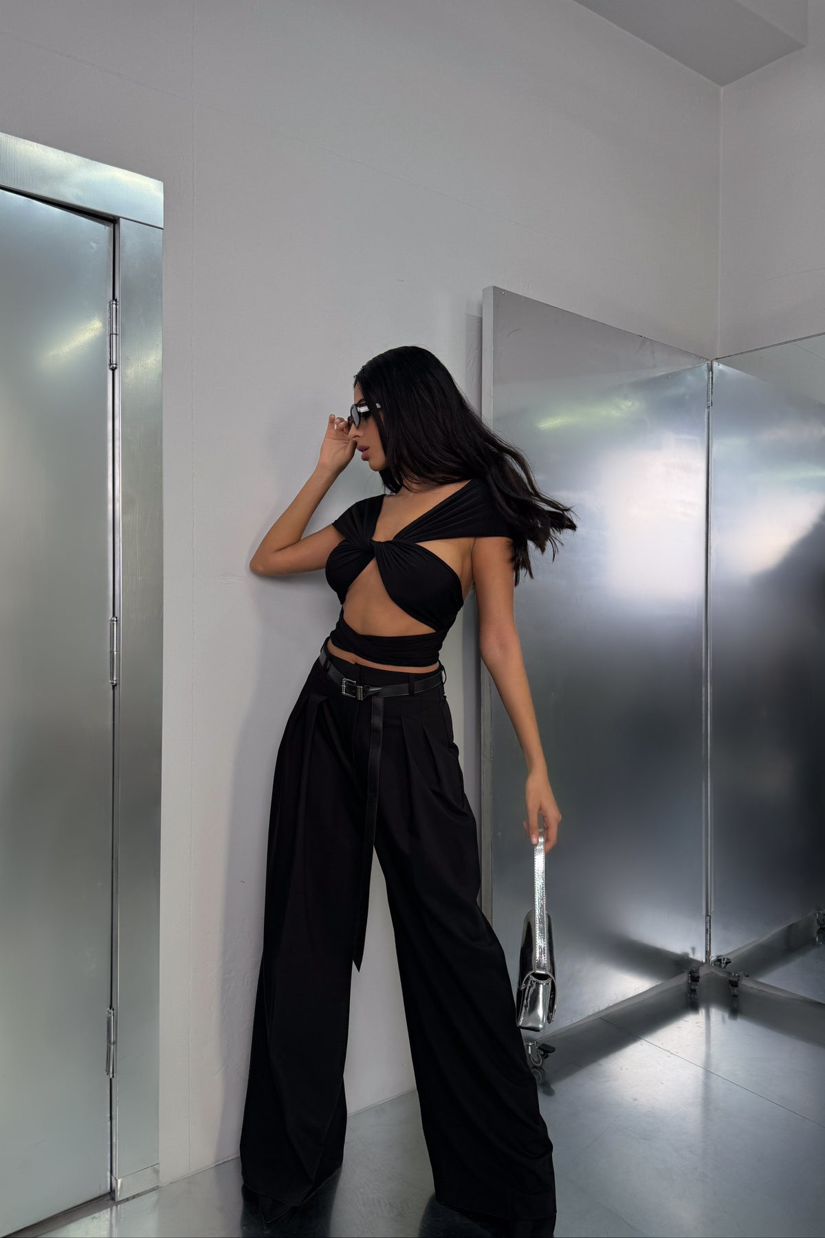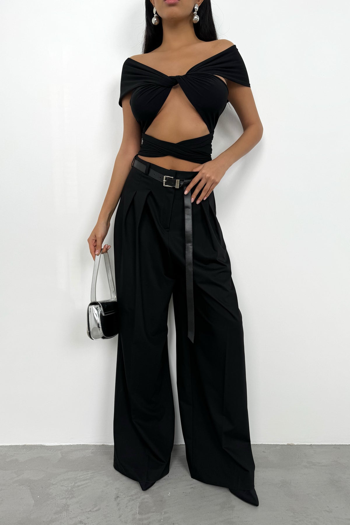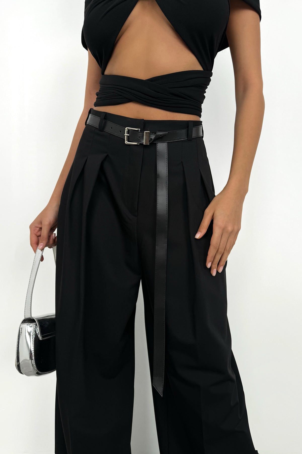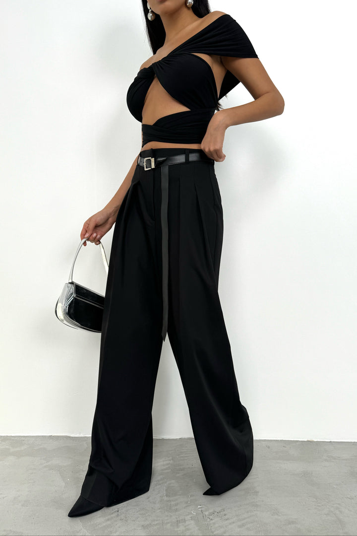 Pile Detay, Yüksek Bel, Bol Paça, Kemerli, Pantolon