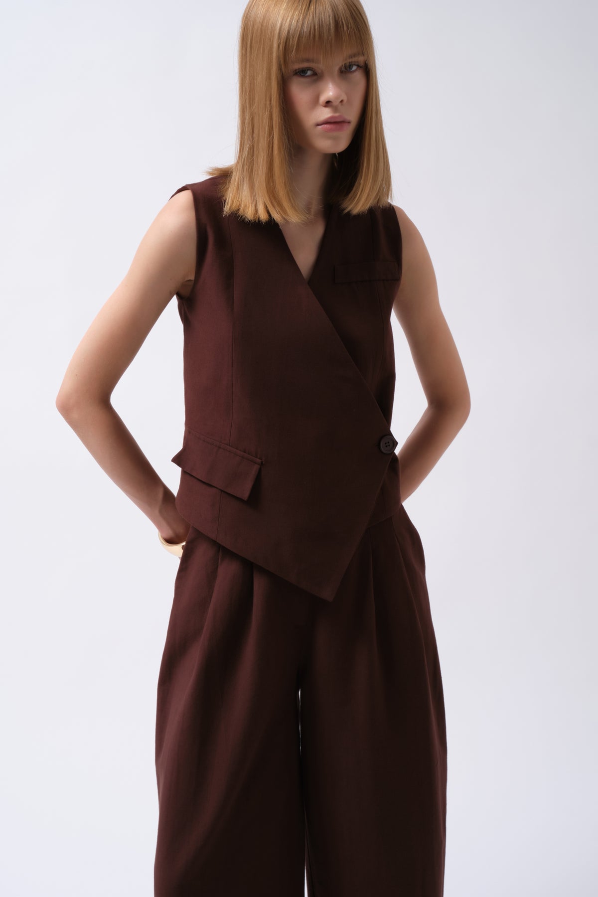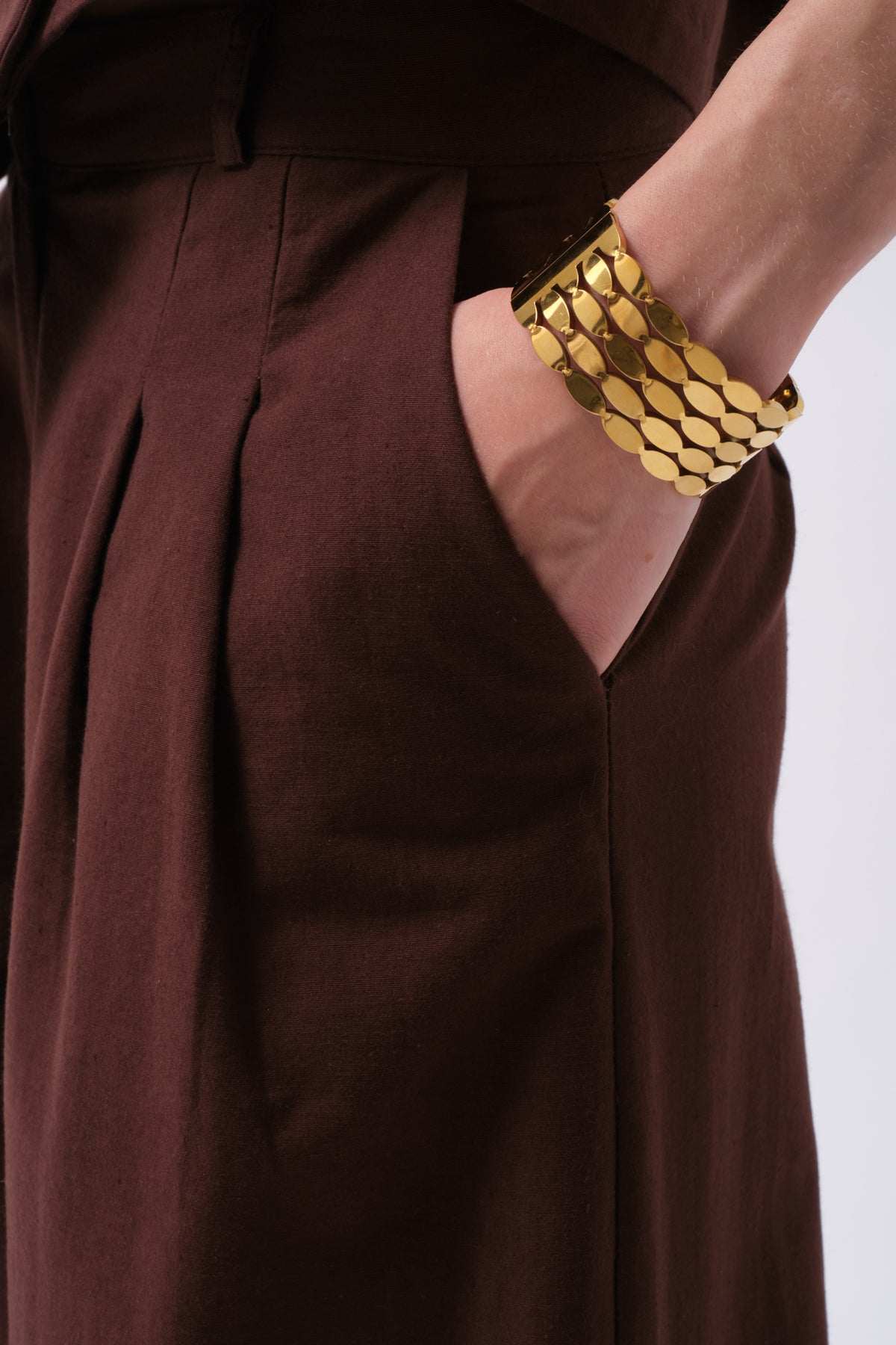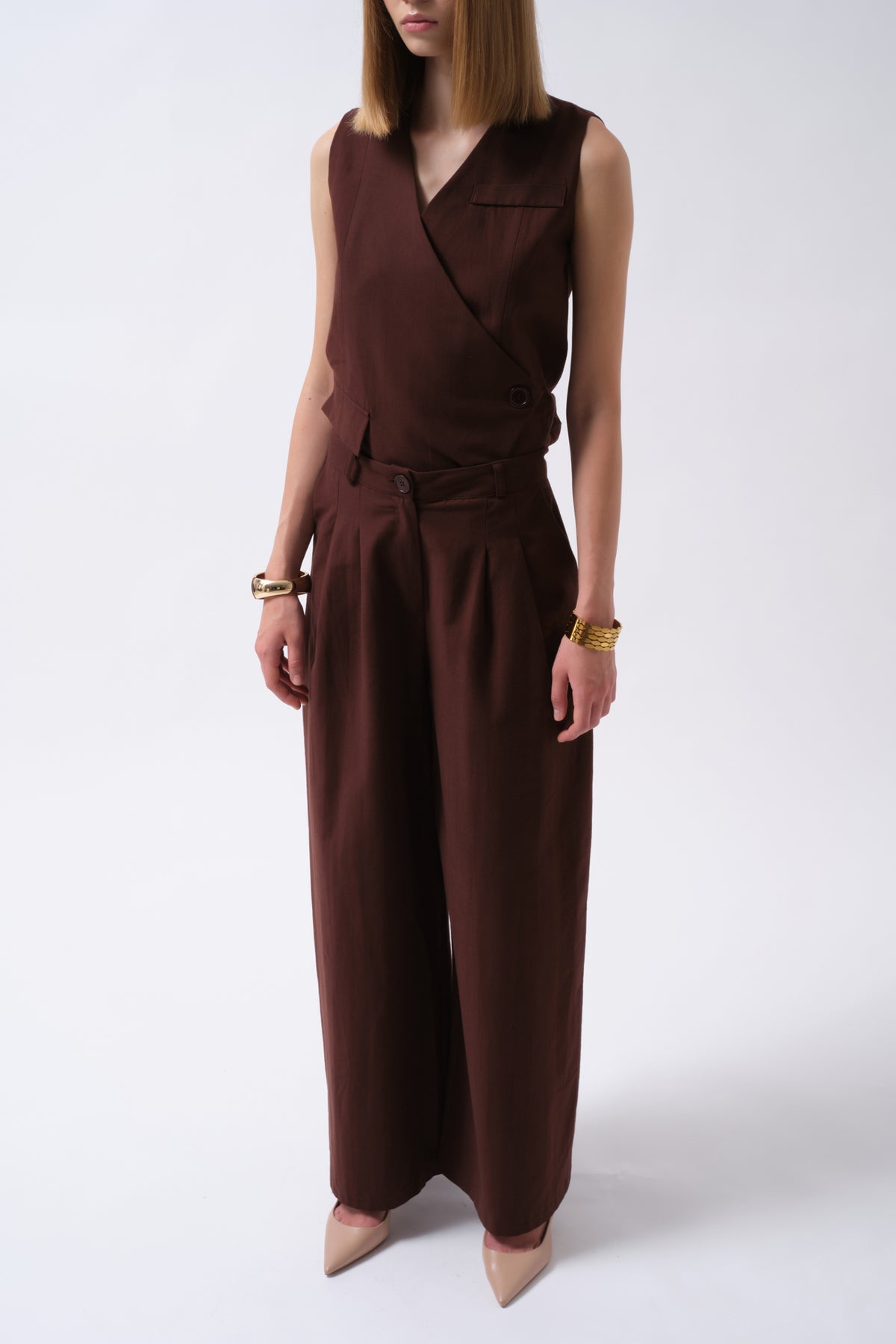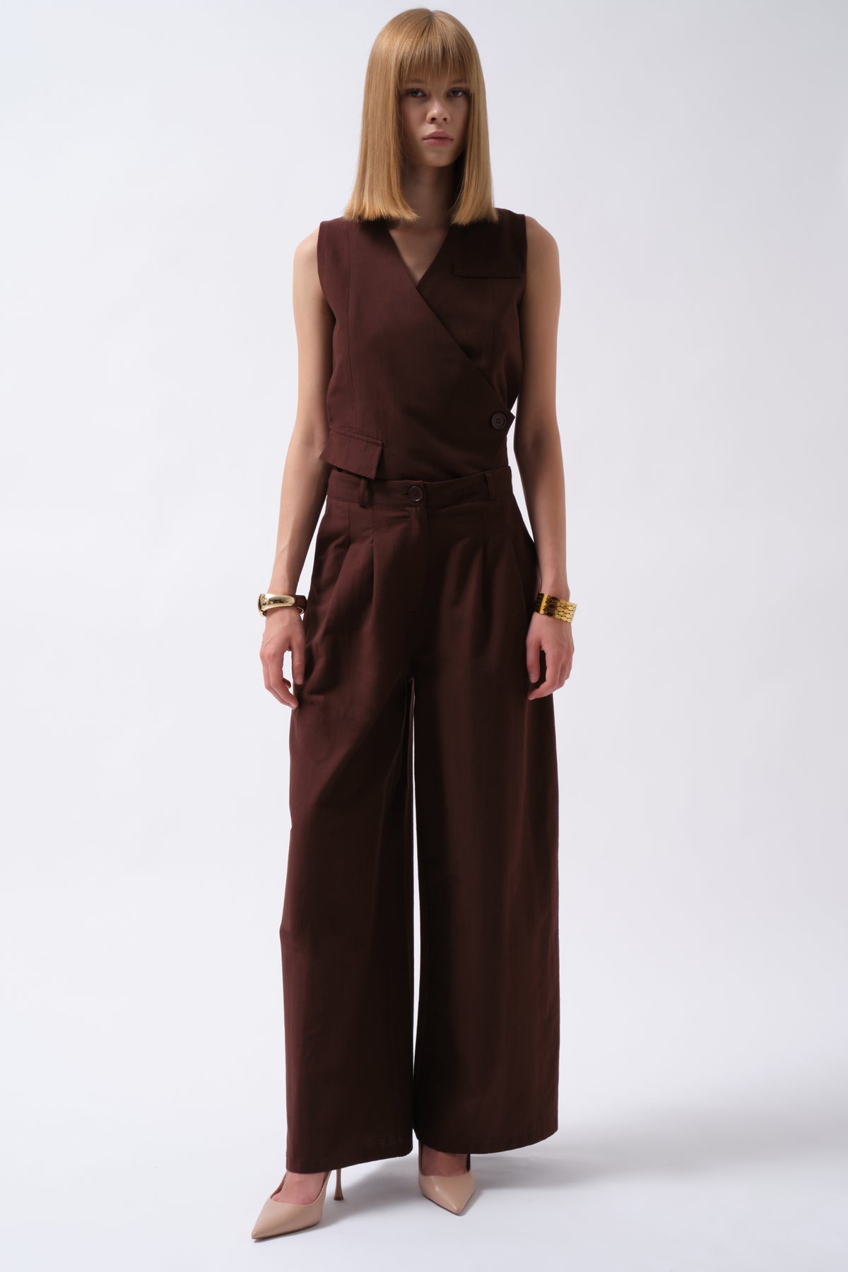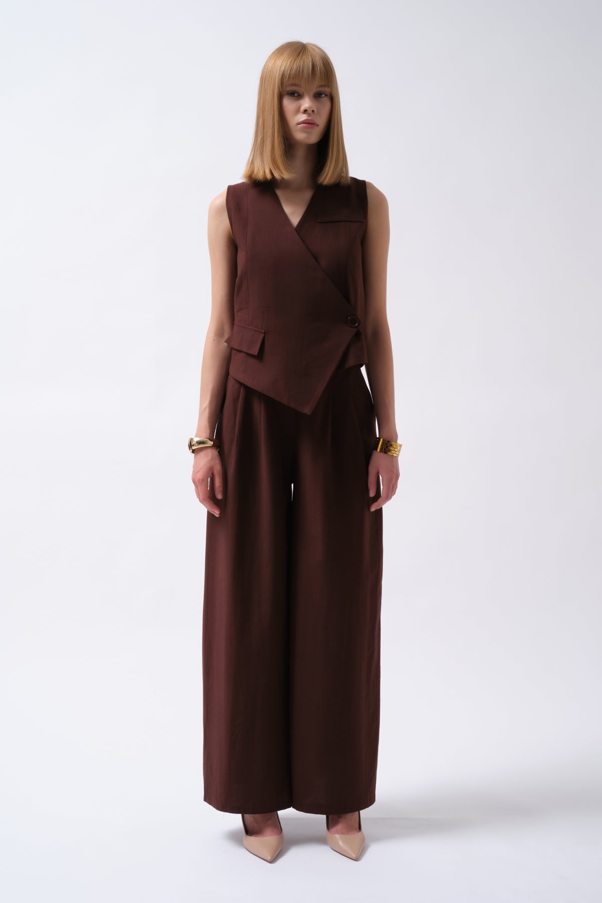 Pileli Geniş Paça Keten Kahverengi Pantolon