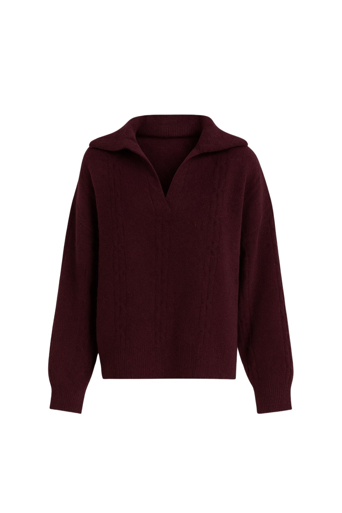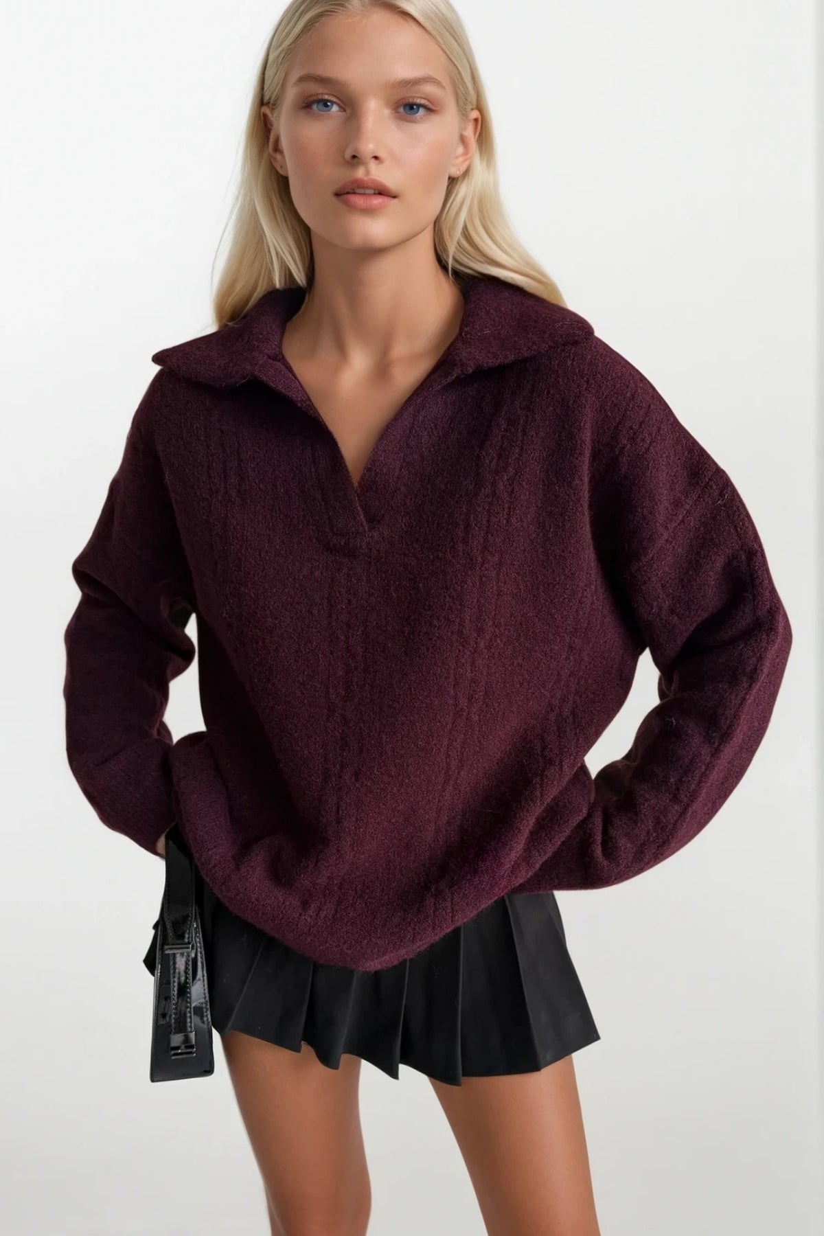 Polo Yaka Örgü Desen Bordo Triko Kazak