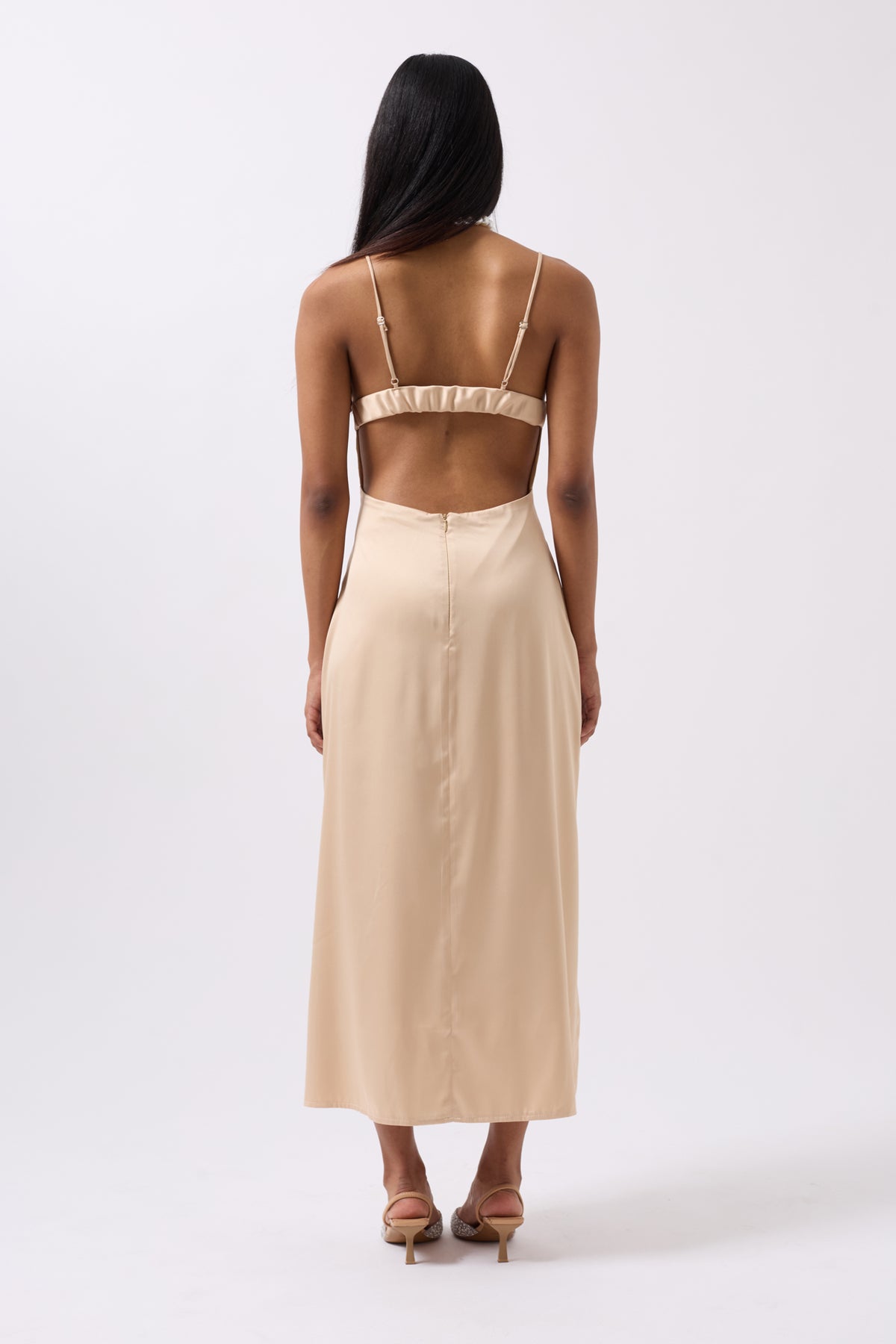 İnce Ayarlanabilir Askılı, Sırt Lastik Detaylı, Gizli Fermuarlı Maxi Elbise