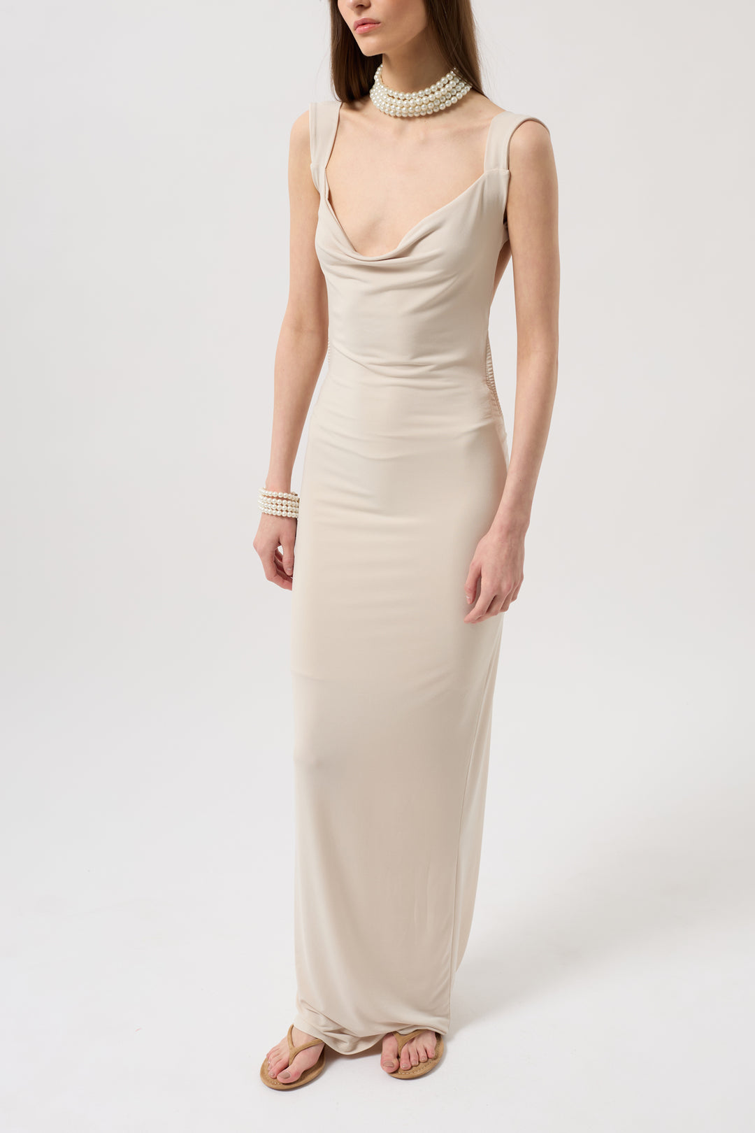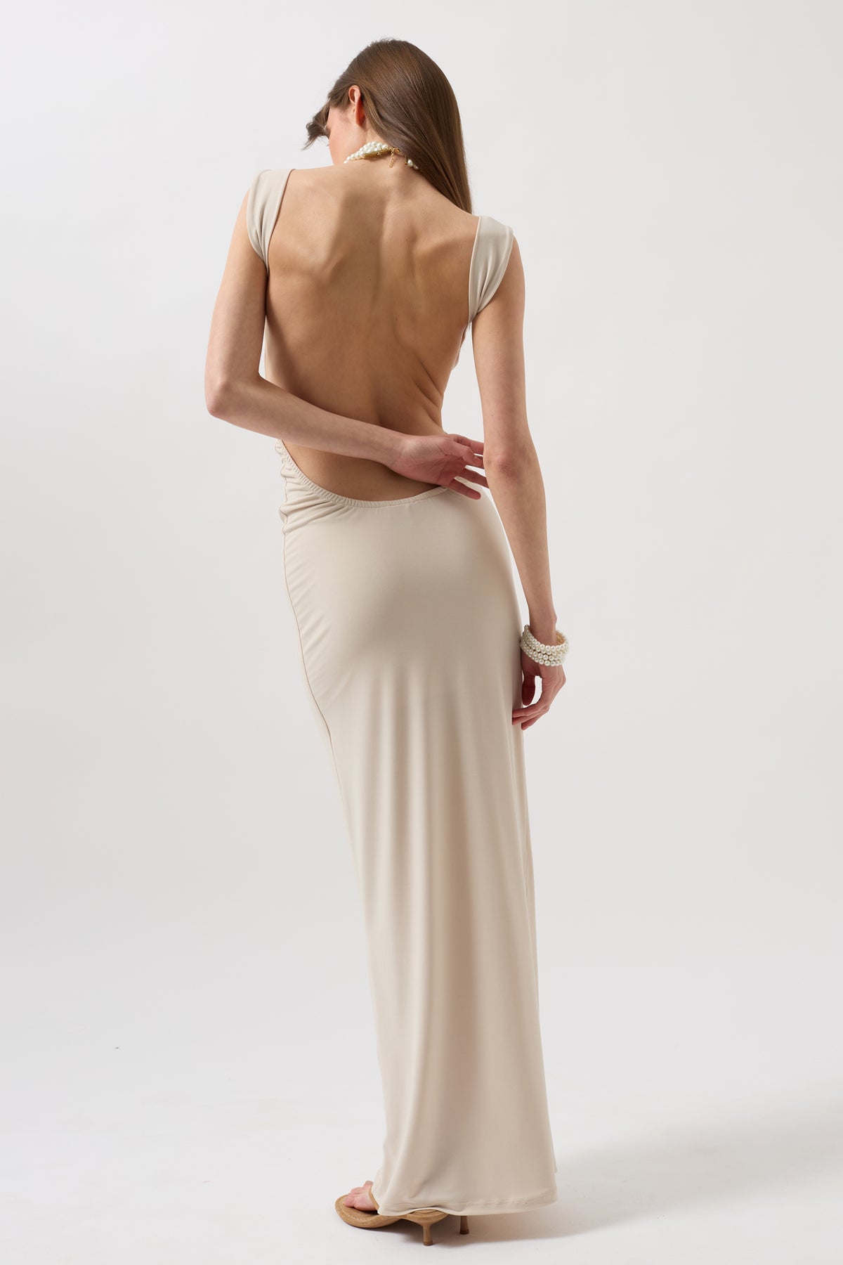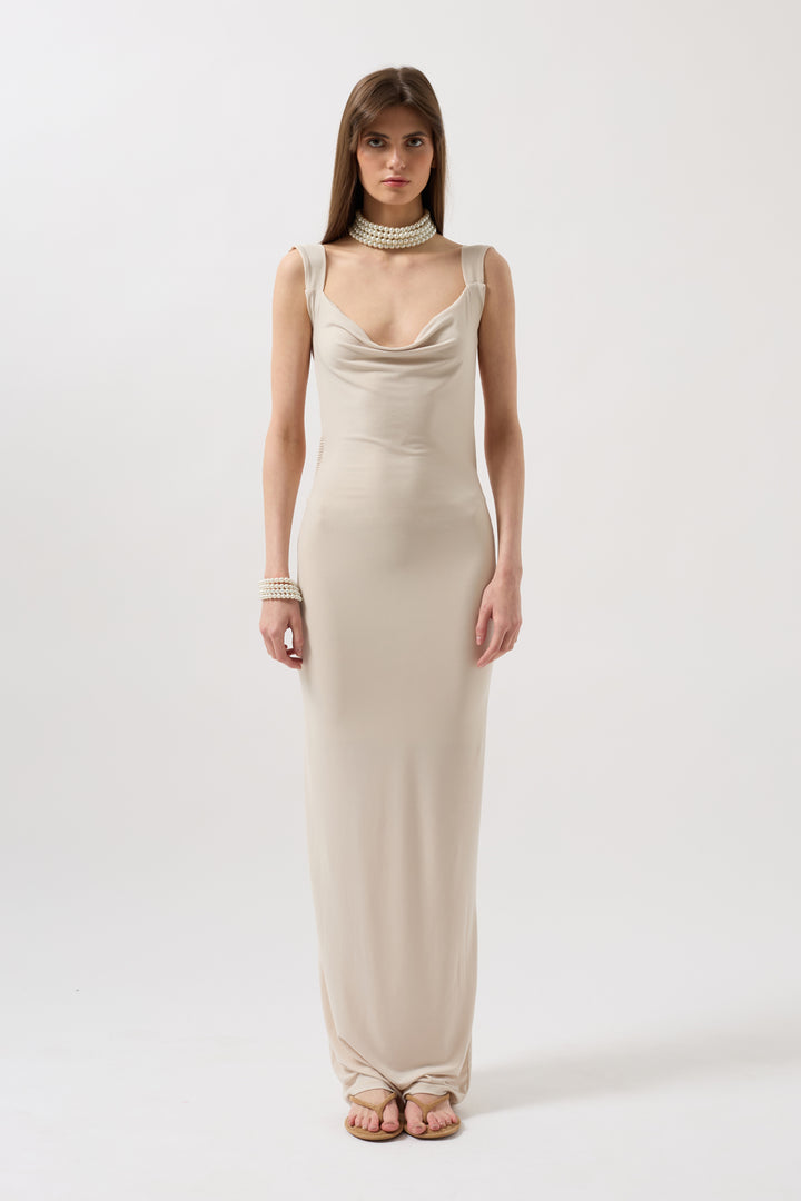 Sırt Dekolte Maxi Bej Elbise