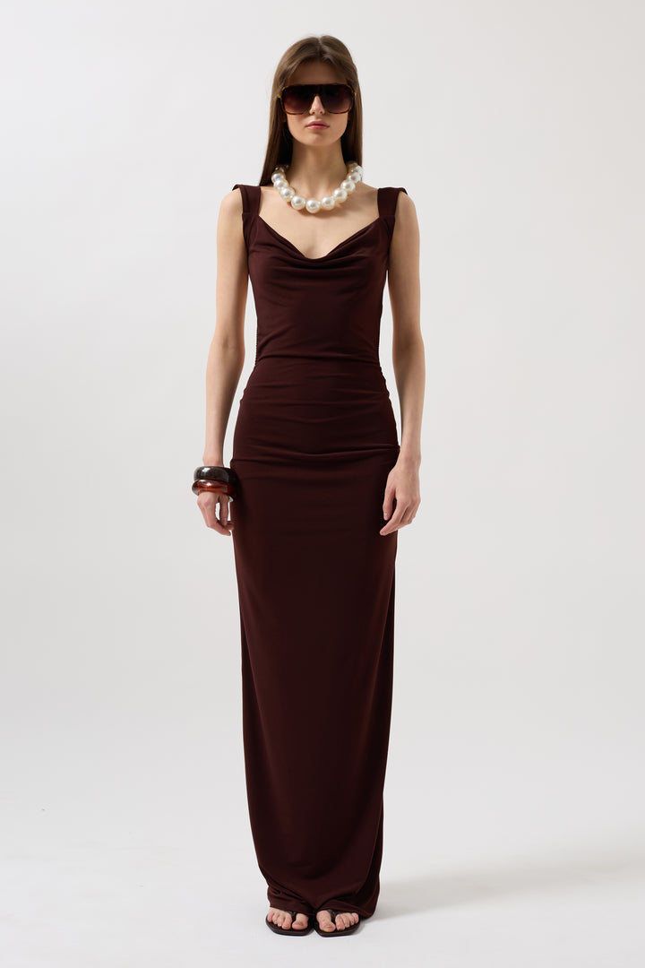 Kalın Askılı, Astarlı, Önü Hafif Degaje Yaka Görünümlü, Sırt Lastikli, Likralı Ve Esnek Kumaşlı Uzun Elbise