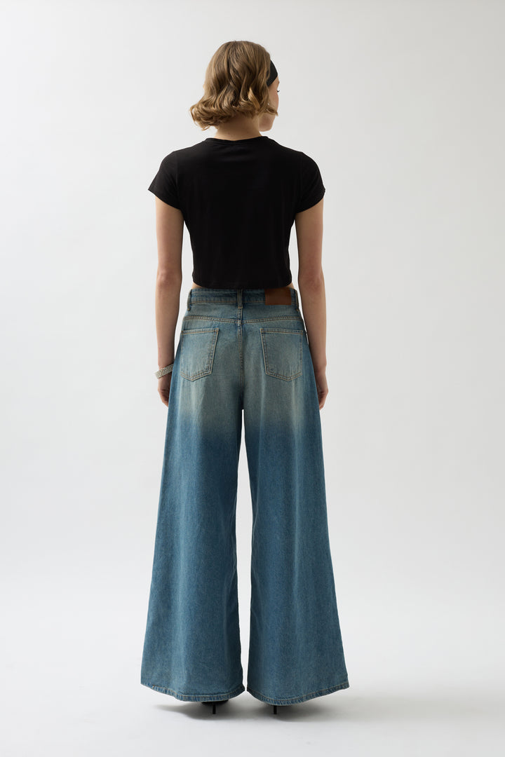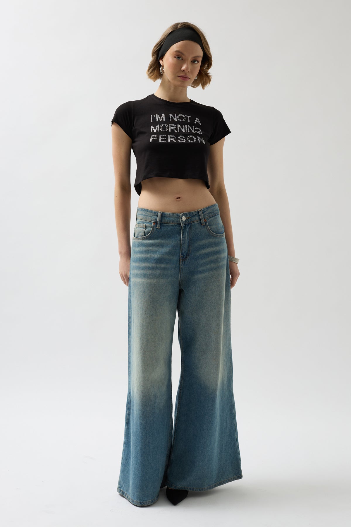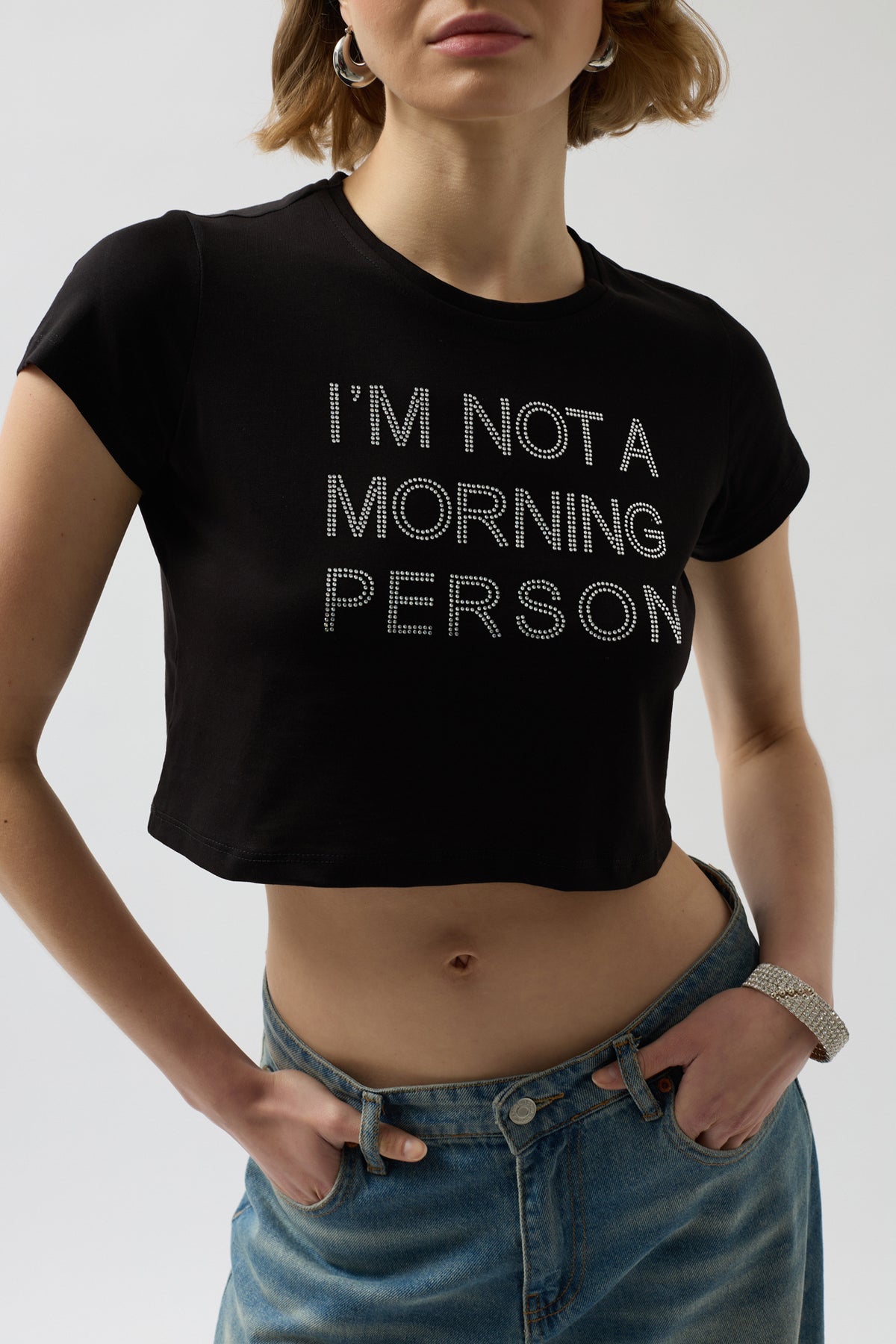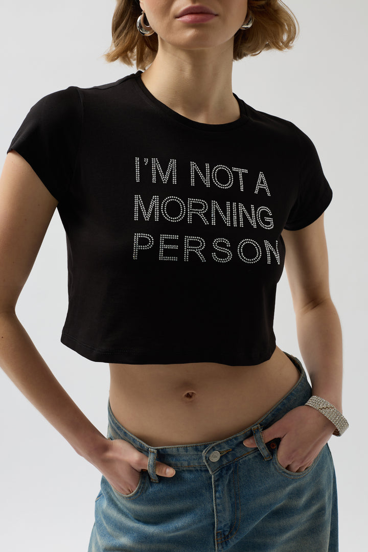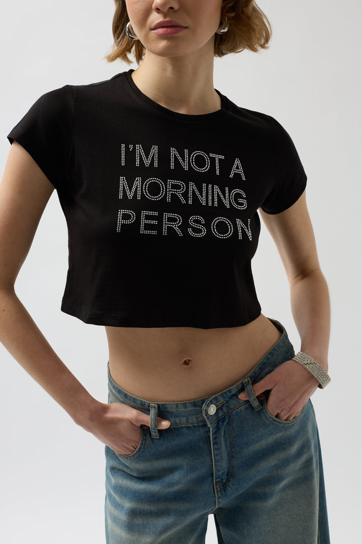 Taş Detay Siyah Crop T-Shirt