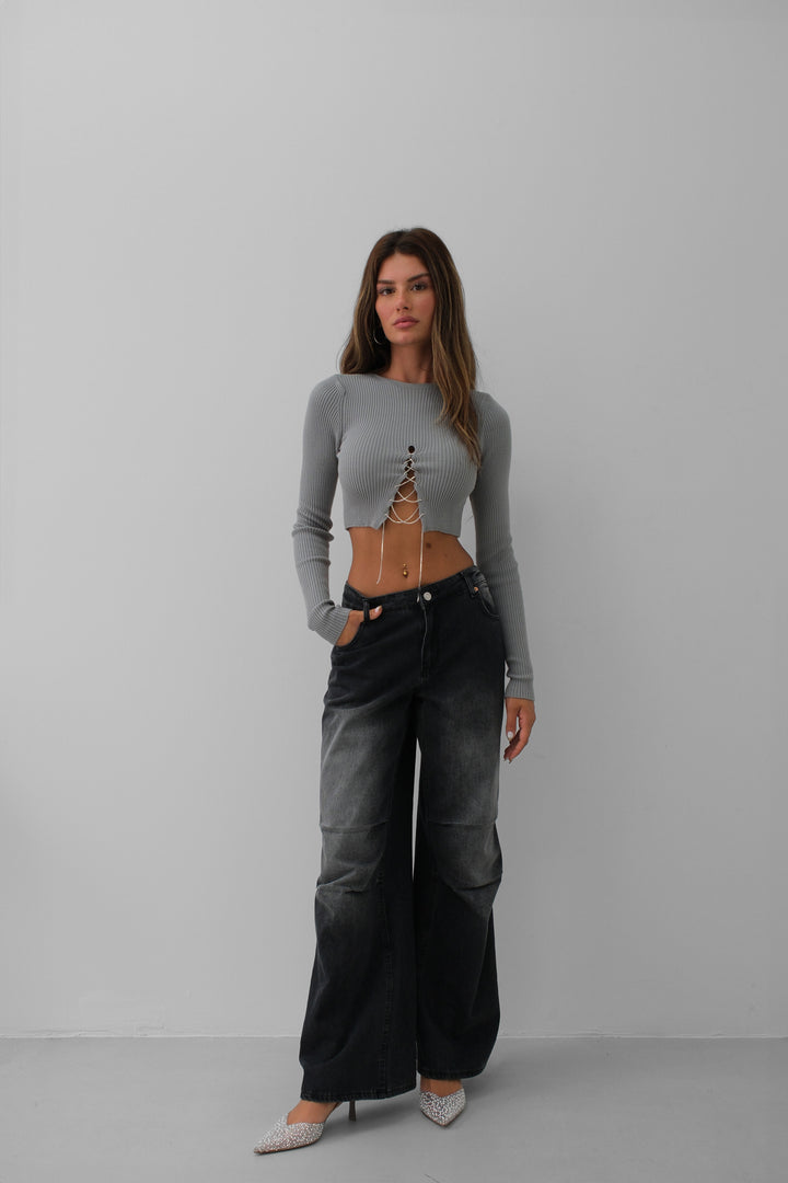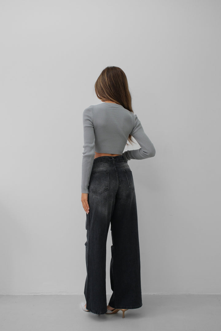 Taş Detay Triko Yaka Gri Crop Bluz