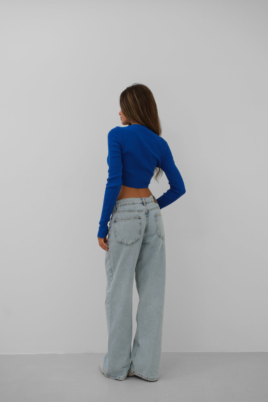 Taş Detay Triko Yaka Mavi Crop Bluz