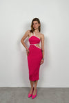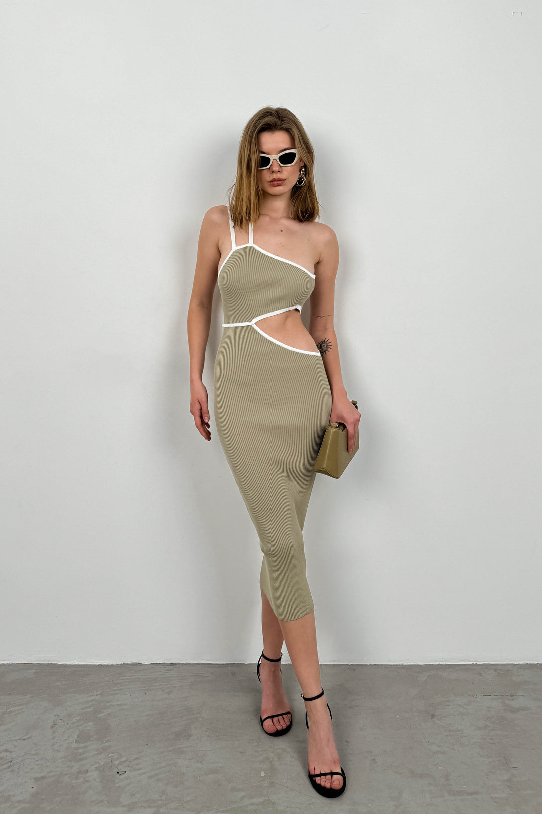 Tek Omuz Çift Askı, Karın Dekolteli, Asimetrik Görünümlü, Triko Örgü, Midi Boy, Slim Fit, Yırtmaçlı Elbise