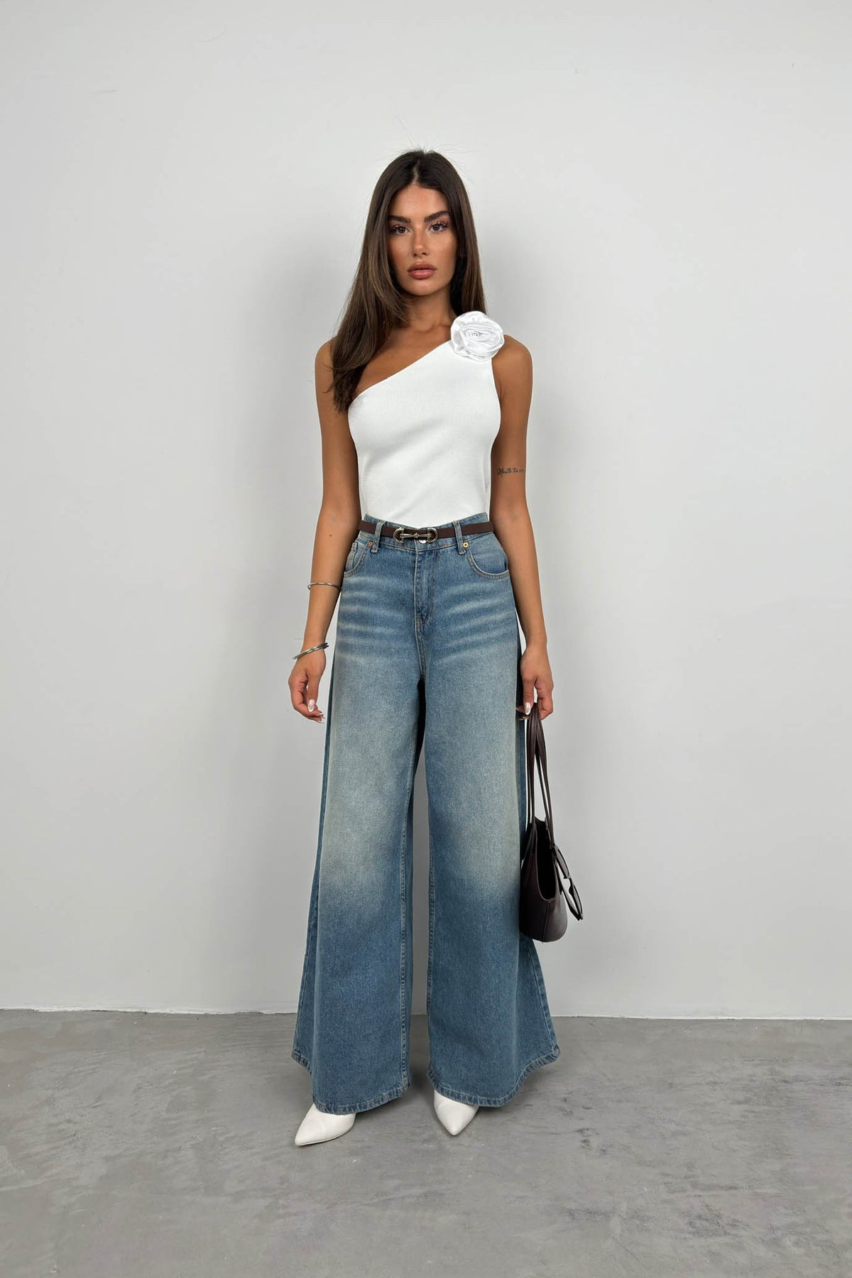 Tek Omuz, Triko Örgü, Çıkarılabilir Çiçek Aksesuarlı Bluz