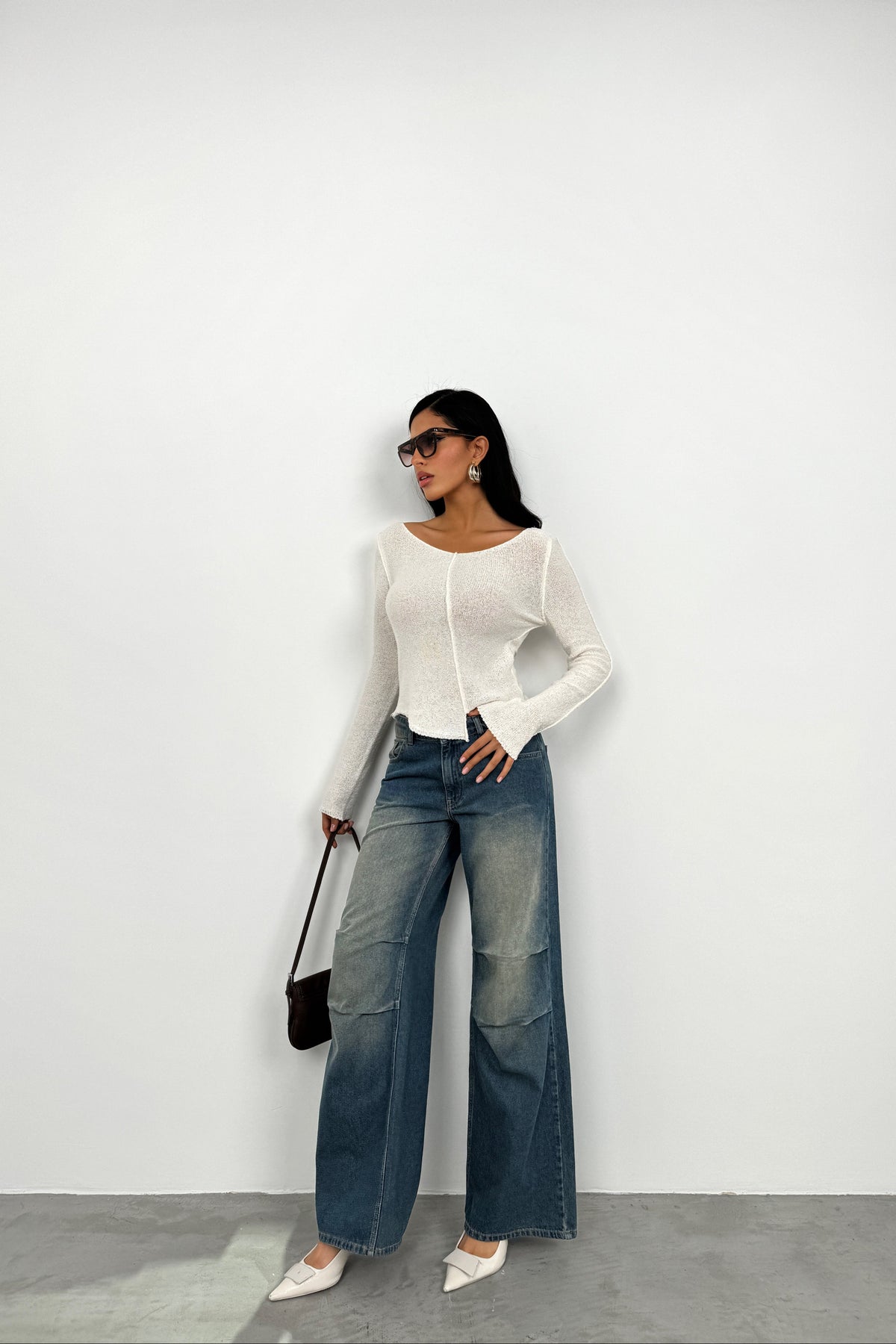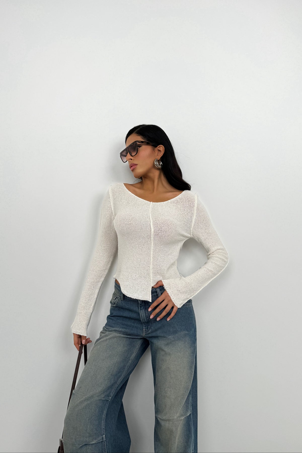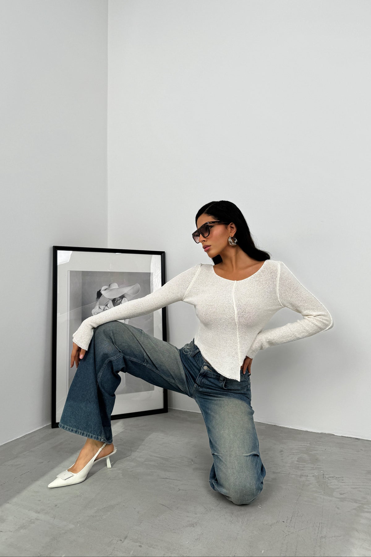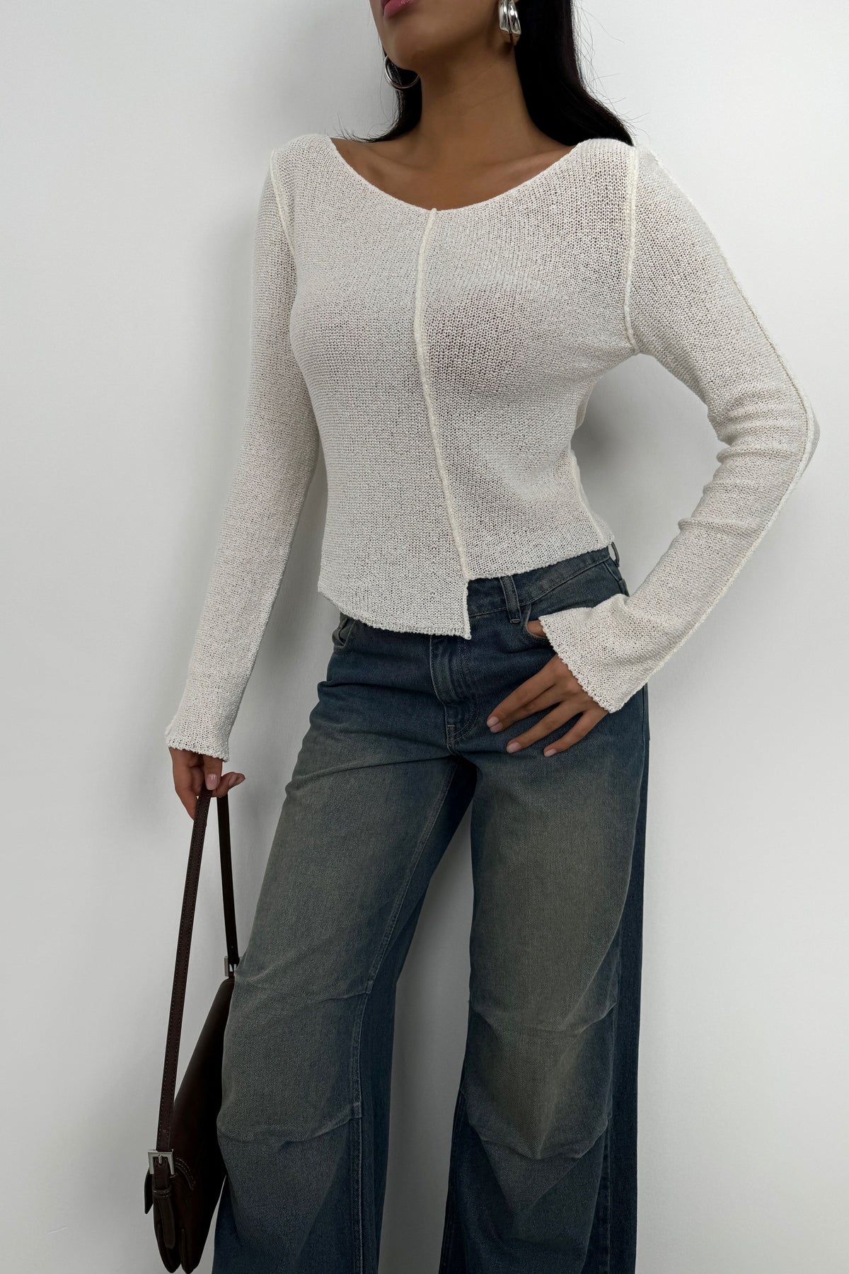 Ters Dikiş Detaylı, Uzun Kollu, Kayık Yaka, Normal Boy, Triko Bluz