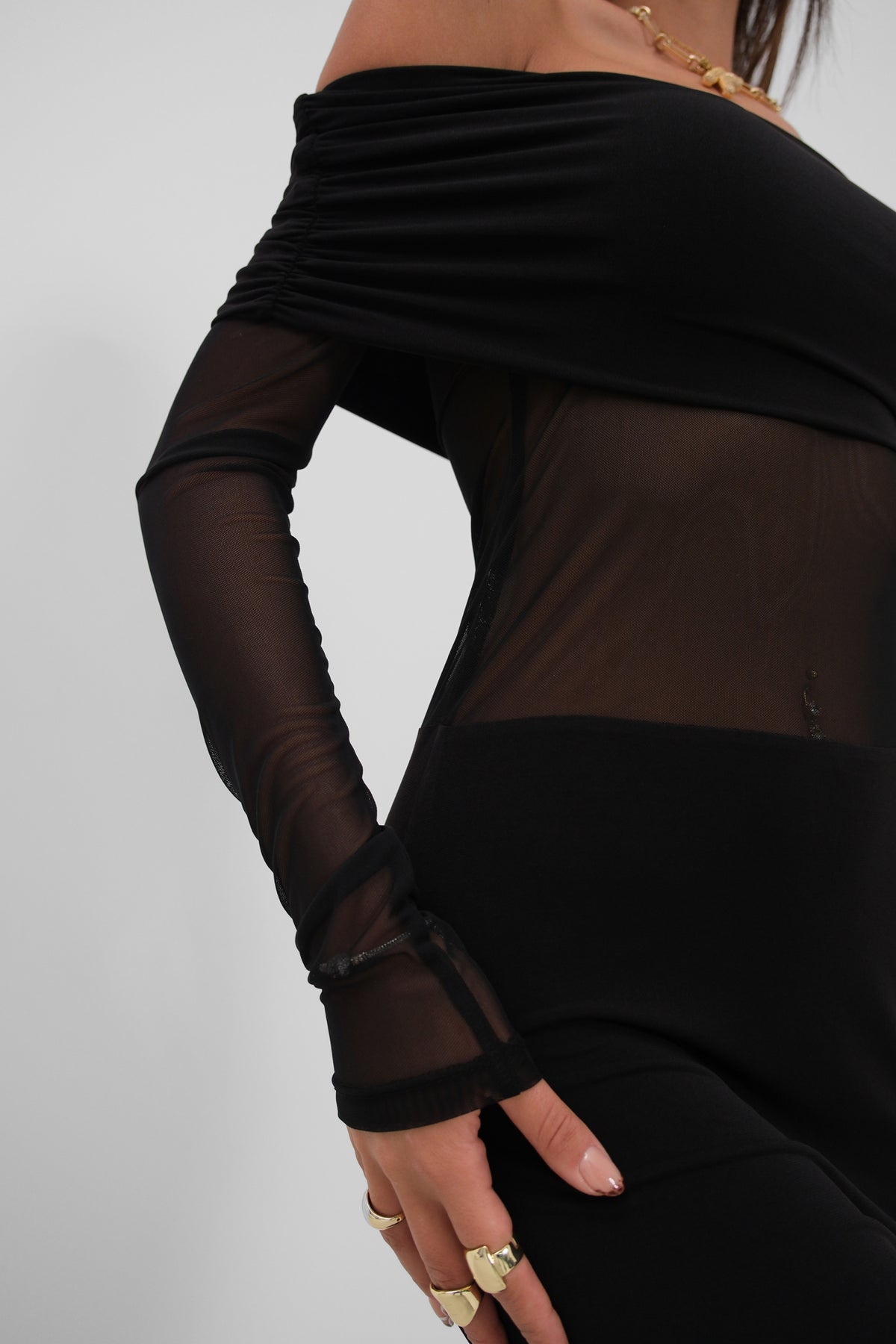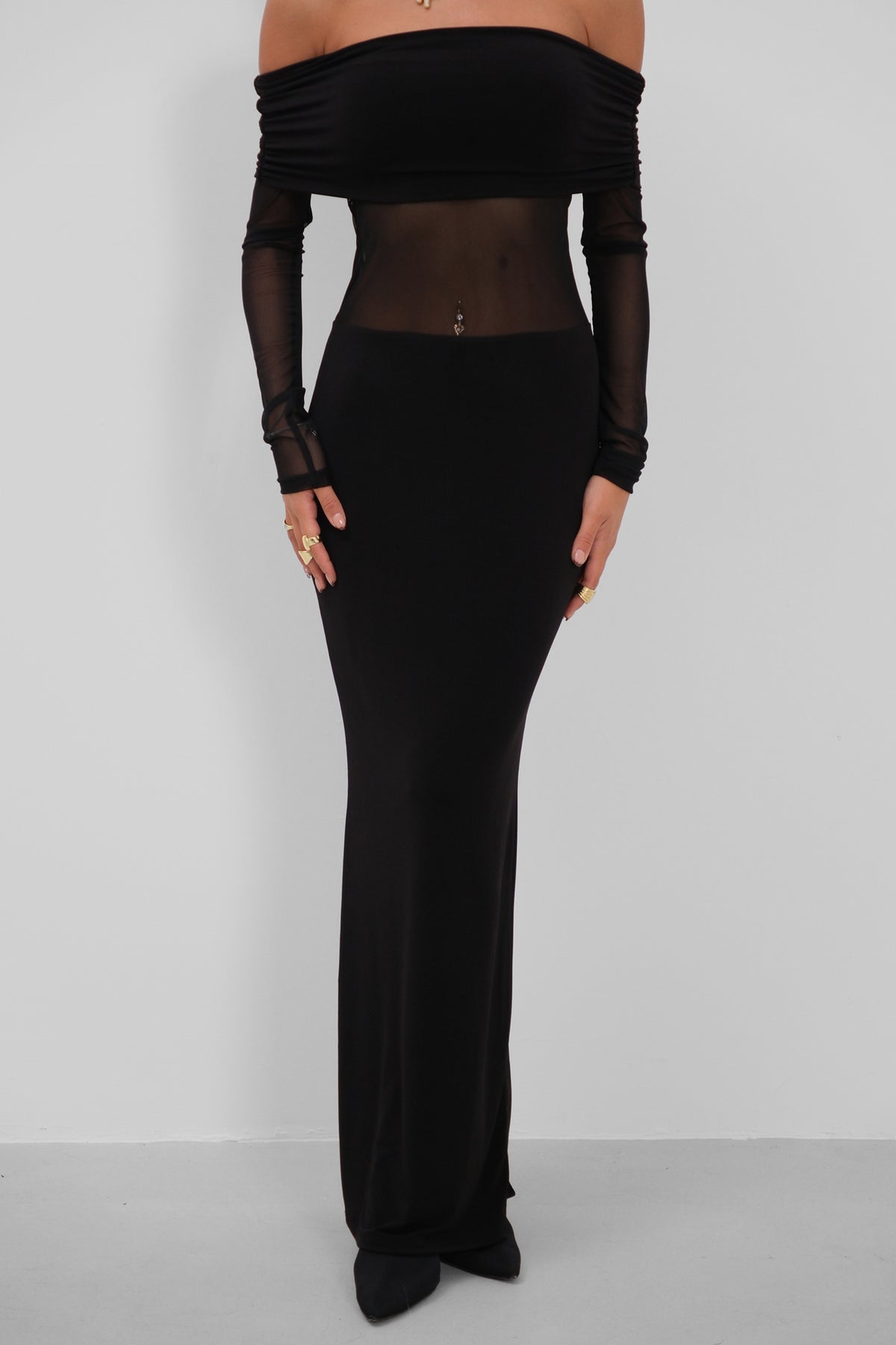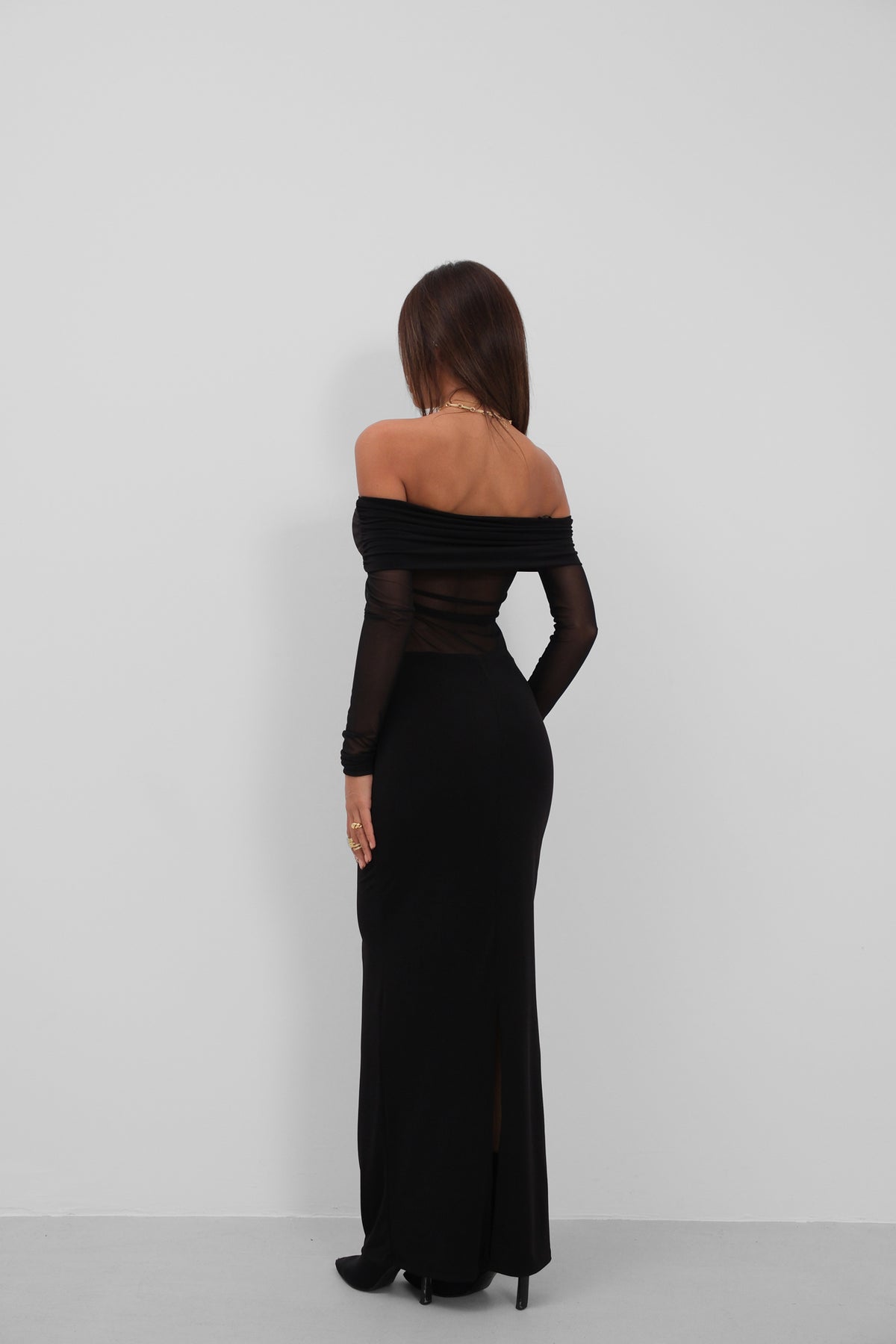 Transparan Detaylı Staplez Maxi Siyah Elbise