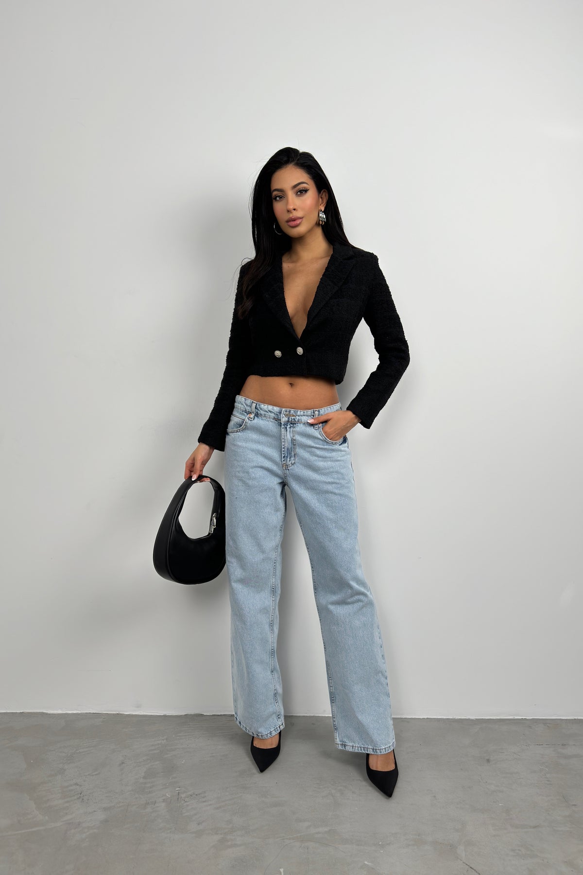 Tüvit Kumaş, Gold Düğmeli, Crop Blazer Ceket, Katlanmış Kenarlı, Uzun Kollu, Katlı Yaka Blazer, Önü Düğmeli Kruvaze Tasarımlı